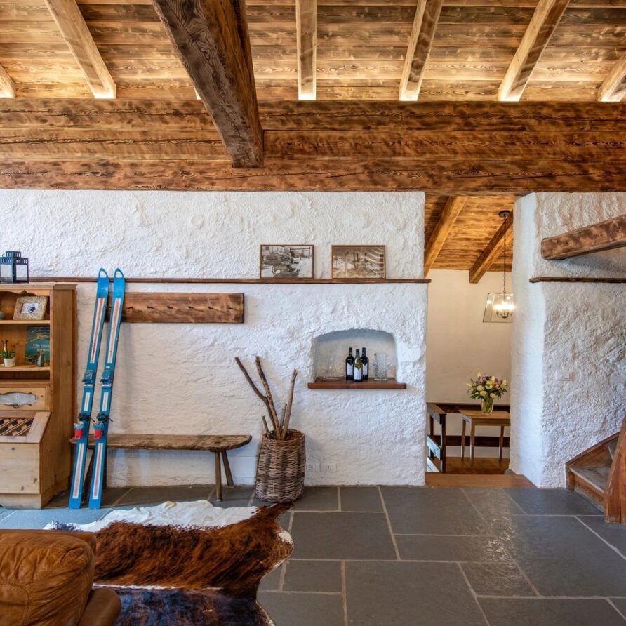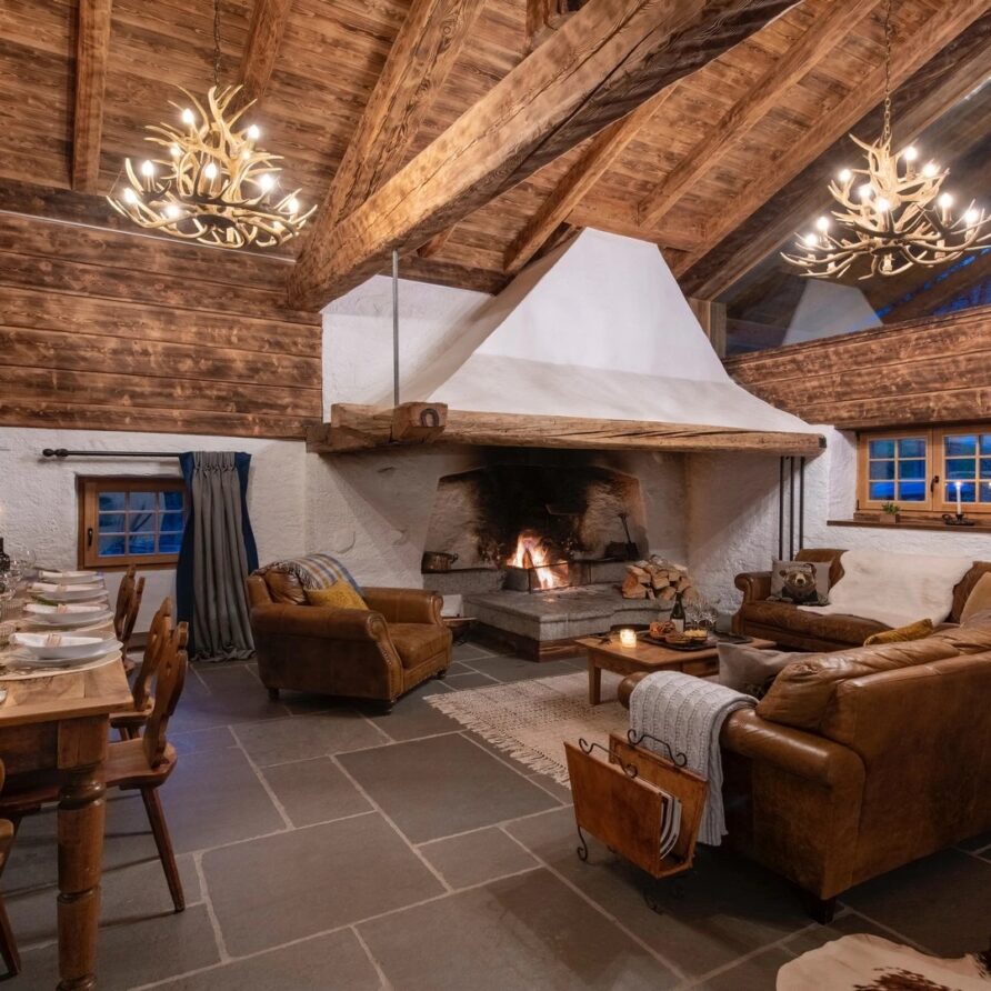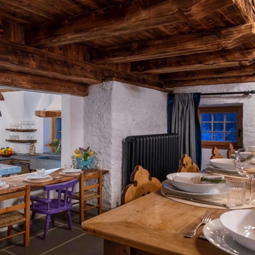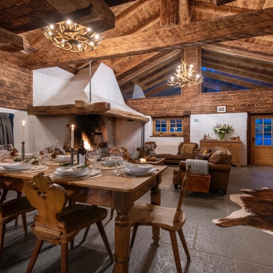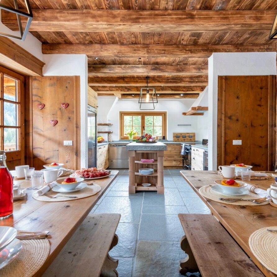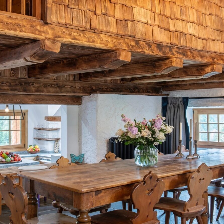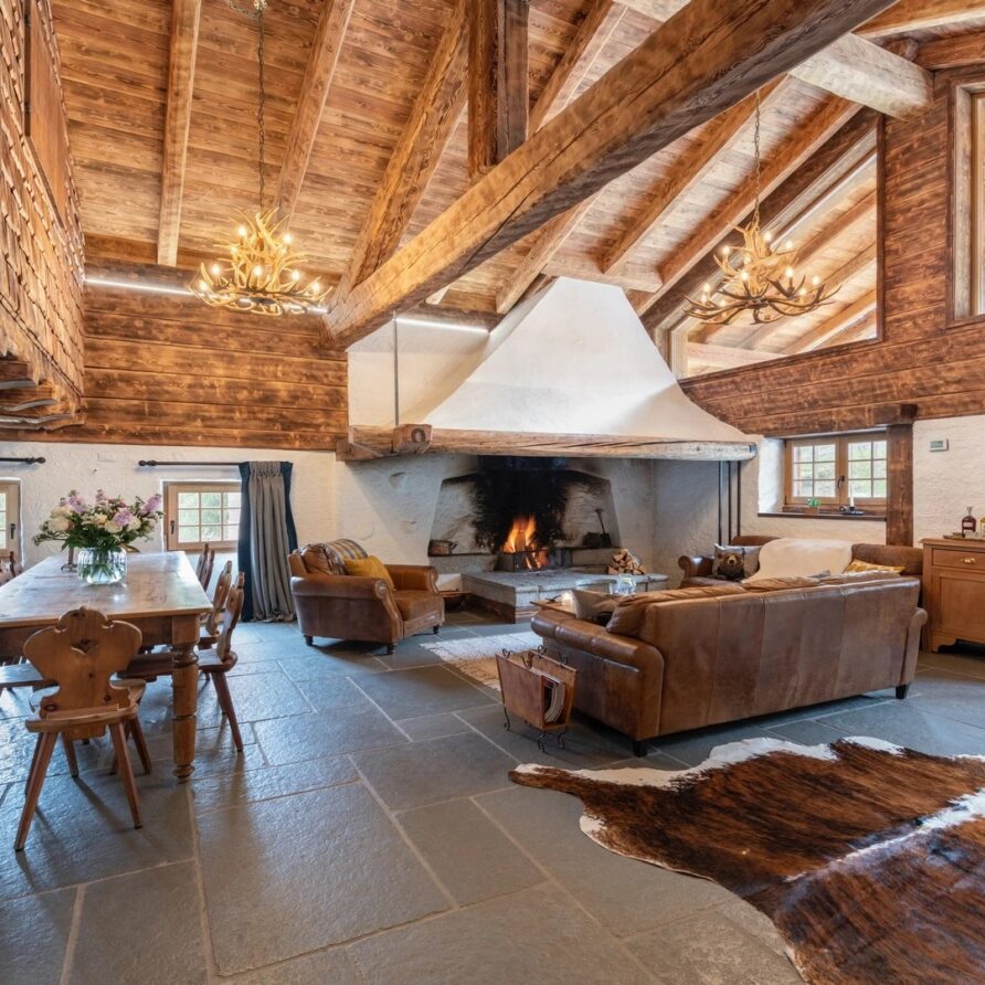 This chalet from Madonna di Campiglio provides a perfect blend of traditional charm and luxury, ideal for larger groups seeking an unforgettable ski holiday in the Dolomites. With giant larch beams, roaring fires, and granite stones, it creates the perfect holiday home with a warm and inviting atmosphere. The centerpiece of the chalet is the living room where a vast fireplace creates a focus point to gather round and enjoy an pre-dinner cocktail on comfy sofas after a skiing day. For dinner, head to the long dining table where evening meals will be served beneath the giant larch timbers and granite stones of the house.