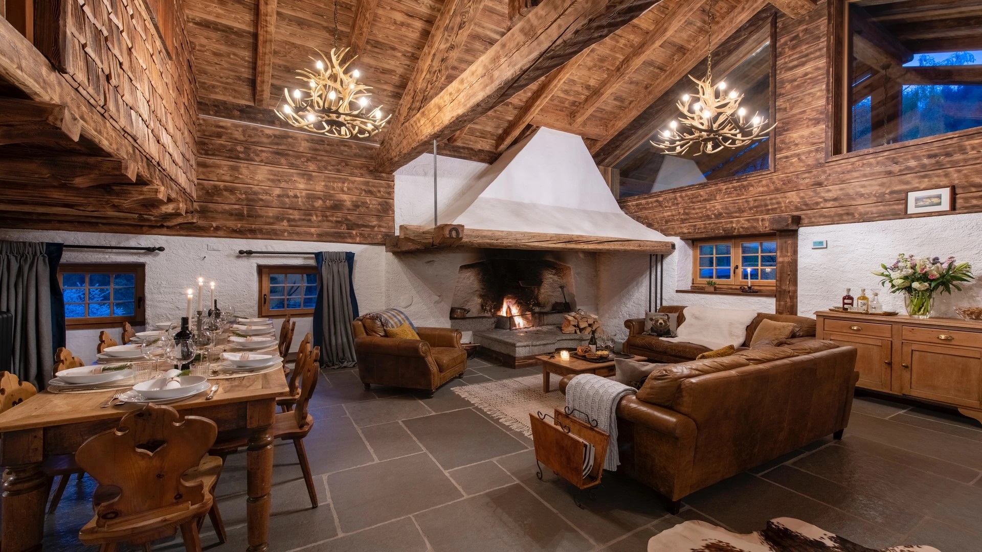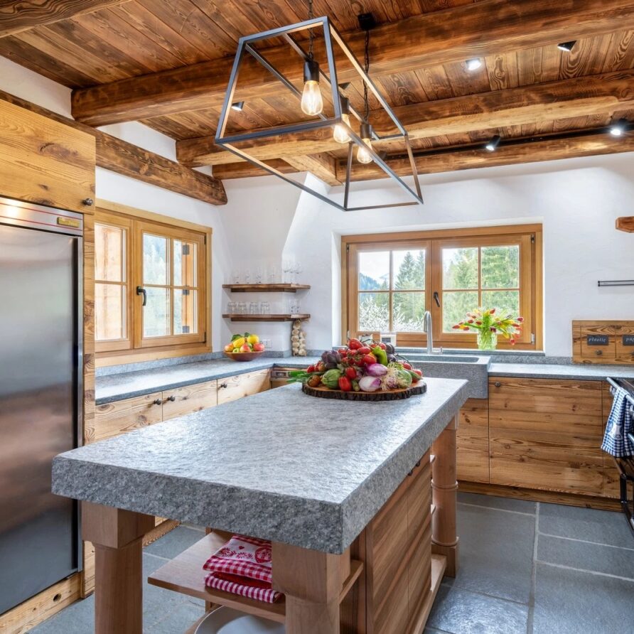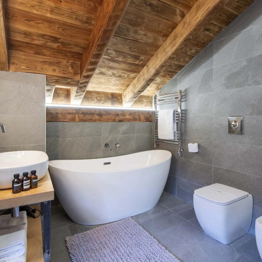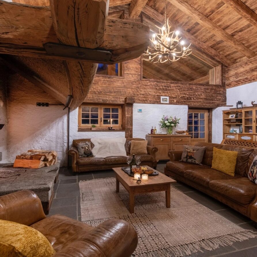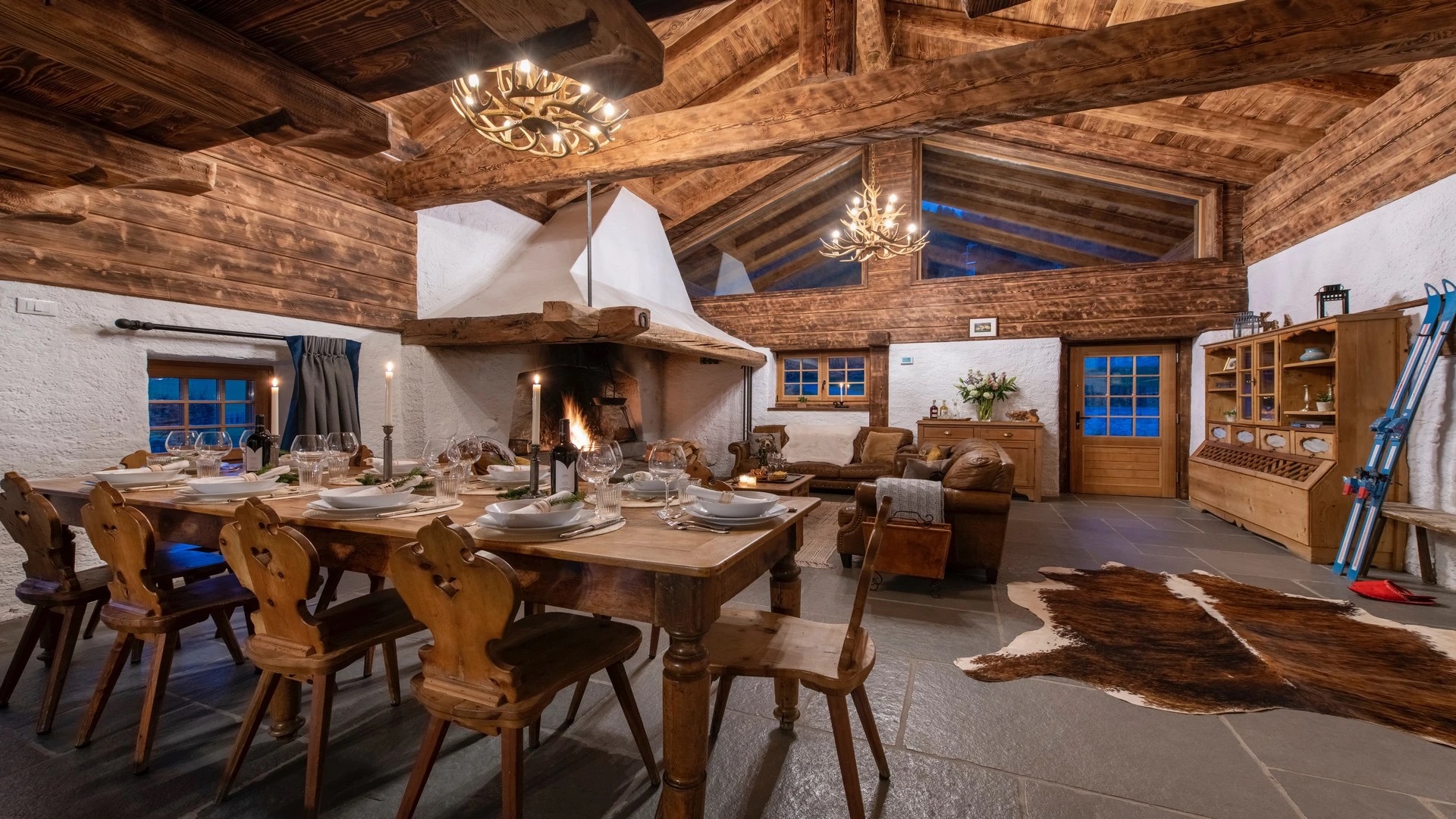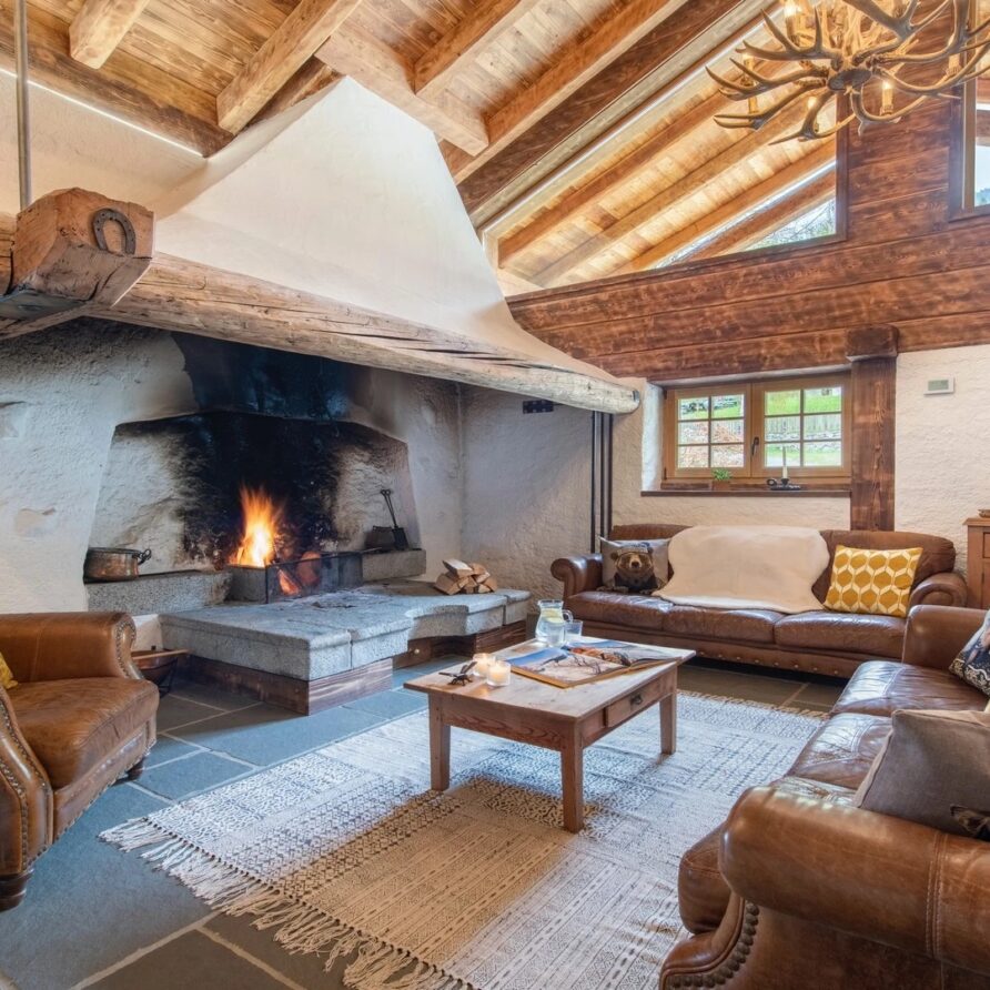 This chalet from Madonna di Campiglio provides a perfect blend of traditional charm and luxury, ideal for larger groups seeking an unforgettable ski holiday in the Dolomites. With giant larch beams, roaring fires, and granite stones, it creates the perfect holiday home with a warm and inviting atmosphere. The centerpiece of the chalet is the living room where a vast fireplace creates a focus point to gather round and enjoy an pre-dinner cocktail on comfy sofas after a skiing day. For dinner, head to the long dining table where evening meals will be served beneath the giant larch timbers and granite stones of the house.