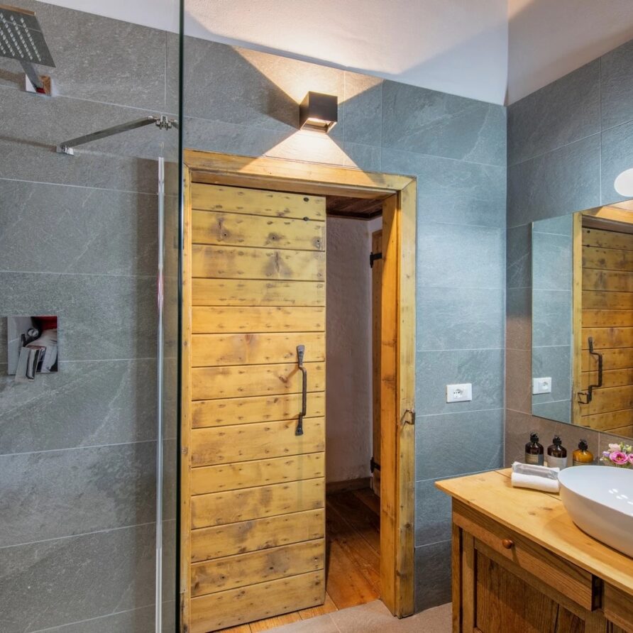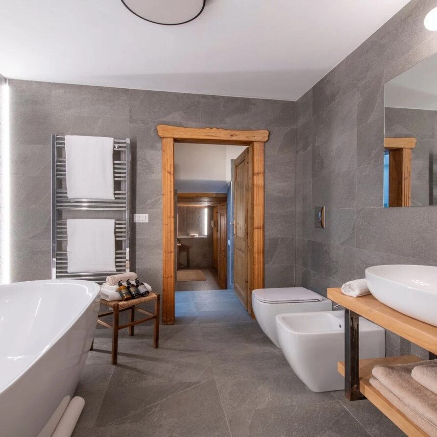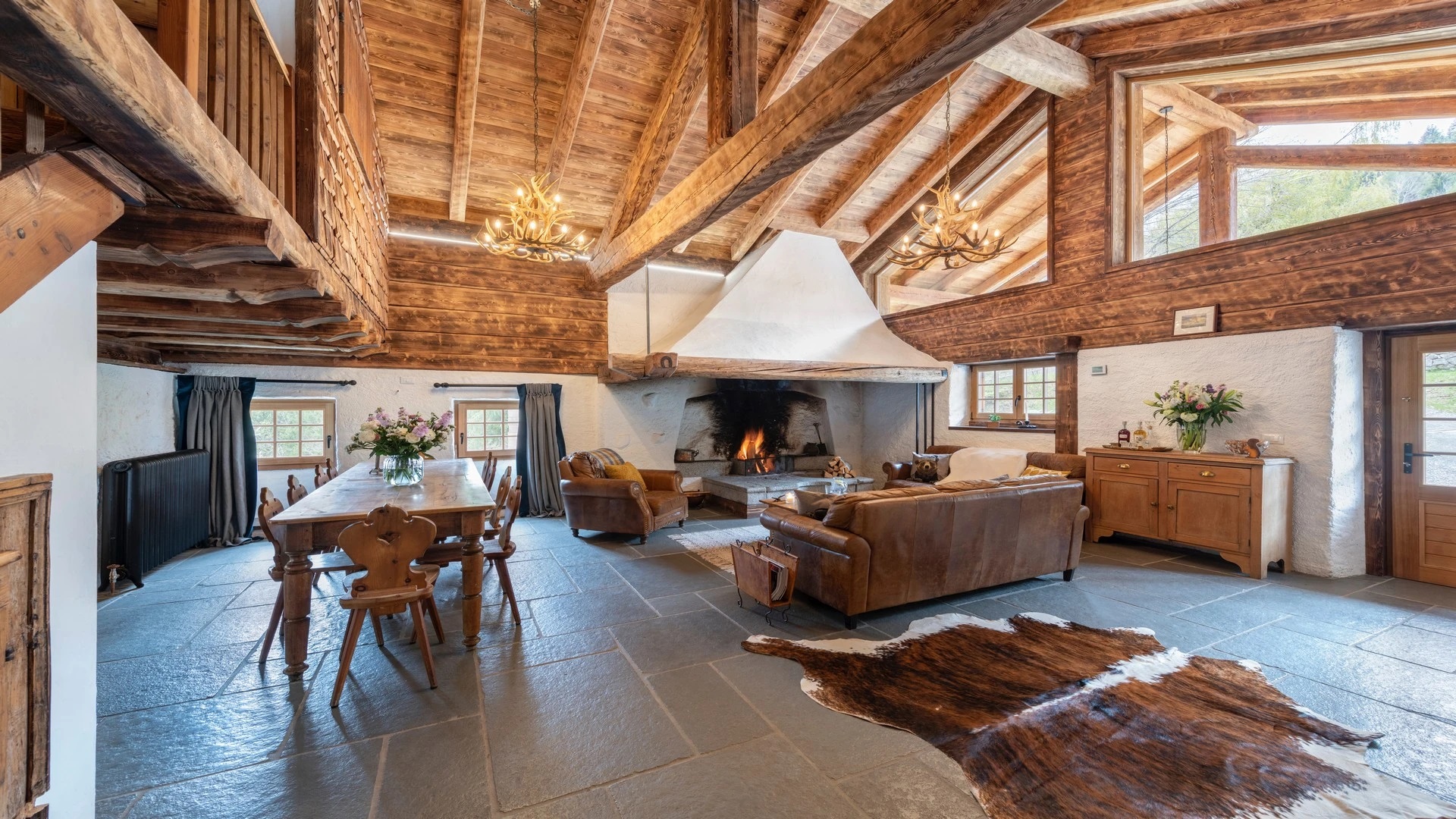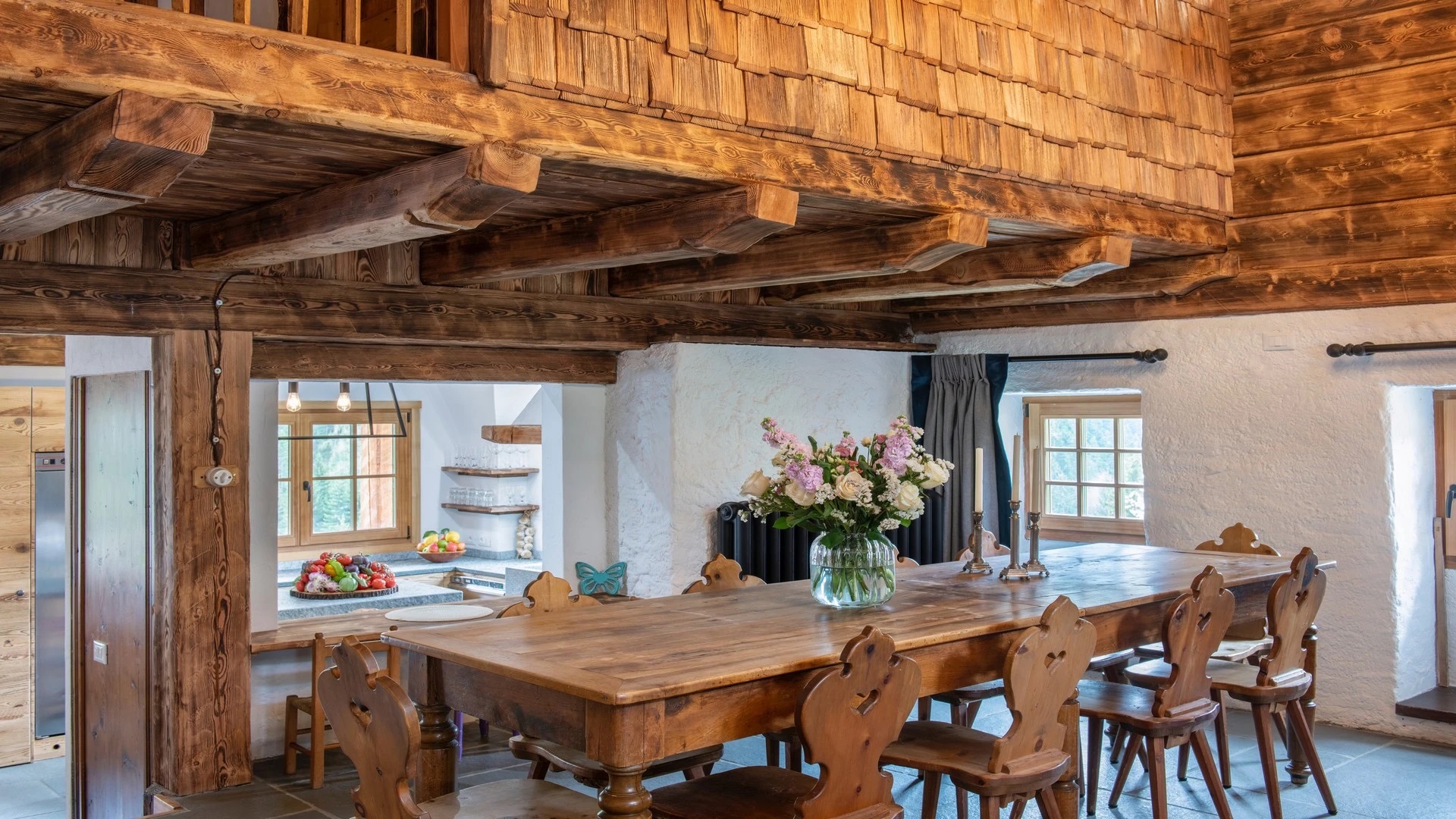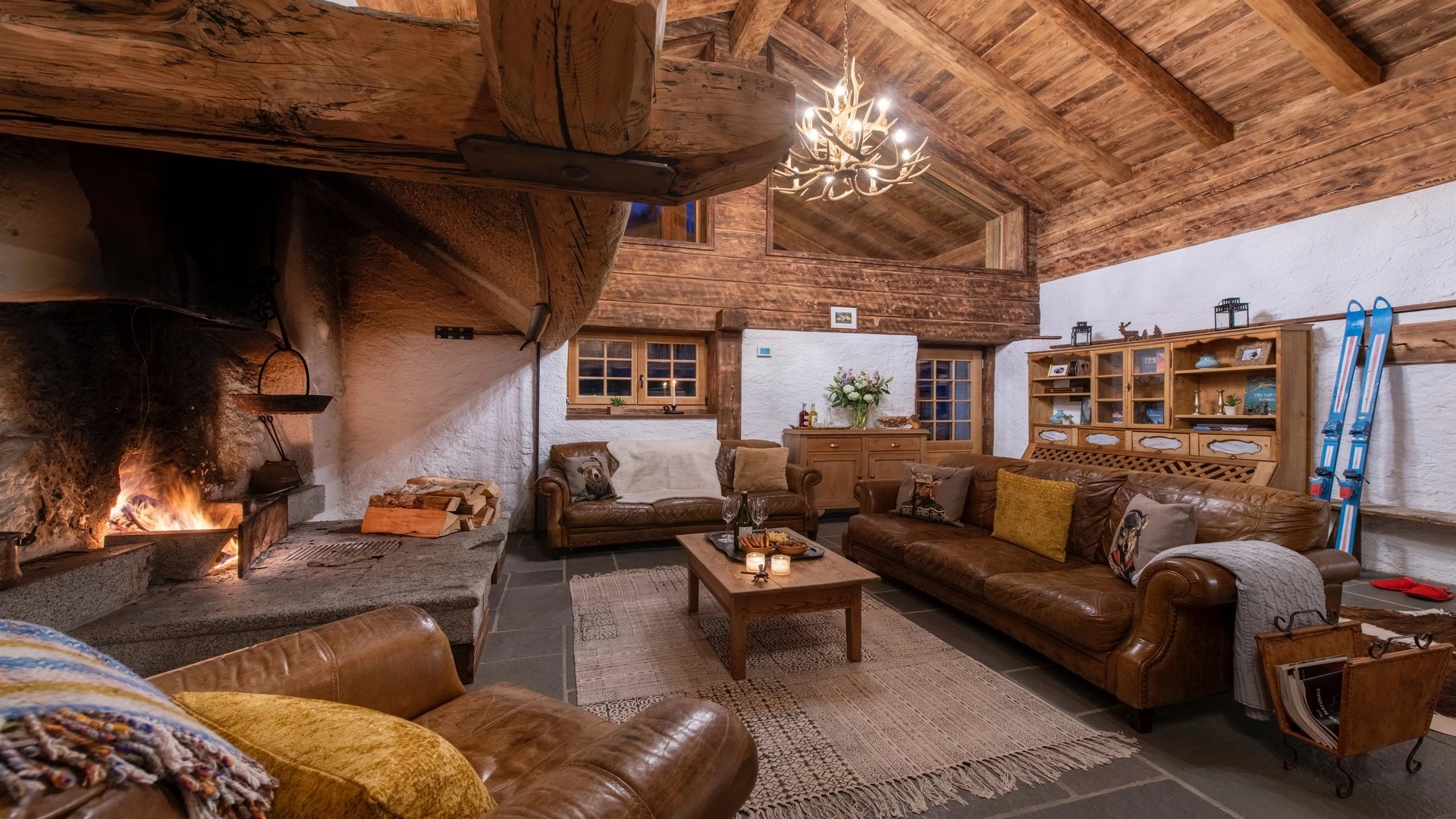 This chalet from Madonna di Campiglio provides a perfect blend of traditional charm and luxury, ideal for larger groups seeking an unforgettable ski holiday in the Dolomites. With giant larch beams, roaring fires, and granite stones, it creates the perfect holiday home with a warm and inviting atmosphere. The centerpiece of the chalet is the living room where a vast fireplace creates a focus point to gather round and enjoy an pre-dinner cocktail on comfy sofas after a skiing day. For dinner, head to the long dining table where evening meals will be served beneath the giant larch timbers and granite stones of the house.