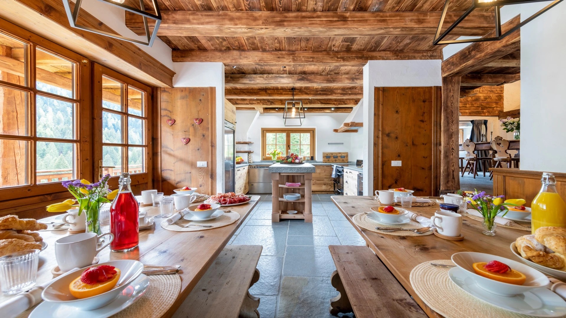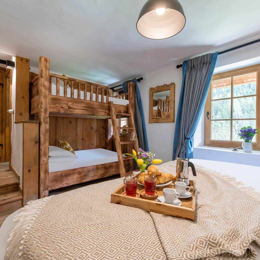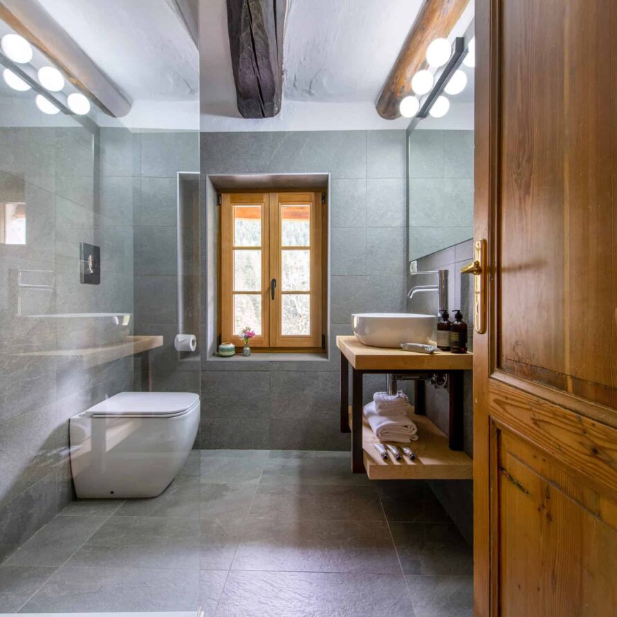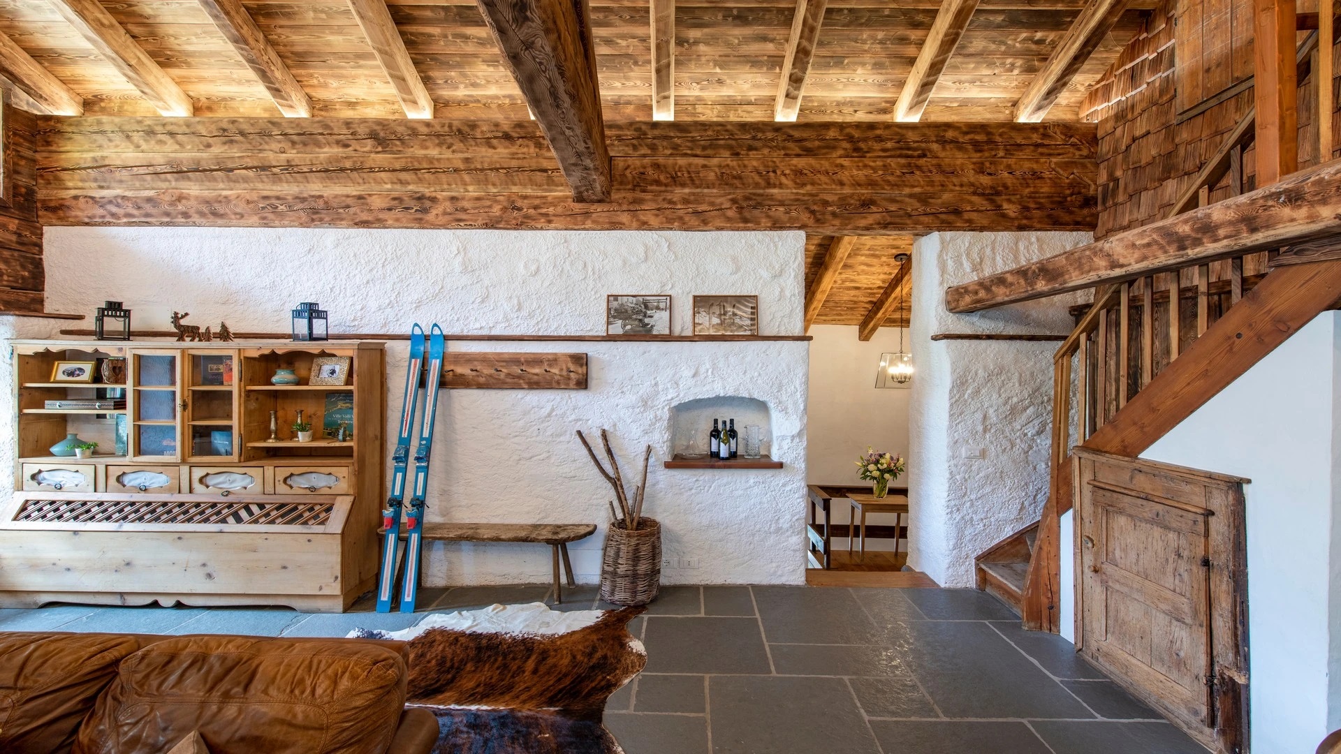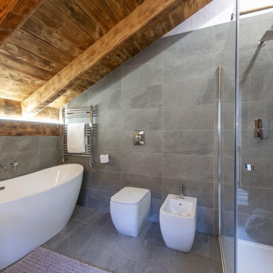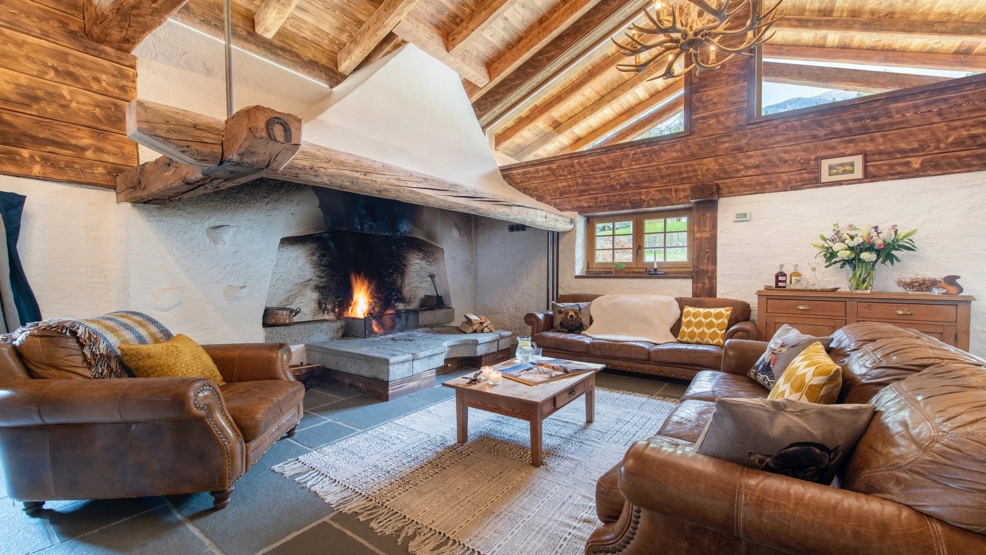 This chalet from Madonna di Campiglio provides a perfect blend of traditional charm and luxury, ideal for larger groups seeking an unforgettable ski holiday in the Dolomites. With giant larch beams, roaring fires, and granite stones, it creates the perfect holiday home with a warm and inviting atmosphere. The centerpiece of the chalet is the living room where a vast fireplace creates a focus point to gather round and enjoy an pre-dinner cocktail on comfy sofas after a skiing day. For dinner, head to the long dining table where evening meals will be served beneath the giant larch timbers and granite stones of the house.