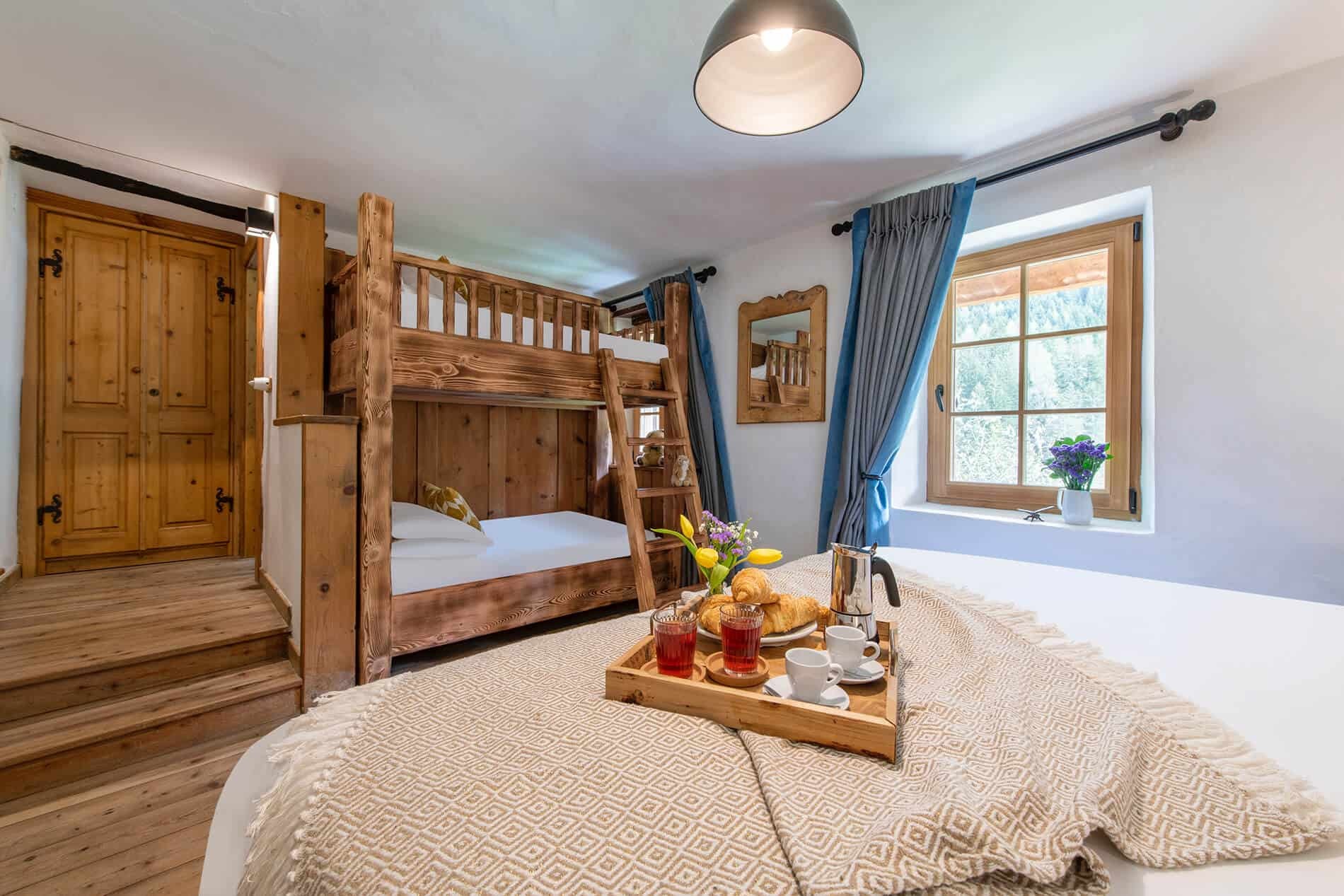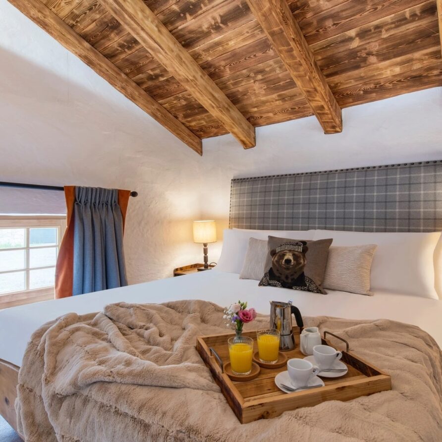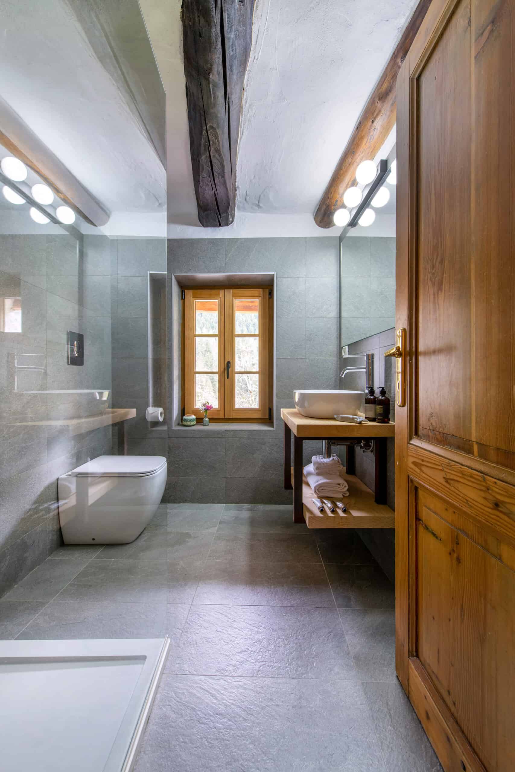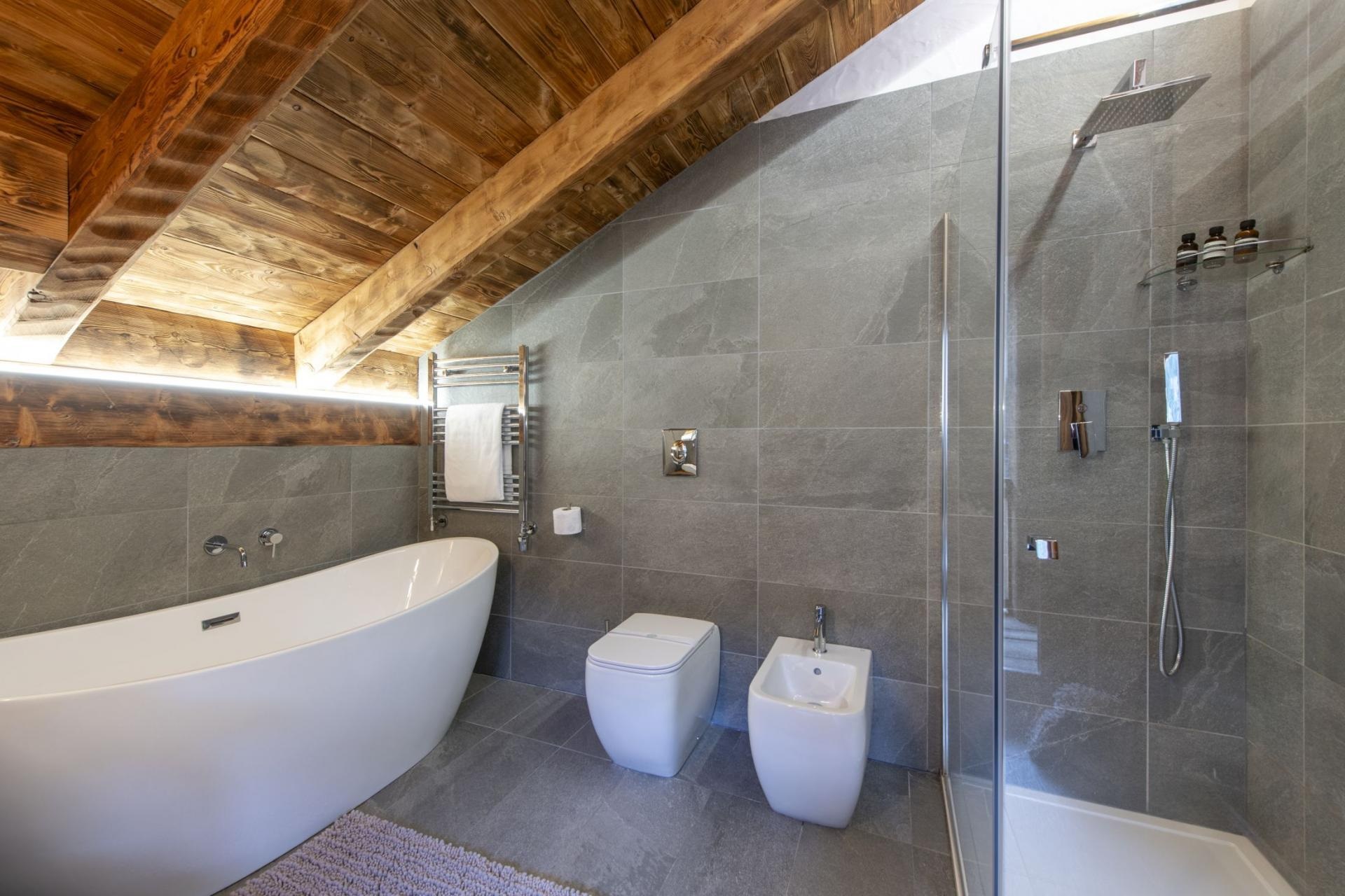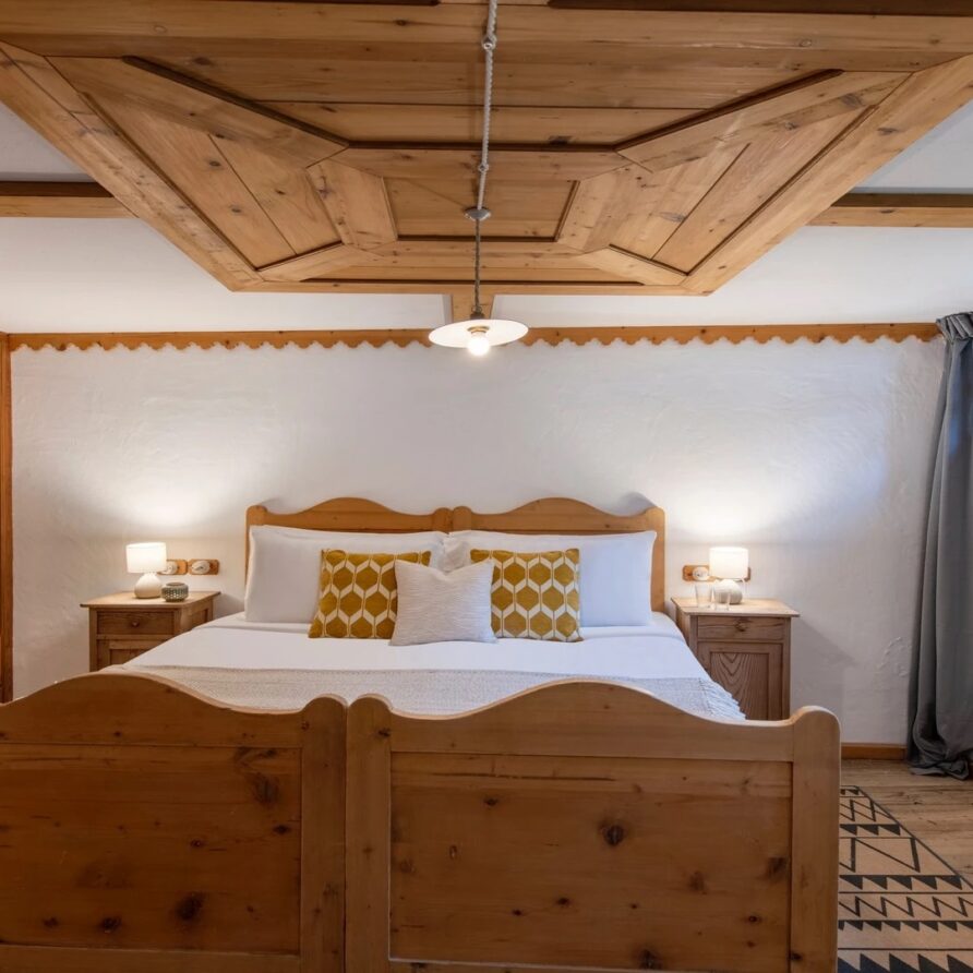 This chalet from Madonna di Campiglio provides a perfect blend of traditional charm and luxury, ideal for larger groups seeking an unforgettable ski holiday in the Dolomites. With giant larch beams, roaring fires, and granite stones, it creates the perfect holiday home with a warm and inviting atmosphere. The centerpiece of the chalet is the living room where a vast fireplace creates a focus point to gather round and enjoy an pre-dinner cocktail on comfy sofas after a skiing day. For dinner, head to the long dining table where evening meals will be served beneath the giant larch timbers and granite stones of the house.
