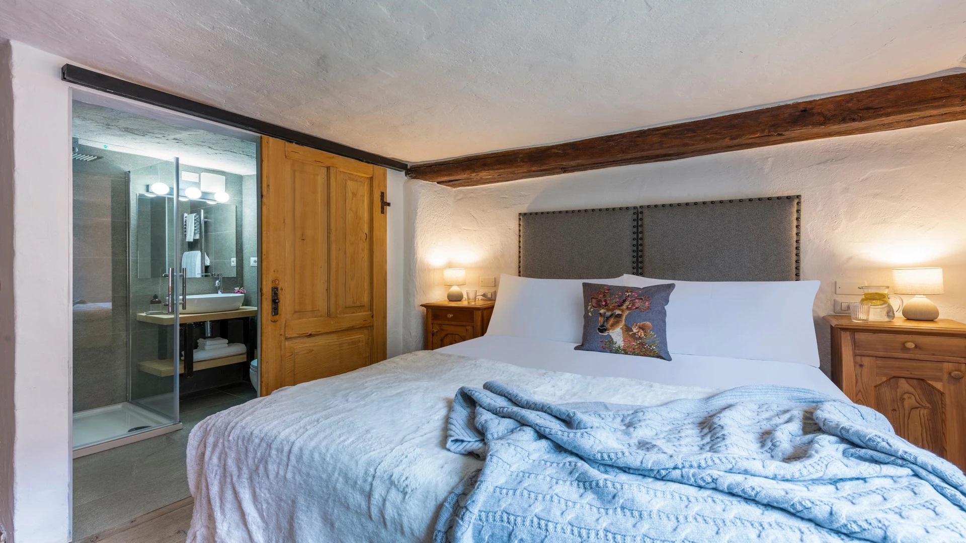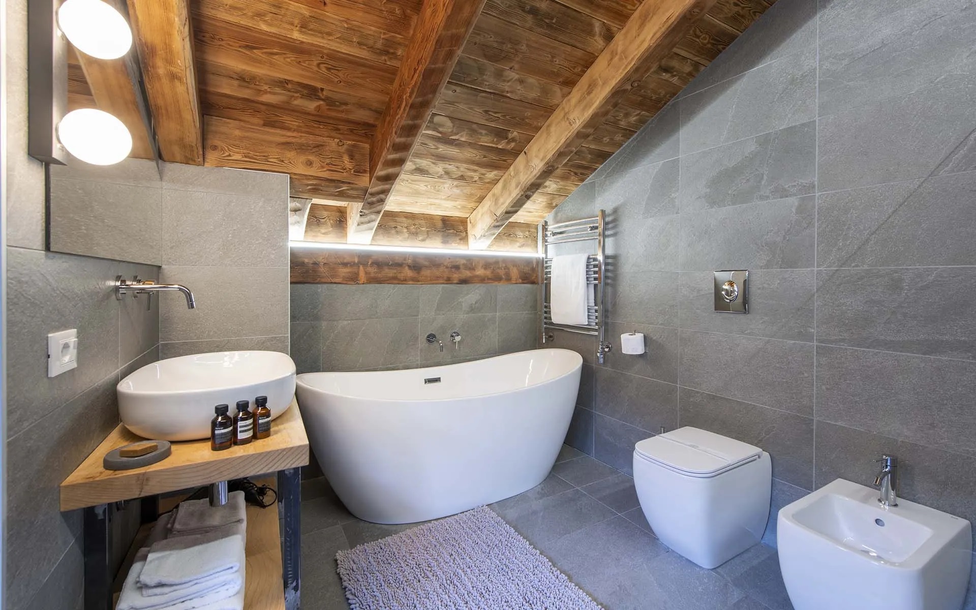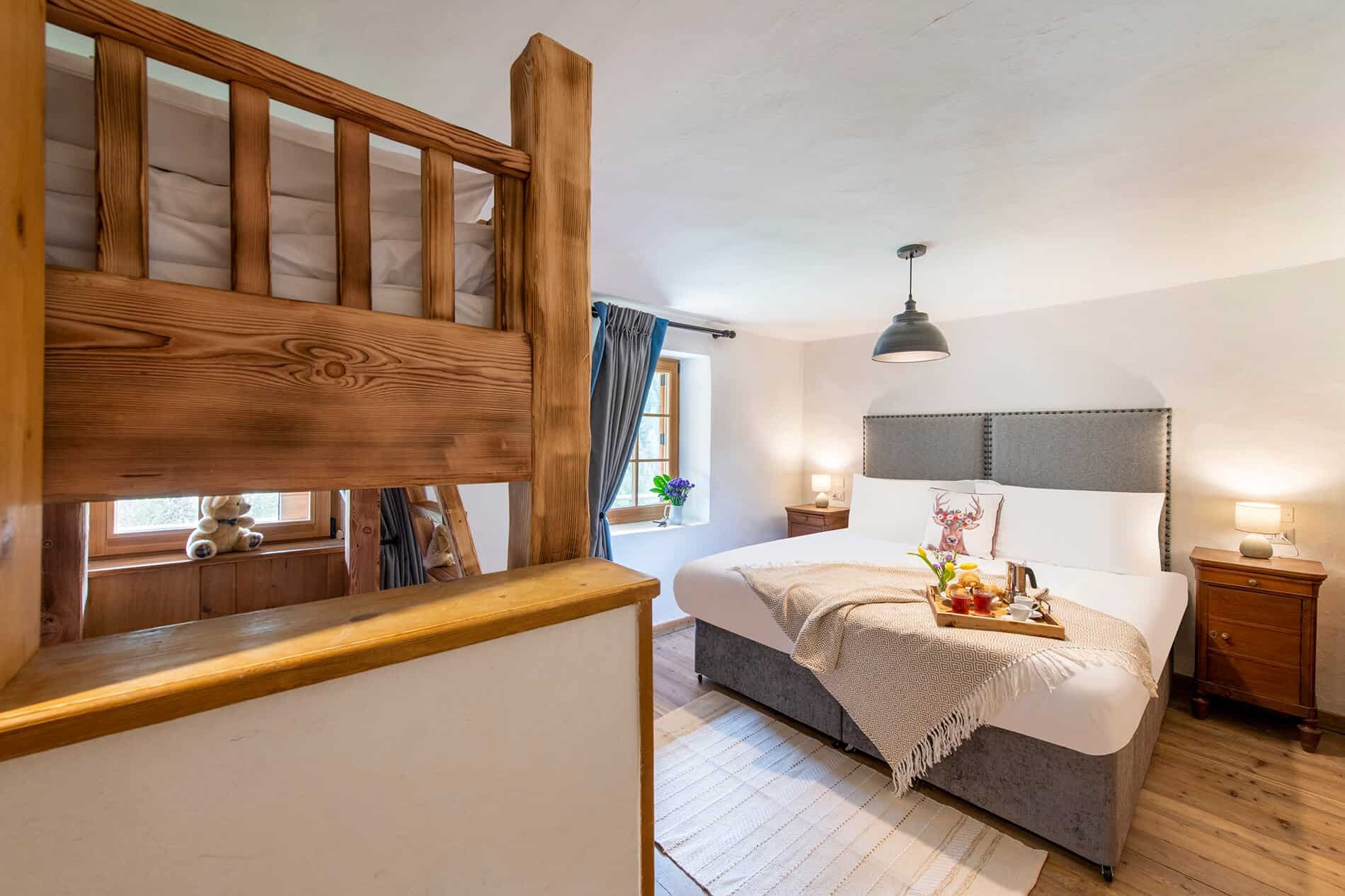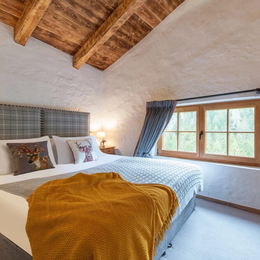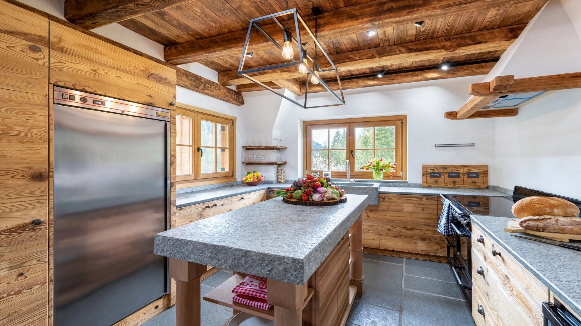 This chalet from Madonna di Campiglio provides a perfect blend of traditional charm and luxury, ideal for larger groups seeking an unforgettable ski holiday in the Dolomites. With giant larch beams, roaring fires, and granite stones, it creates the perfect holiday home with a warm and inviting atmosphere. The centerpiece of the chalet is the living room where a vast fireplace creates a focus point to gather round and enjoy an pre-dinner cocktail on comfy sofas after a skiing day. For dinner, head to the long dining table where evening meals will be served beneath the giant larch timbers and granite stones of the house.
