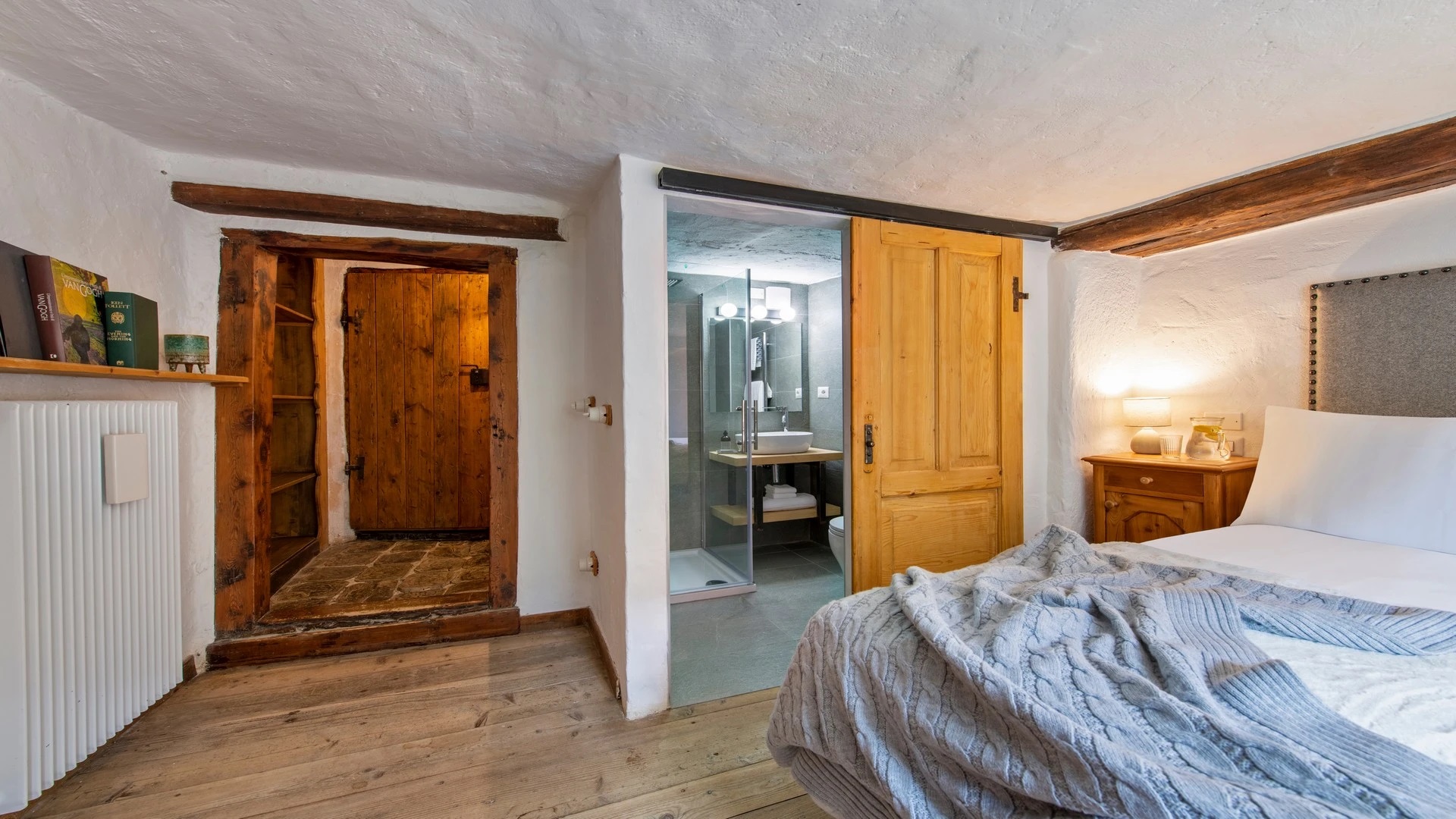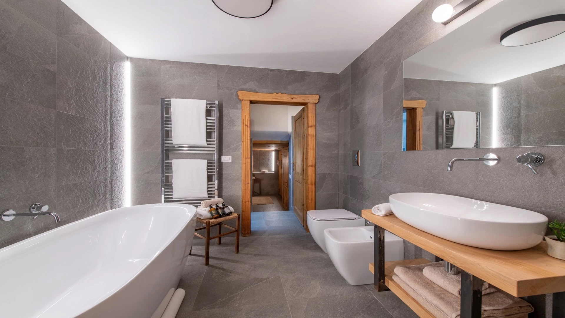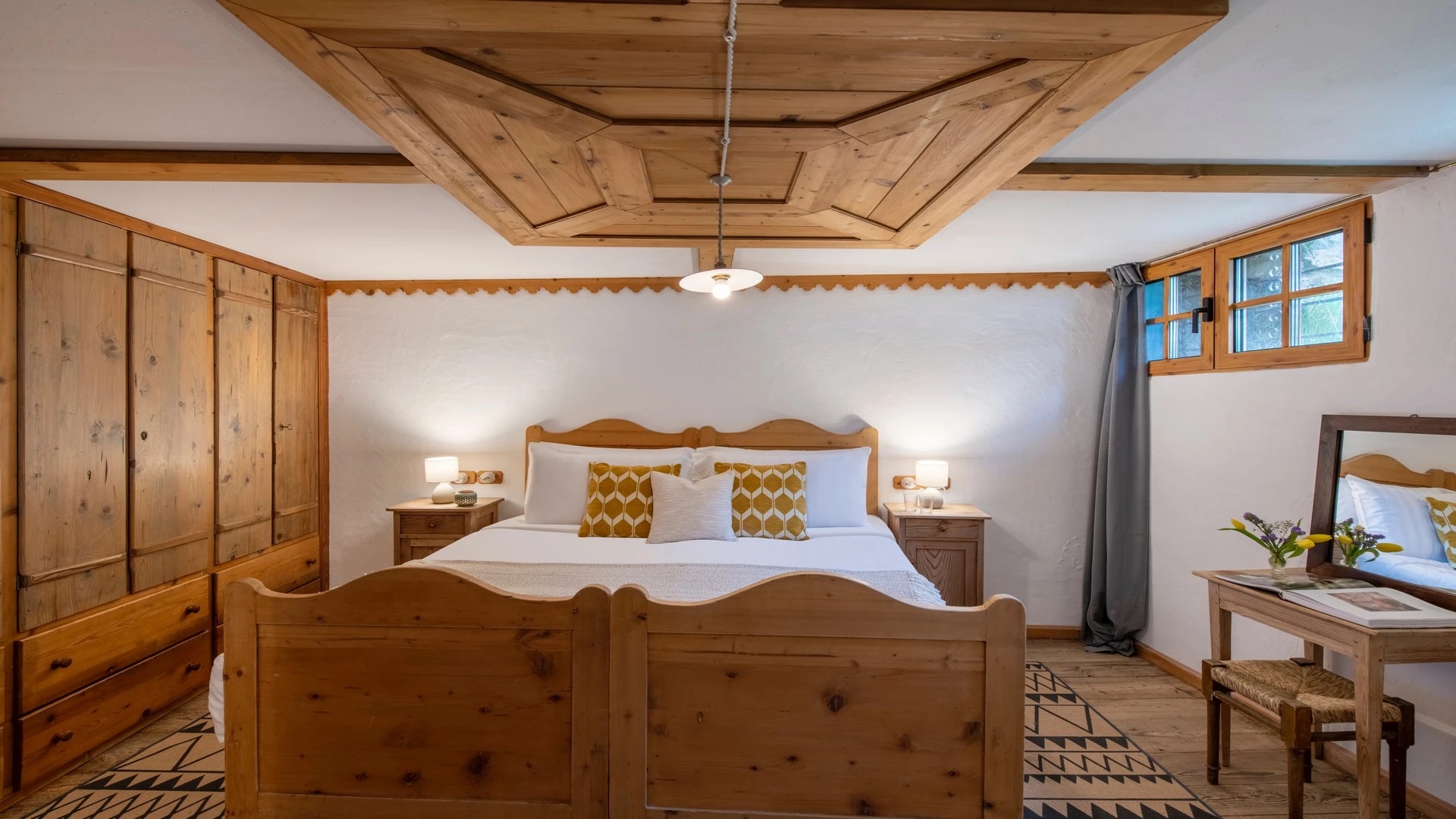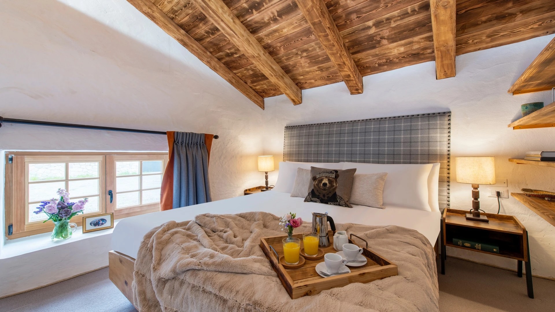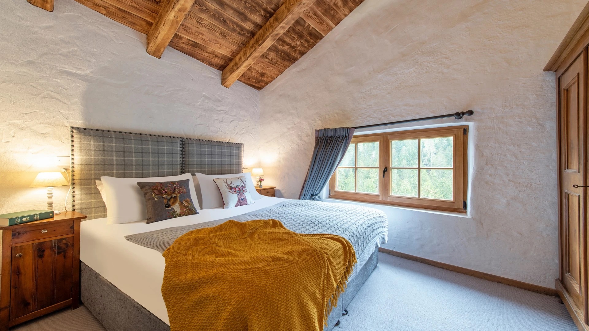 This chalet from Madonna di Campiglio provides a perfect blend of traditional charm and luxury, ideal for larger groups seeking an unforgettable ski holiday in the Dolomites. With giant larch beams, roaring fires, and granite stones, it creates the perfect holiday home with a warm and inviting atmosphere. The centerpiece of the chalet is the living room where a vast fireplace creates a focus point to gather round and enjoy an pre-dinner cocktail on comfy sofas after a skiing day. For dinner, head to the long dining table where evening meals will be served beneath the giant larch timbers and granite stones of the house.