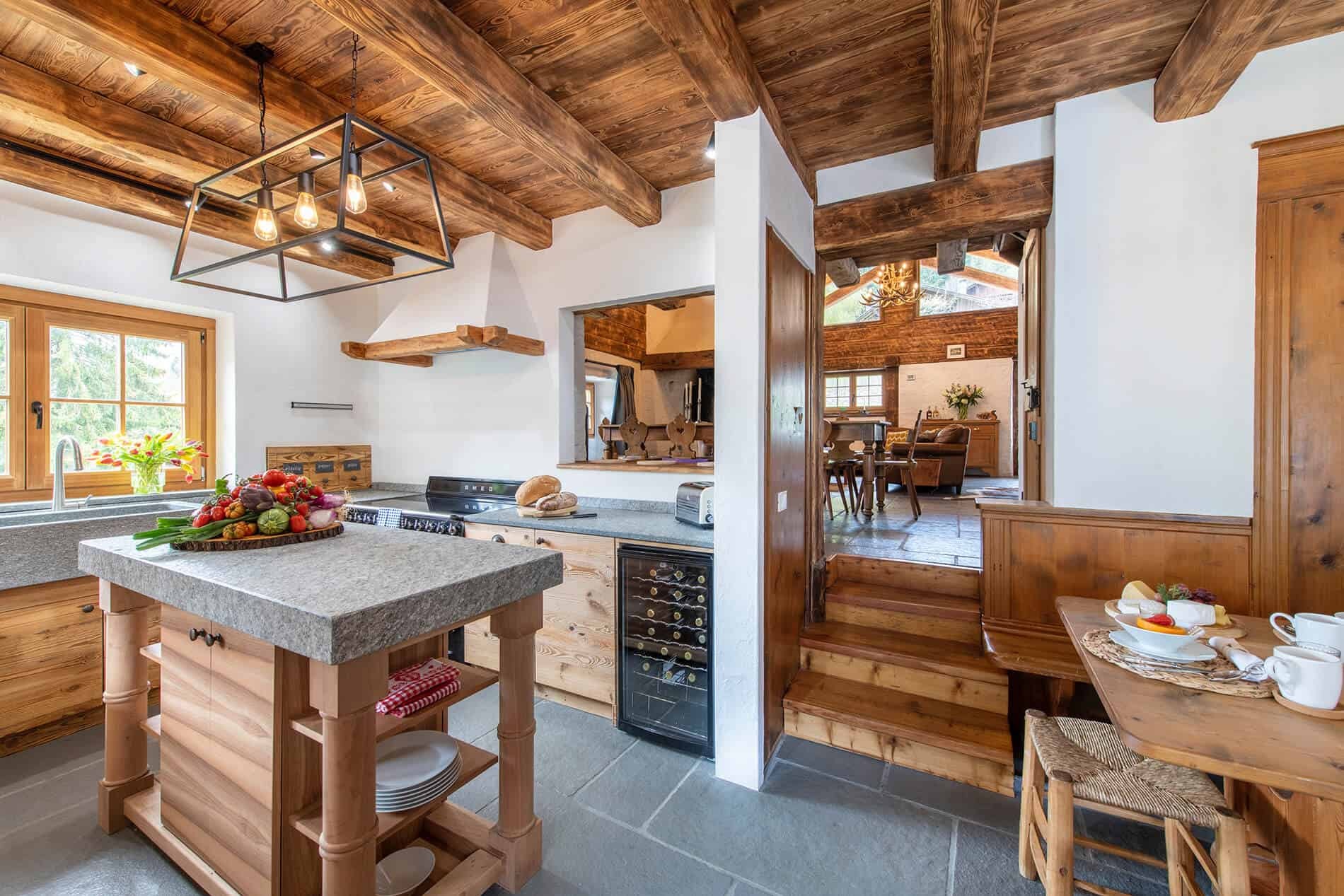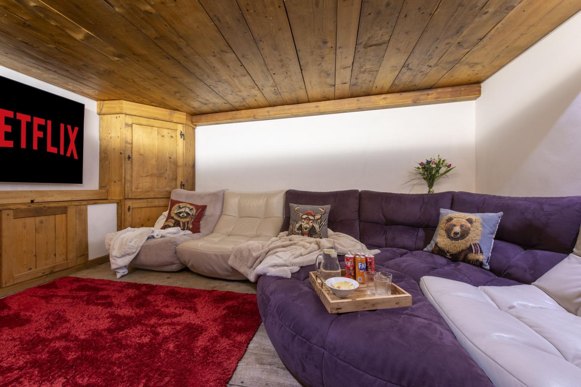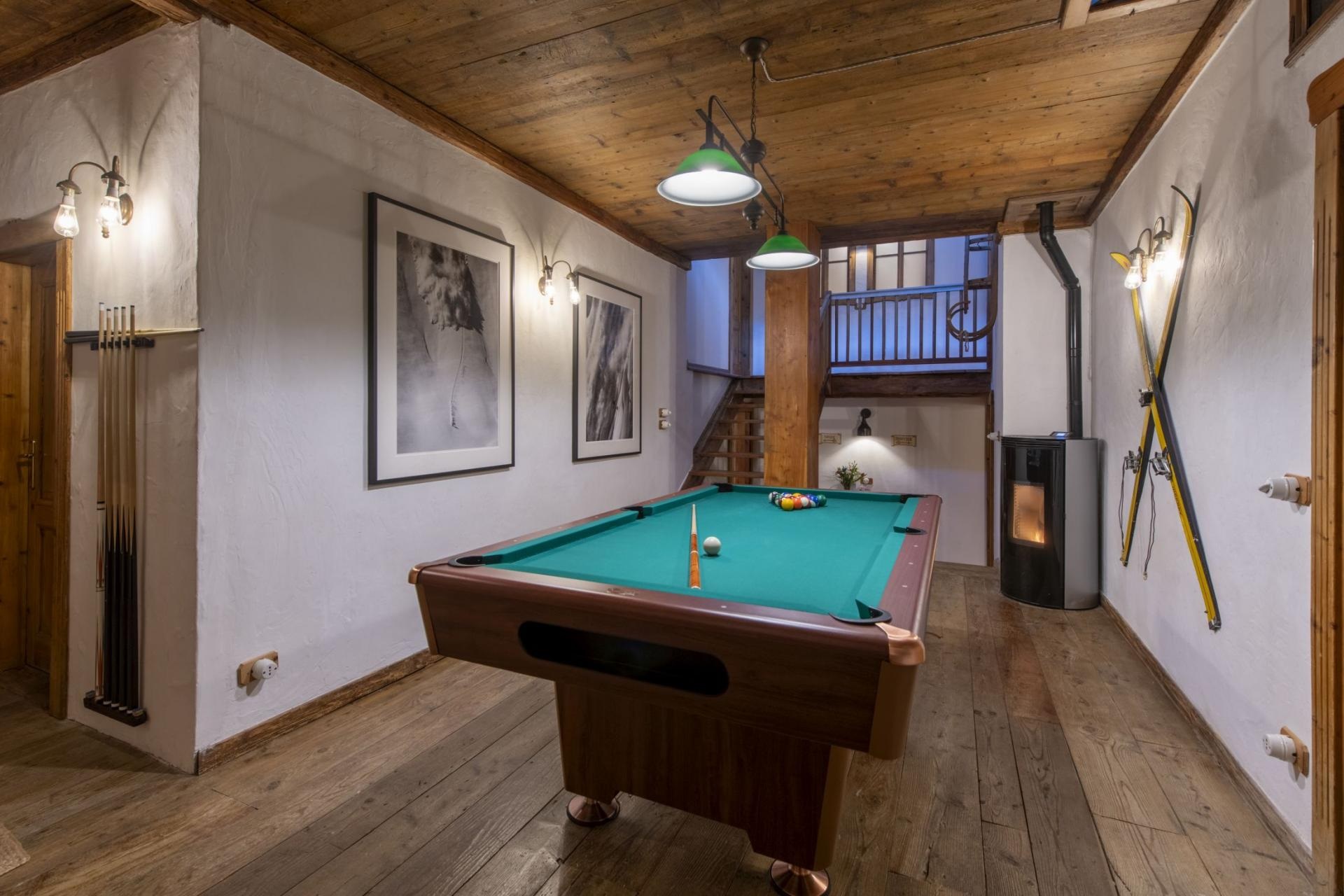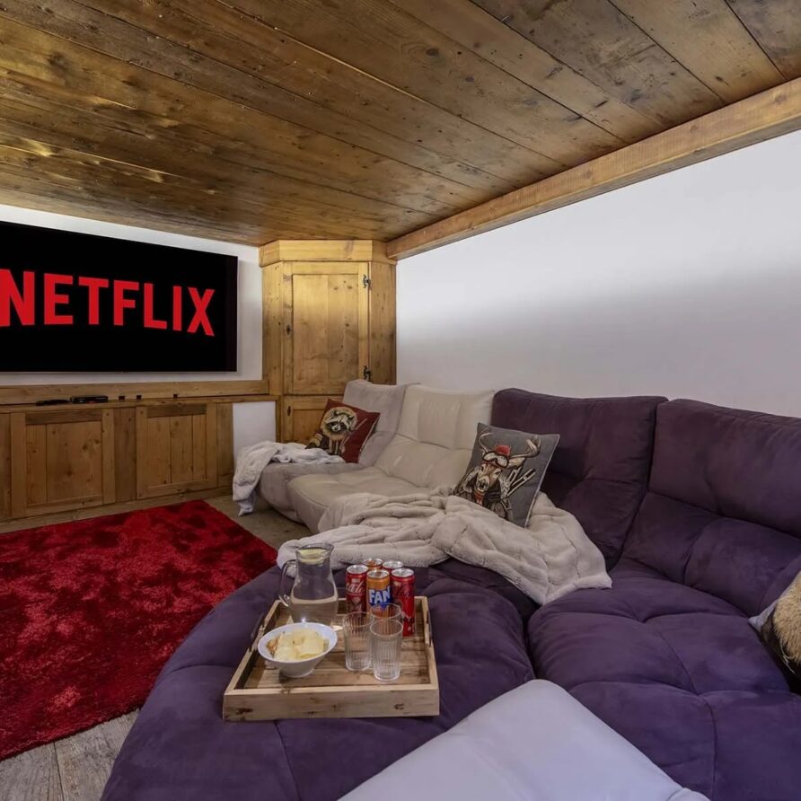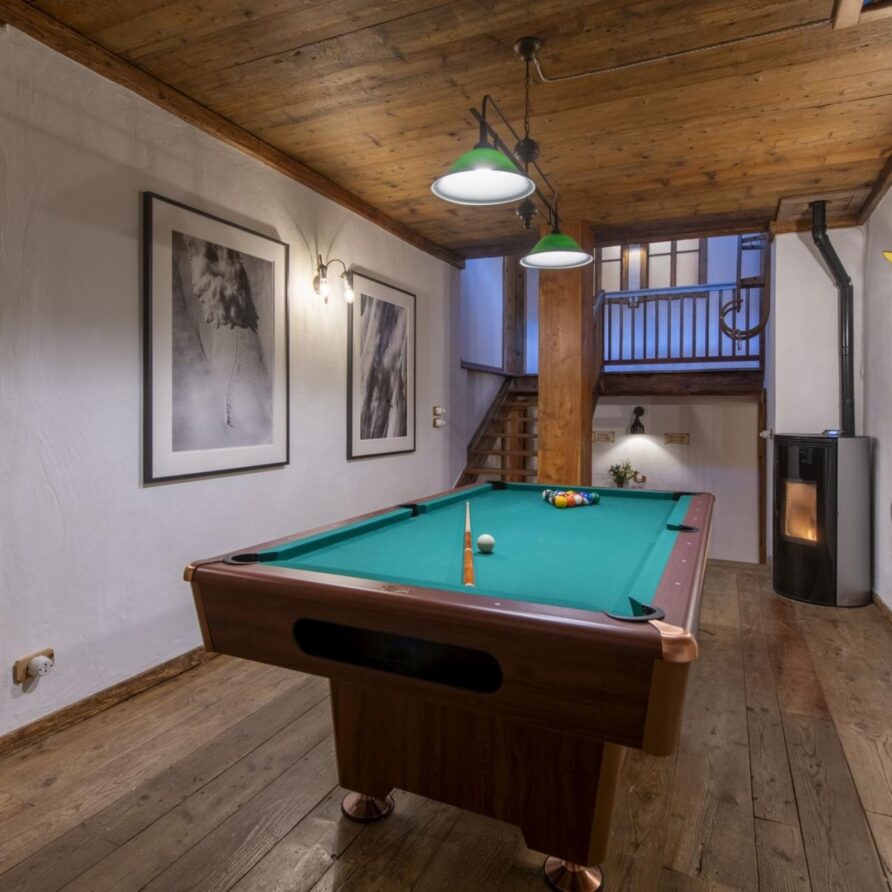 Interconnected with the main room is a fully equipped kitchen, serving as the stage for the private chef. There is a fully stocked prosecco fridge and two traditional tables for breakfasts and kid’s meals in the cozy corners. The kitchen looks out over a terrace with the meadows and river beneath. Step out onto the terrace and catch the sun or indulge in al fresco dining. For leisure, the chalet offers a cinema room complete with a PS5 for watching films or gaming, while a pool table provides endless entertainment for guests of all ages before dinner.