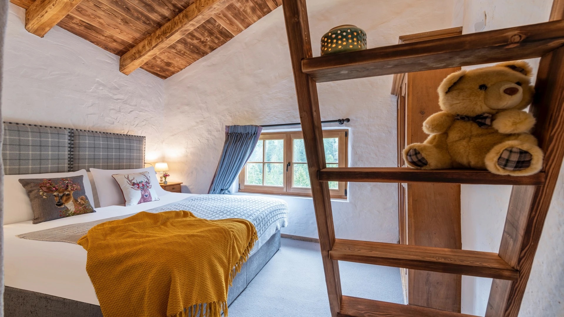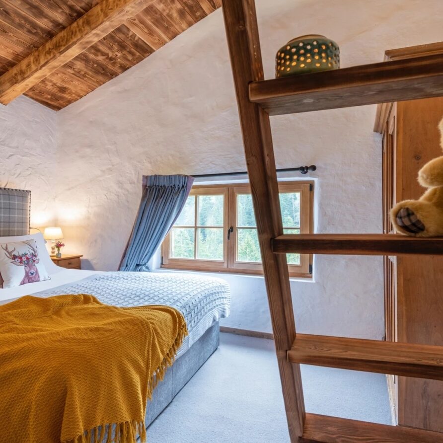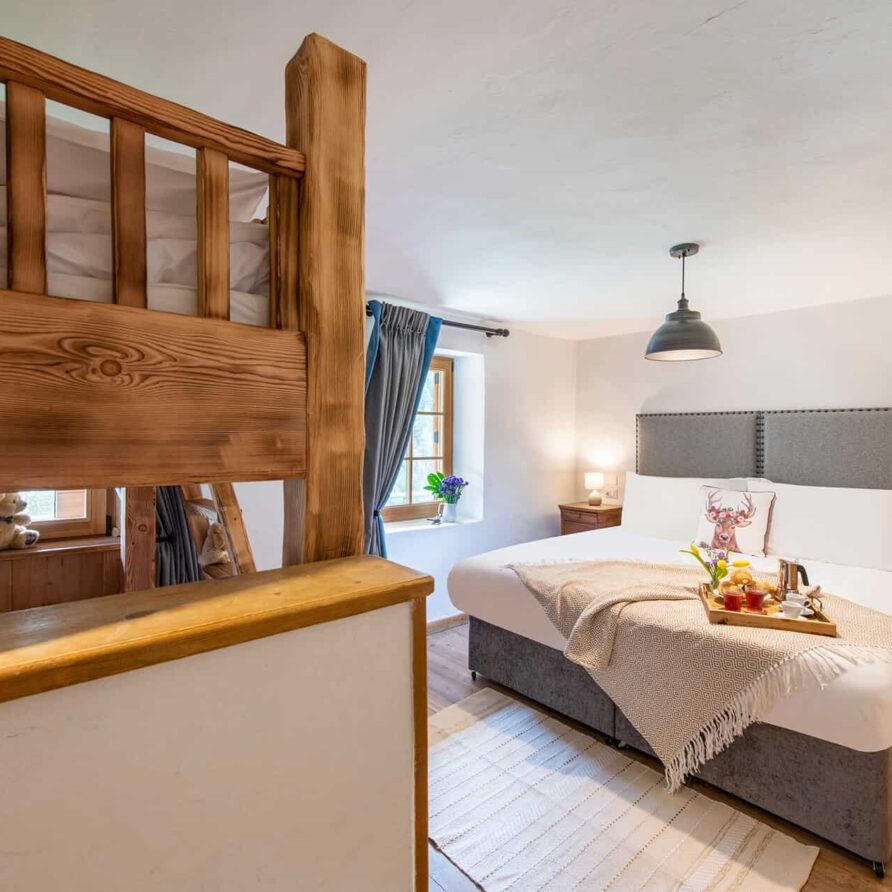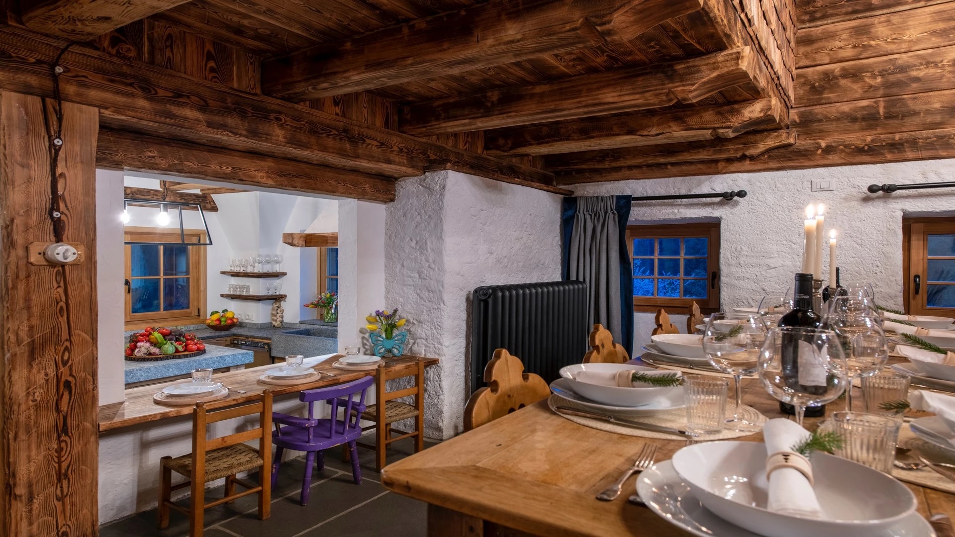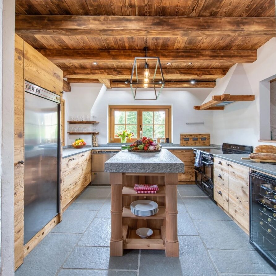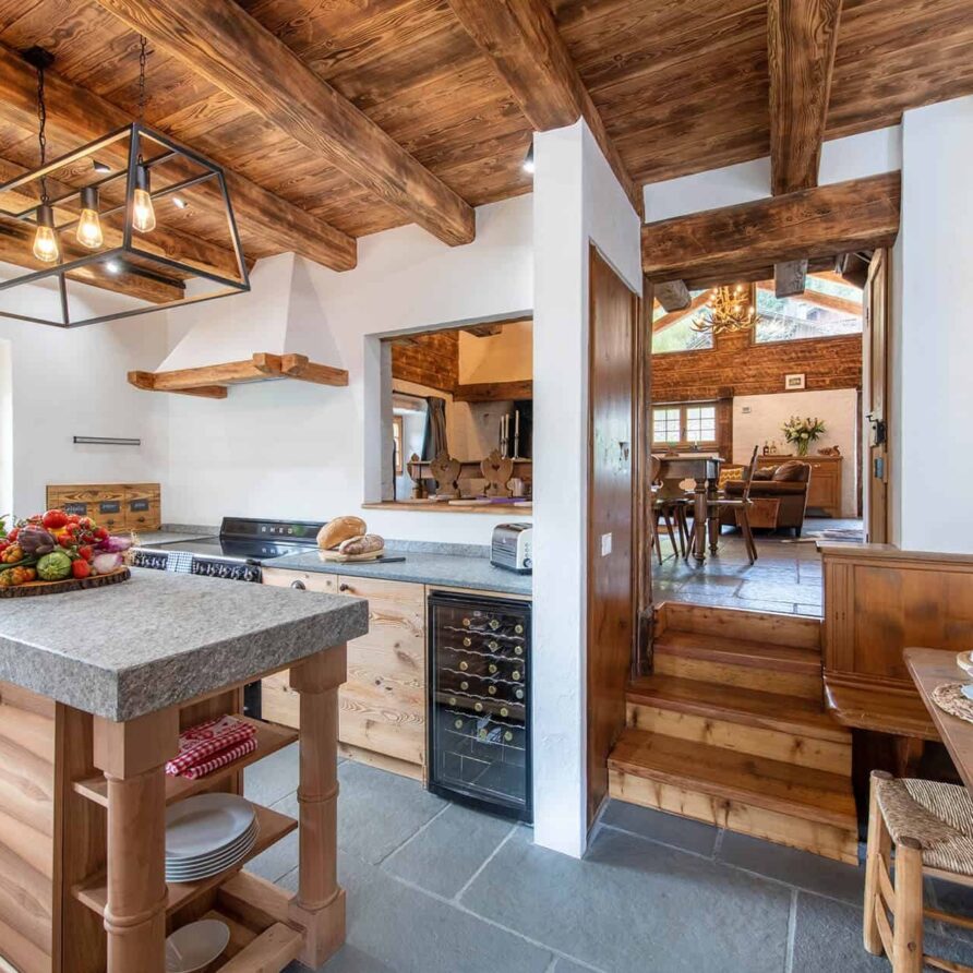 Interconnected with the main room is a fully equipped kitchen, serving as the stage for the private chef. There is a fully stocked prosecco fridge and two traditional tables for breakfasts and kid’s meals in the cozy corners. The kitchen looks out over a terrace with the meadows and river beneath. Step out onto the terrace and catch the sun or indulge in al fresco dining. For leisure, the chalet offers a cinema room complete with a PS5 for watching films or gaming, while a pool table provides endless entertainment for guests of all ages before dinner.