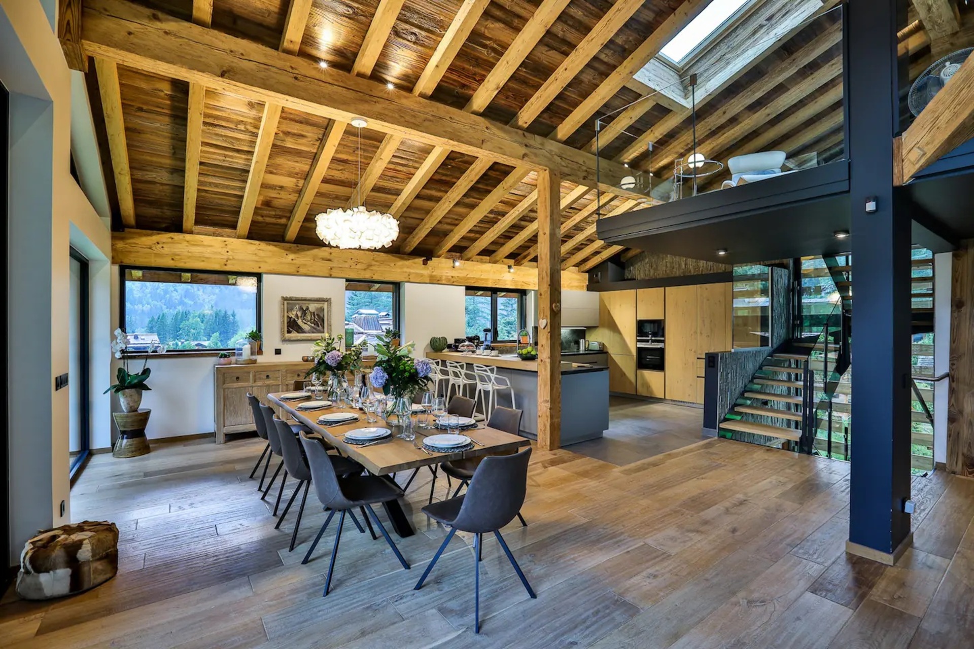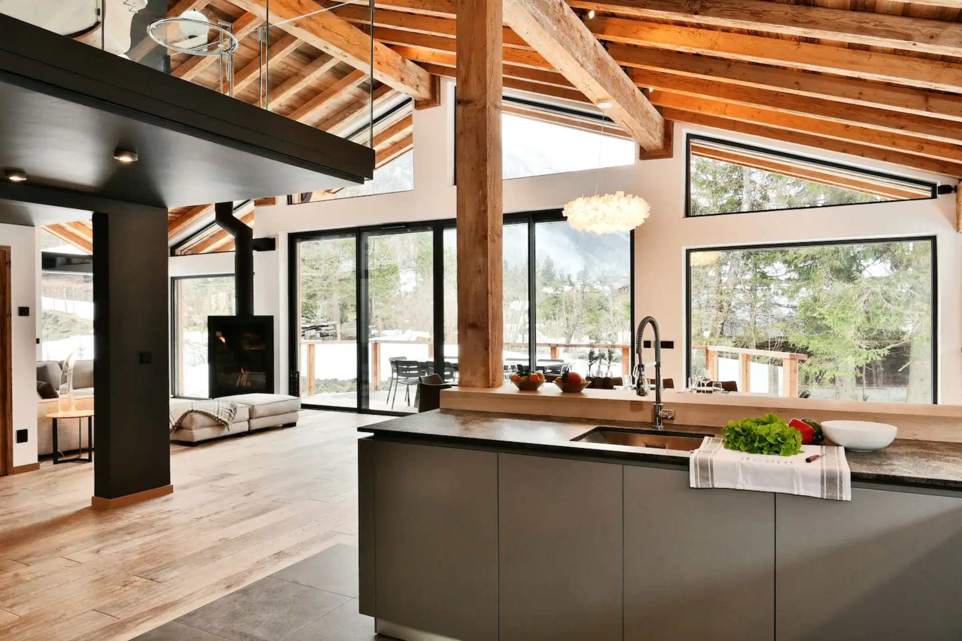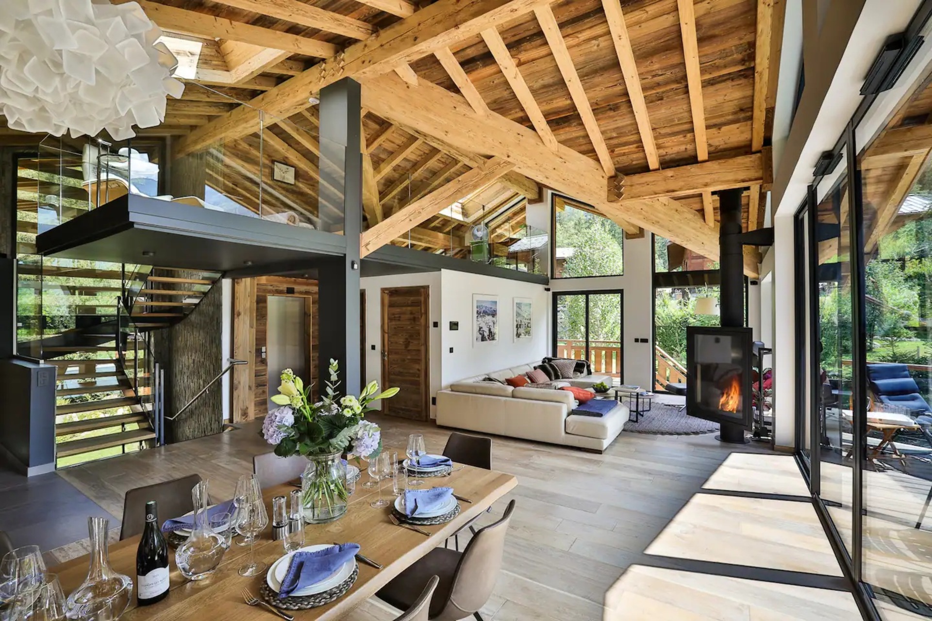 Upon entering the chalet, you will be welcomed in a bright and spacious open-plan living area, where floor to ceiling windows flood the space with natural light. Here, wooden beam ceiling recall the classic chalet structure and is elegantly blended with a contemporary finish and modern furnishings. A comfortable L-shaped sofa and a fireplace creates the ideal place where to come back to at the end of a busy day.