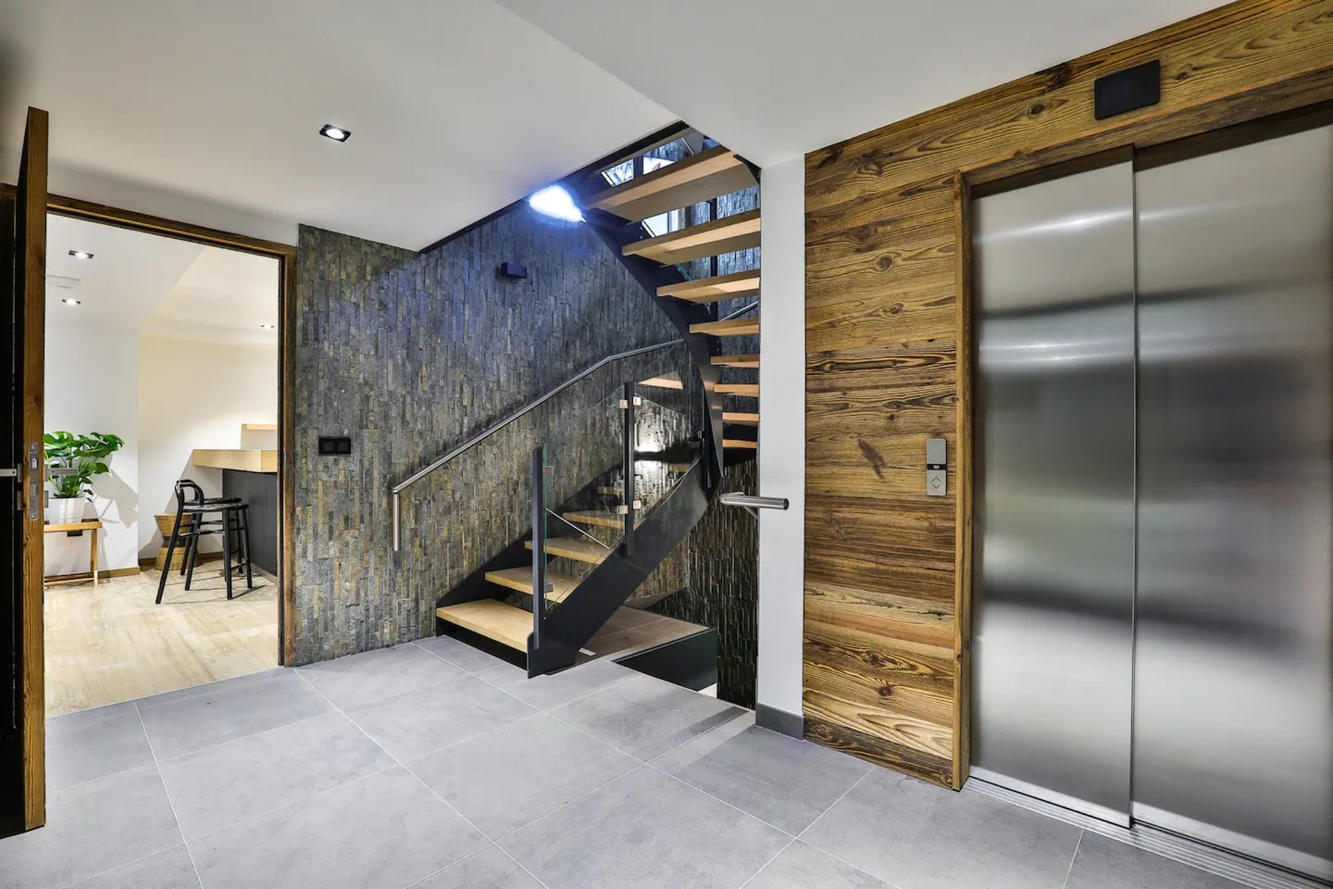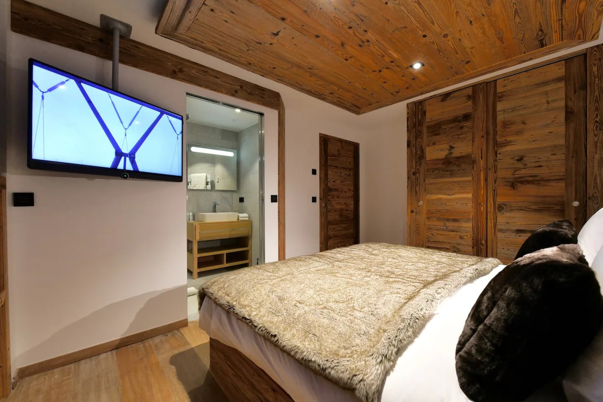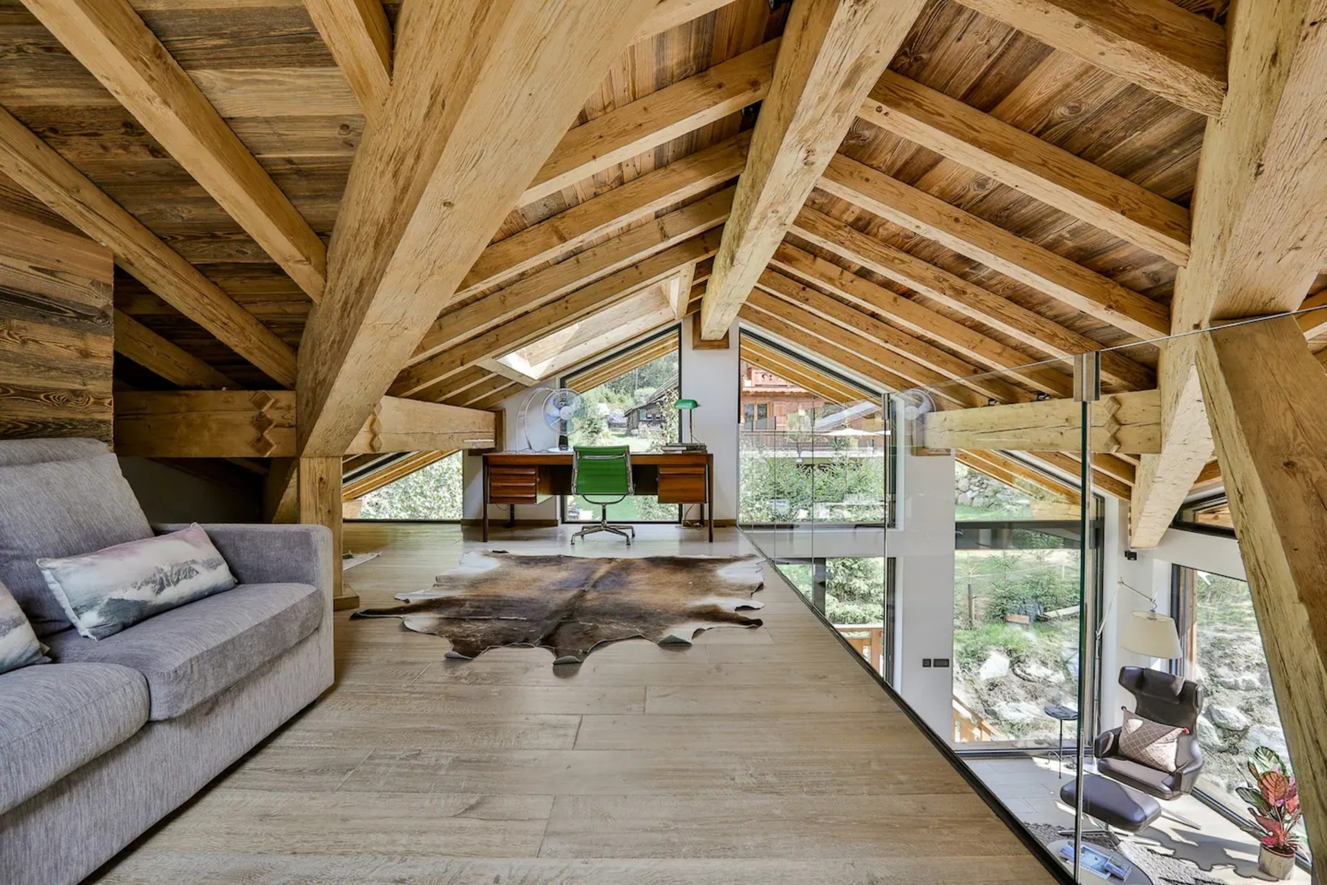 Upon entering the chalet, you will be welcomed in a bright and spacious open-plan living area, where floor to ceiling windows flood the space with natural light. Here, wooden beam ceiling recall the classic chalet structure and is elegantly blended with a contemporary finish and modern furnishings. A comfortable L-shaped sofa and a fireplace creates the ideal place where to come back to at the end of a busy day.