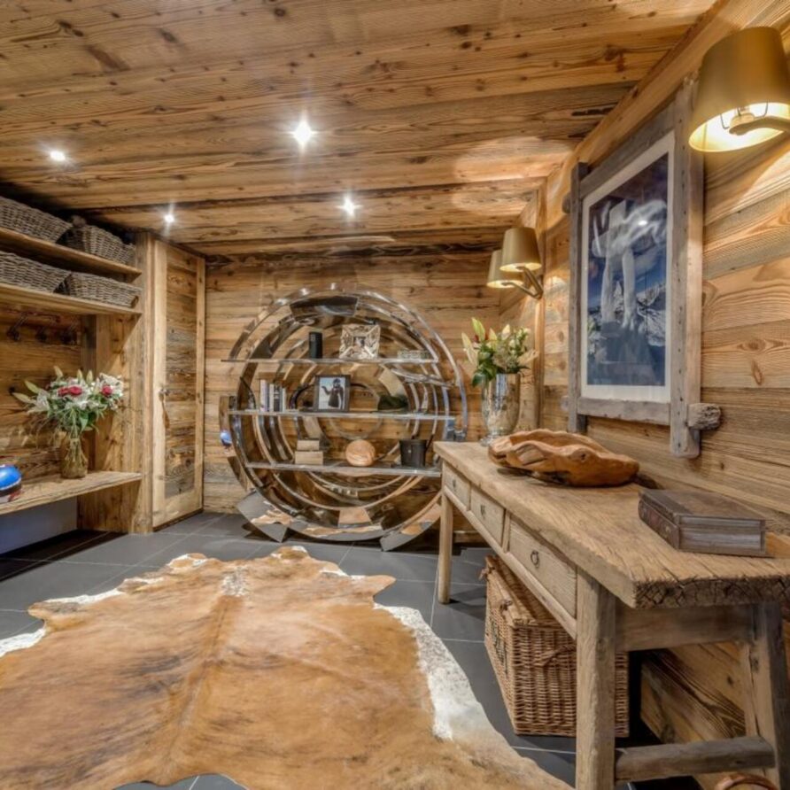 The chalet has several separate living areas; a large bright living area with open fireplace located on the top floor of the chalet. There is a fabulous cinema room located next to a stocked bar with pool table which can be either open or closed off and hidden, which will keep both adults and children happy. The open plan kitchen and dining area looks out over the expansive terrace and affords beautiful views of the mountains.