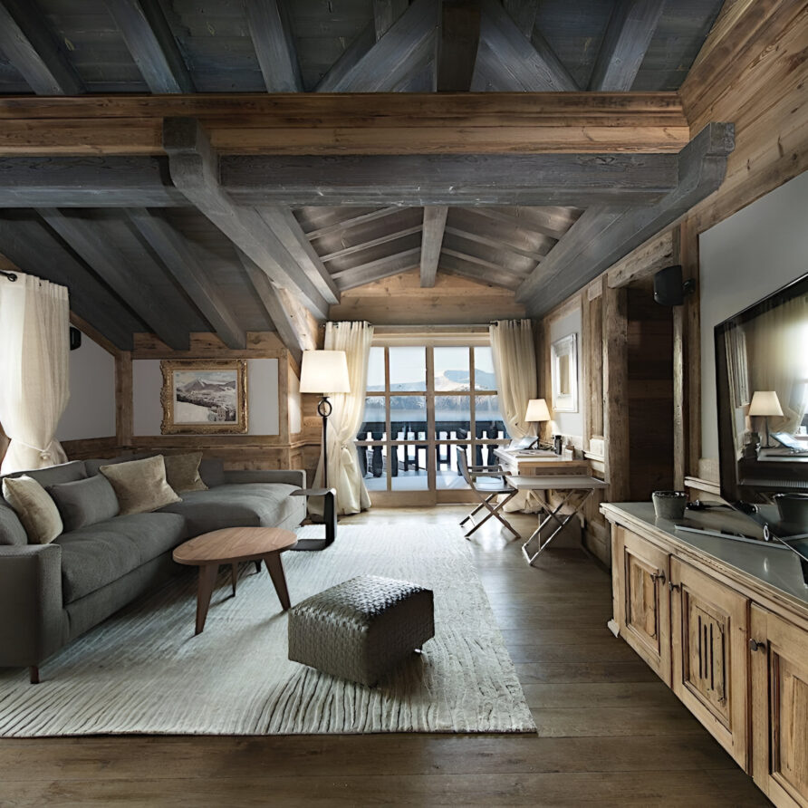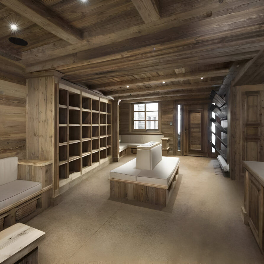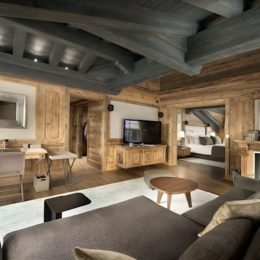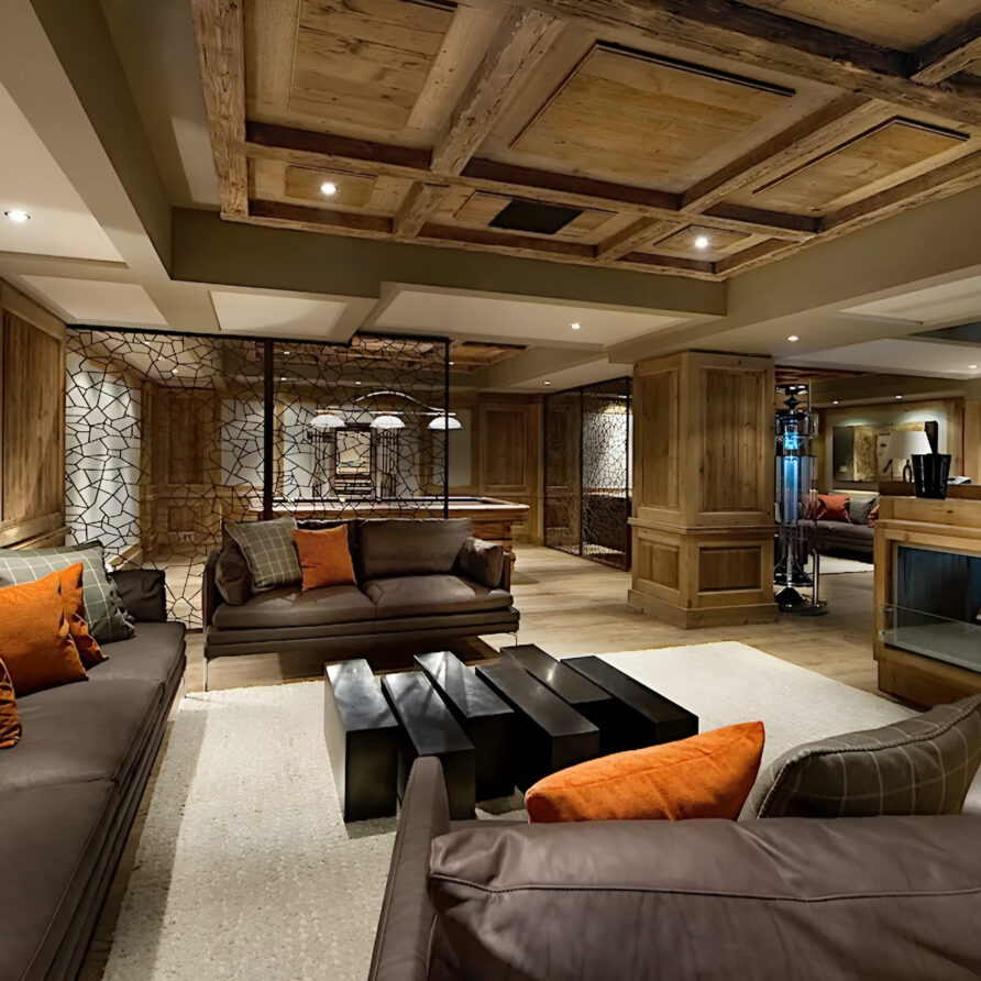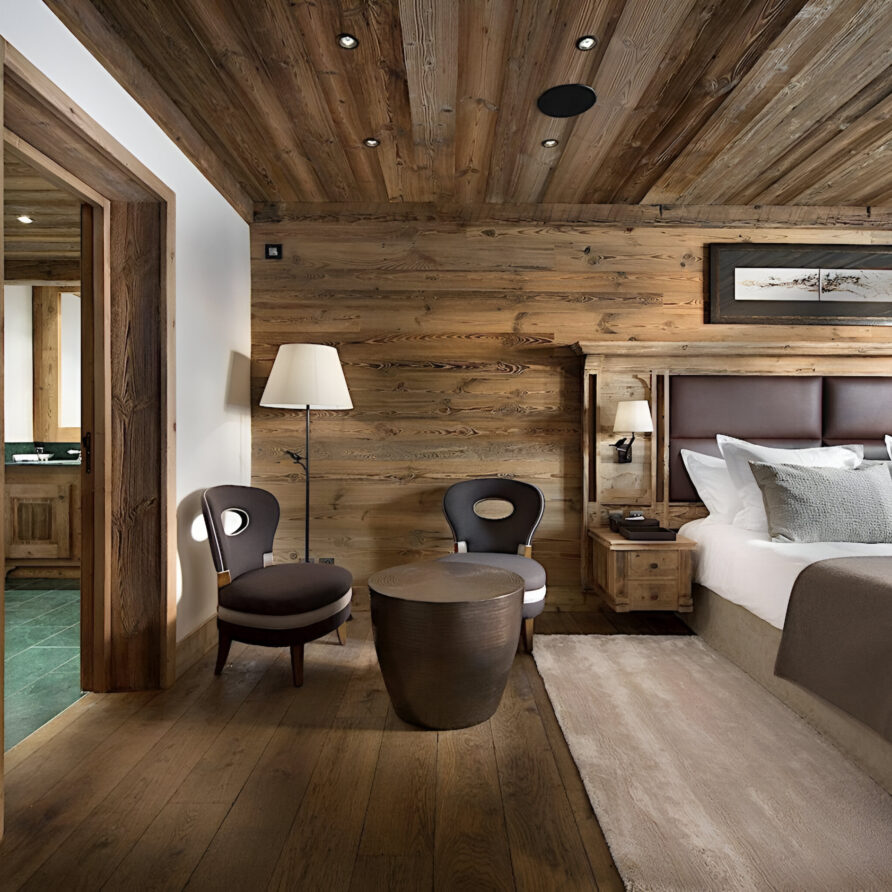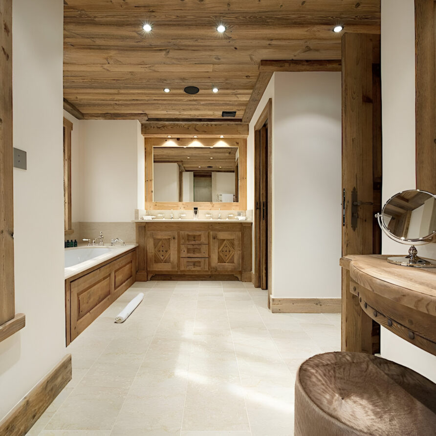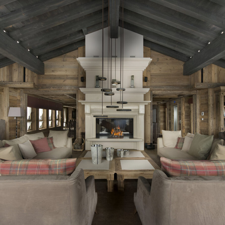 One of the most prestigious ski chalets with 7 substantial bedrooms brings a new standard of luxury to Courchevel 1850. Calming neutral tones feature throughout, and its alpine style is typified by wooden beams, warming fireplaces and cozy soft-furnishings. The main living space encompasses the entire third floor, where panoramic windows make the most of spectacular views across the Three Valleys and Courchevel’s peaks. With a vaulted ceiling and several distinct areas to relax, the living room is bright and airy, yet the huge fireplace, feature lighting and use of natural materials all ensure the space exudes a feeling of comfort and warmth. This floor is also home to the formal dining room and professional grade kitchen, where gourmet delights are prepared for your enjoyment throughout your stay.