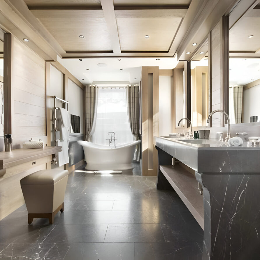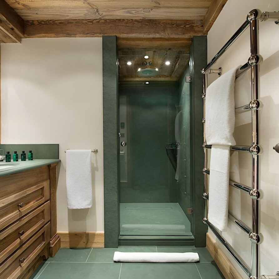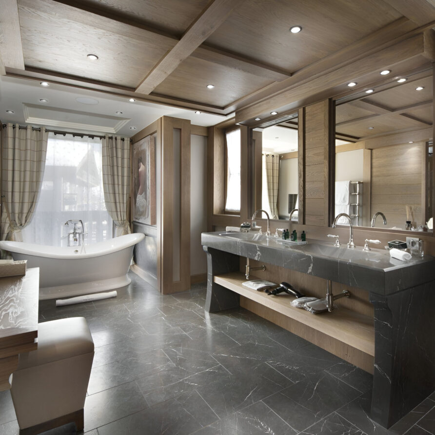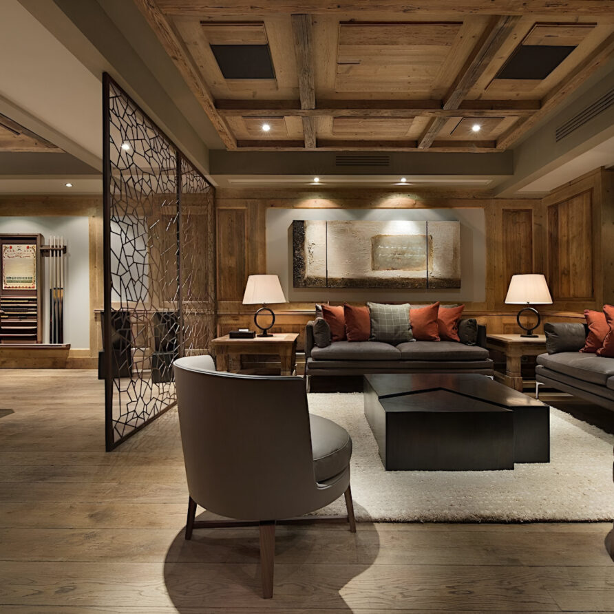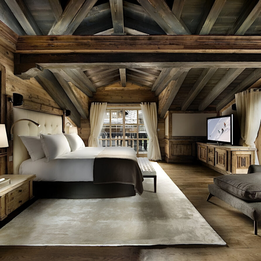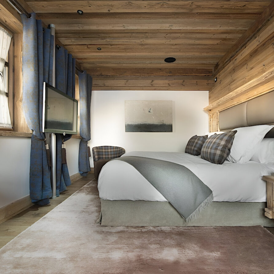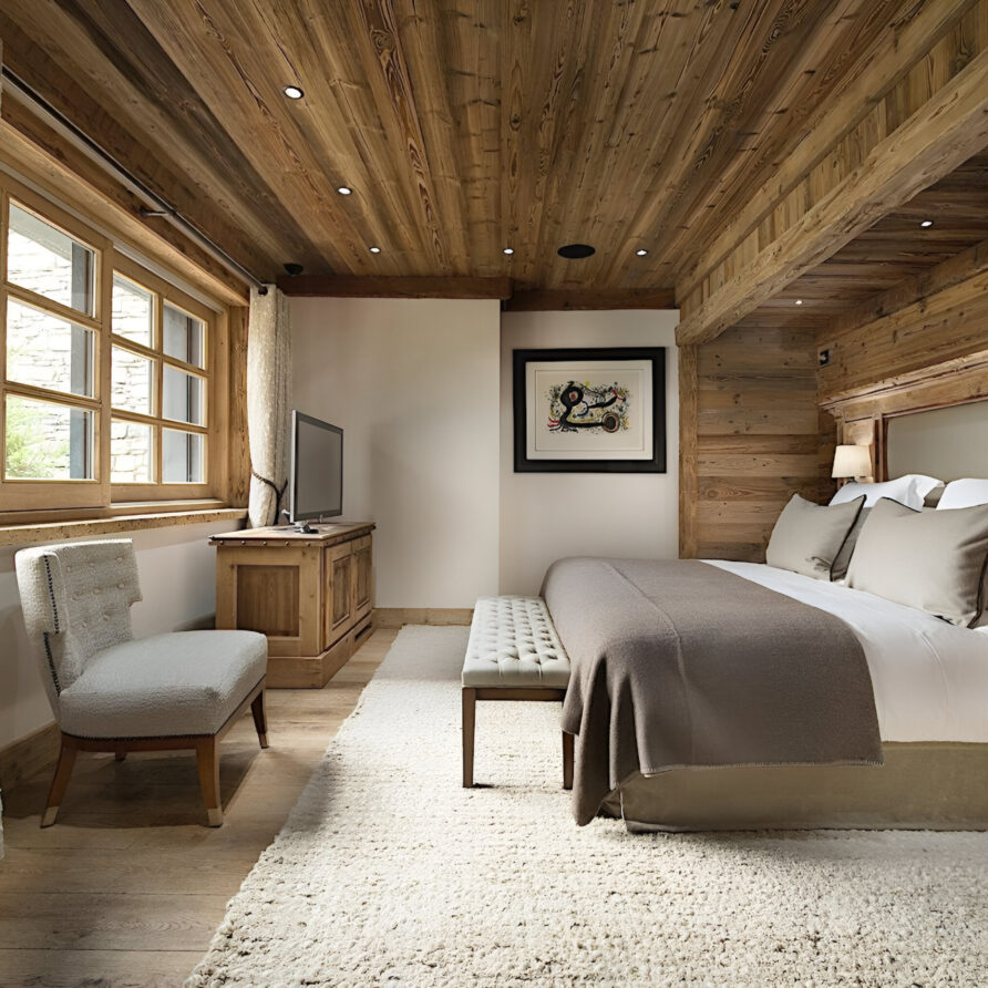 One of the most prestigious ski chalets with 7 substantial bedrooms brings a new standard of luxury to Courchevel 1850. Calming neutral tones feature throughout, and its alpine style is typified by wooden beams, warming fireplaces and cozy soft-furnishings. The main living space encompasses the entire third floor, where panoramic windows make the most of spectacular views across the Three Valleys and Courchevel’s peaks. With a vaulted ceiling and several distinct areas to relax, the living room is bright and airy, yet the huge fireplace, feature lighting and use of natural materials all ensure the space exudes a feeling of comfort and warmth. This floor is also home to the formal dining room and professional grade kitchen, where gourmet delights are prepared for your enjoyment throughout your stay.