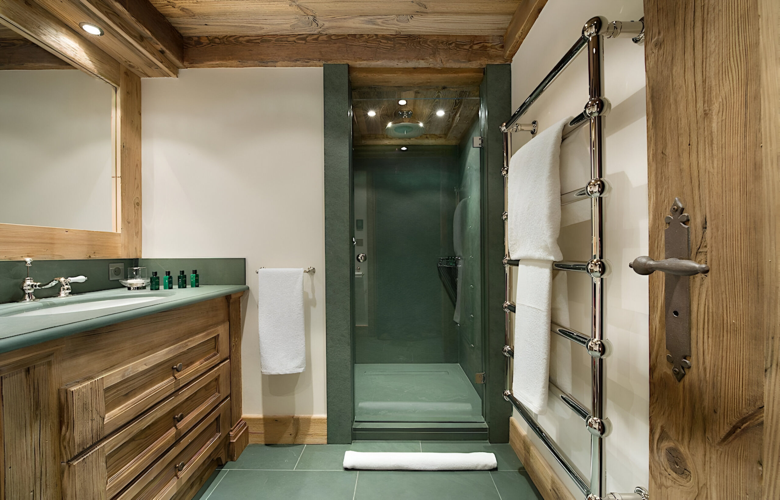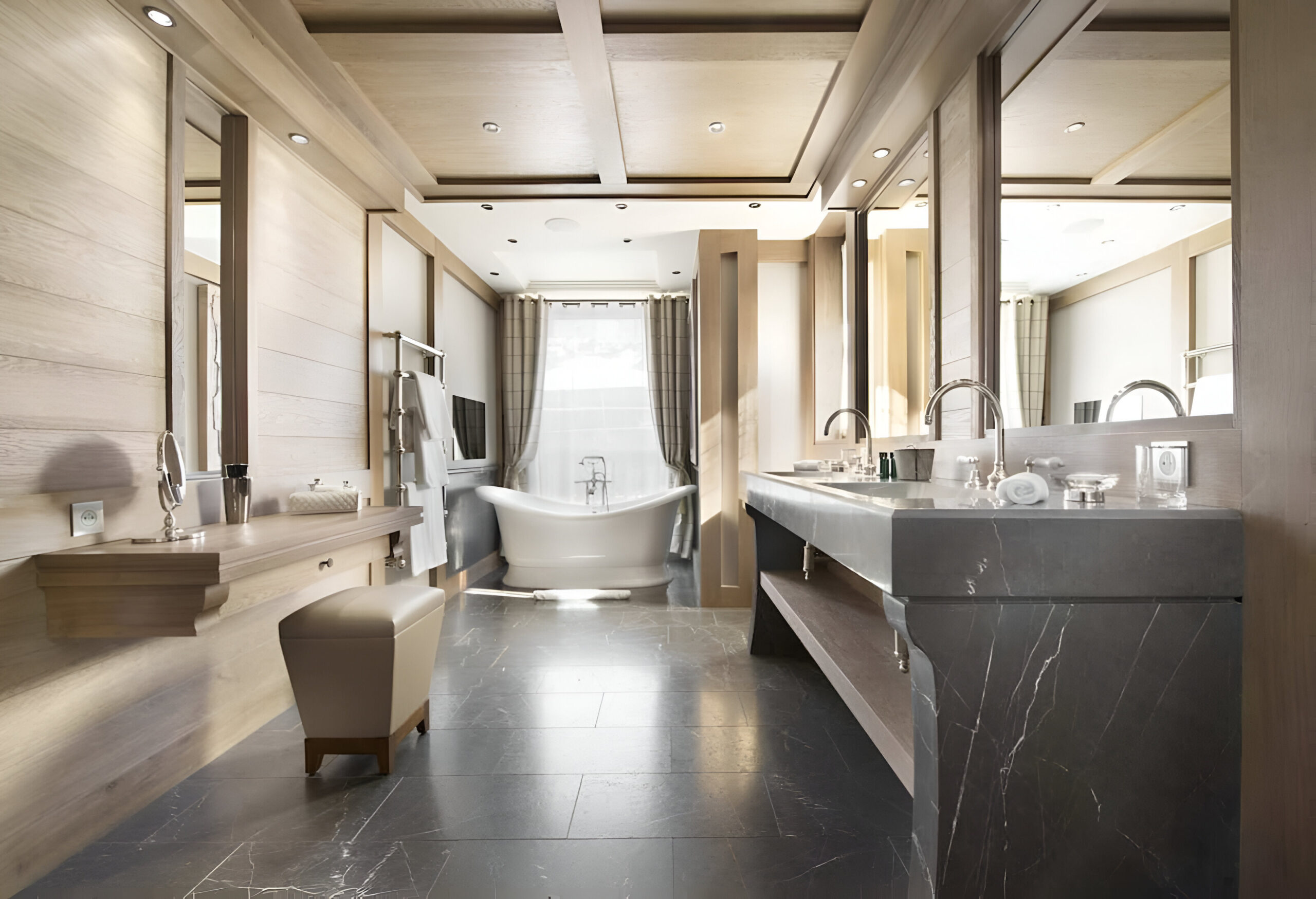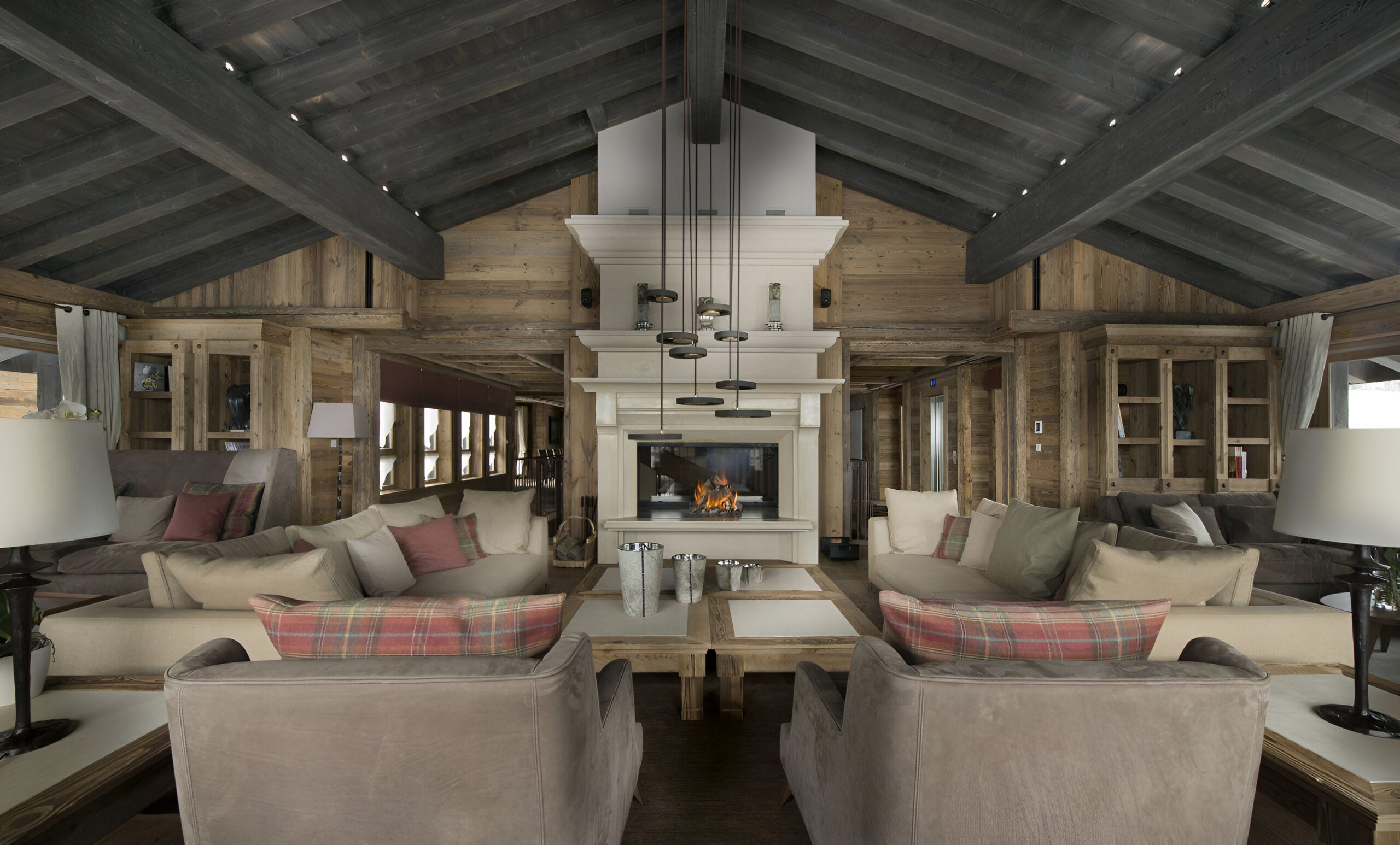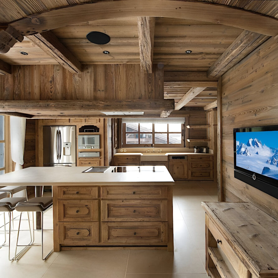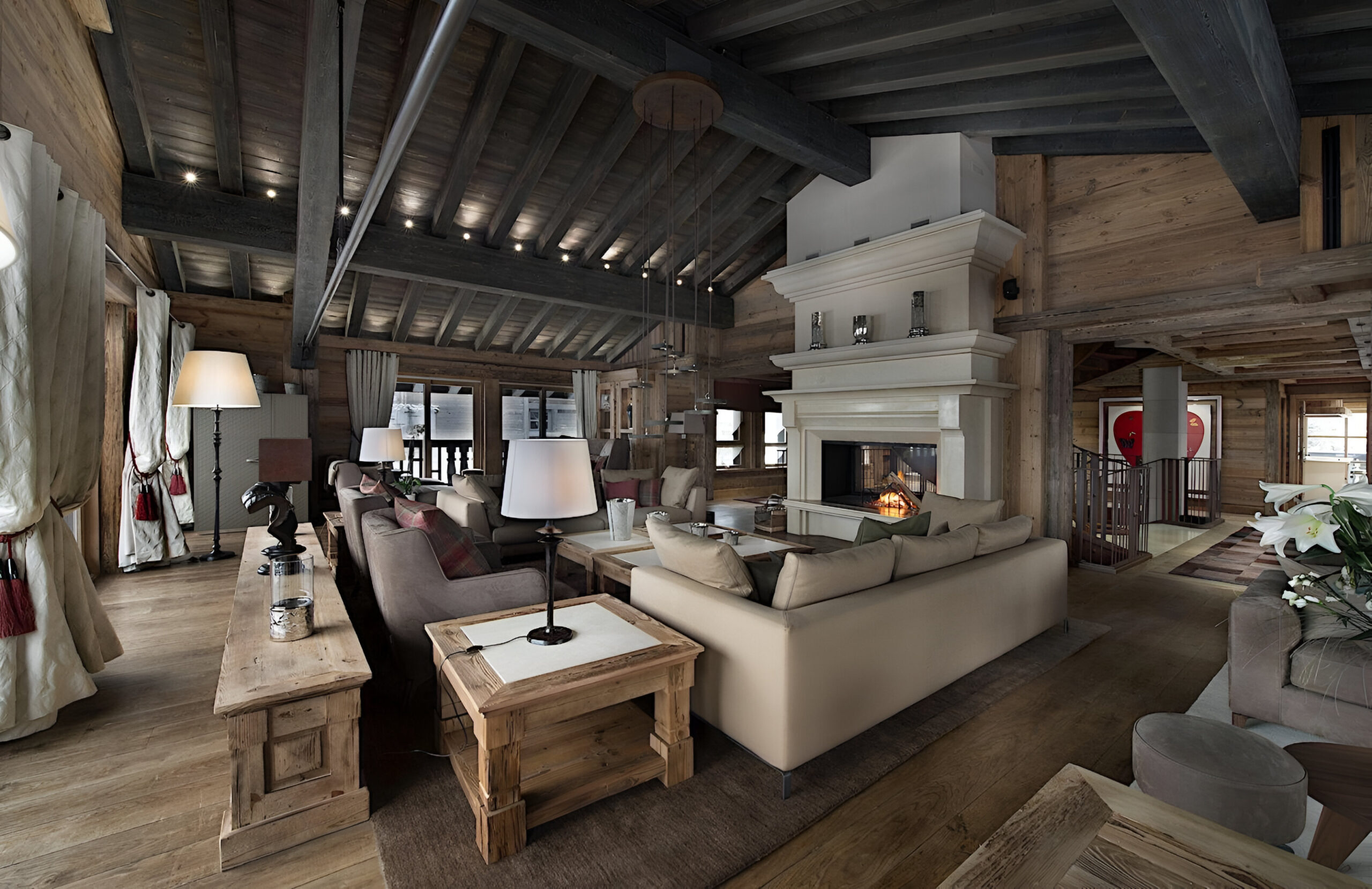 One of the most prestigious ski chalets with 7 substantial bedrooms brings a new standard of luxury to Courchevel 1850. Calming neutral tones feature throughout, and its alpine style is typified by wooden beams, warming fireplaces and cozy soft-furnishings. The main living space encompasses the entire third floor, where panoramic windows make the most of spectacular views across the Three Valleys and Courchevel’s peaks. With a vaulted ceiling and several distinct areas to relax, the living room is bright and airy, yet the huge fireplace, feature lighting and use of natural materials all ensure the space exudes a feeling of comfort and warmth. This floor is also home to the formal dining room and professional grade kitchen, where gourmet delights are prepared for your enjoyment throughout your stay.