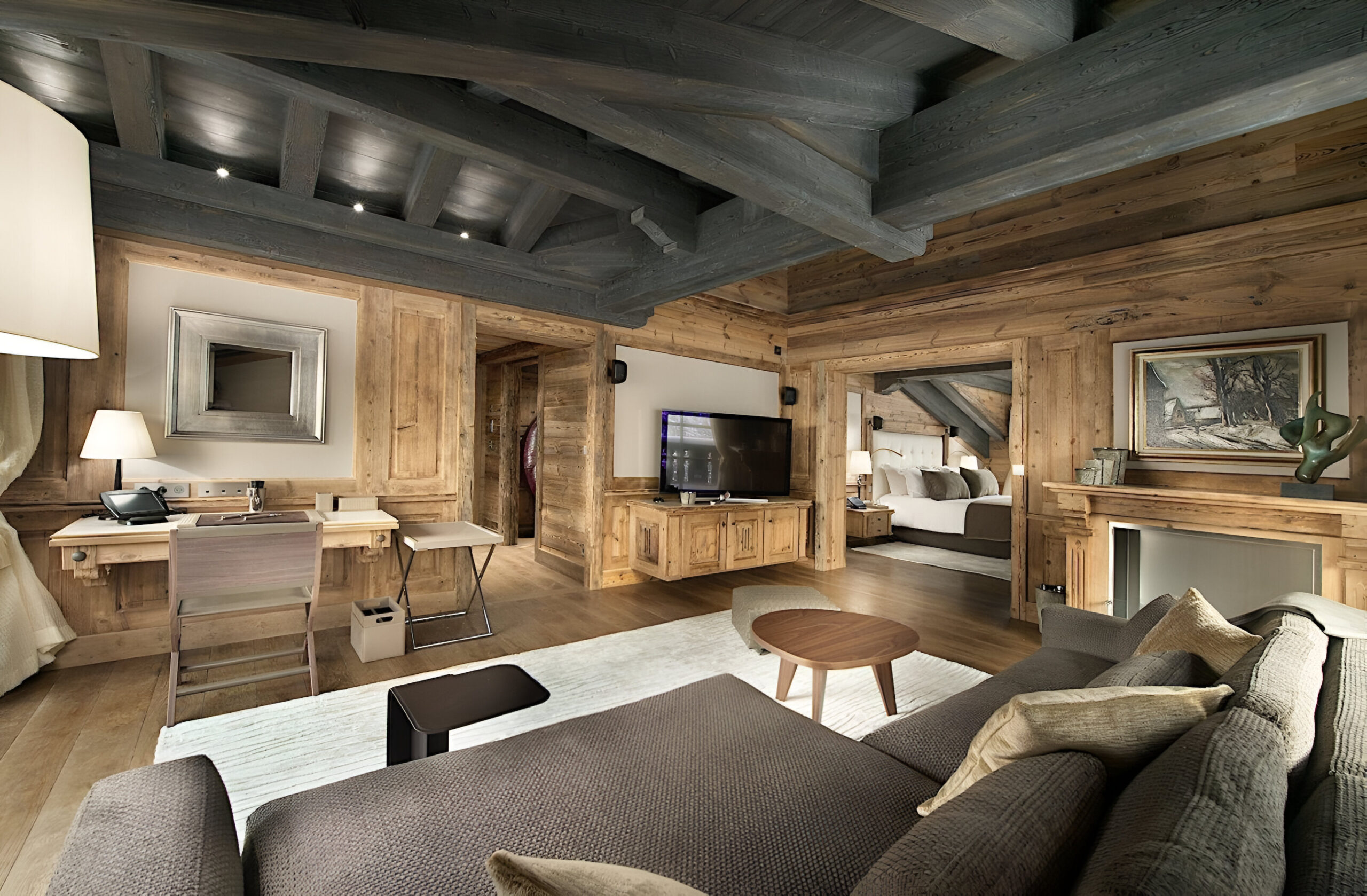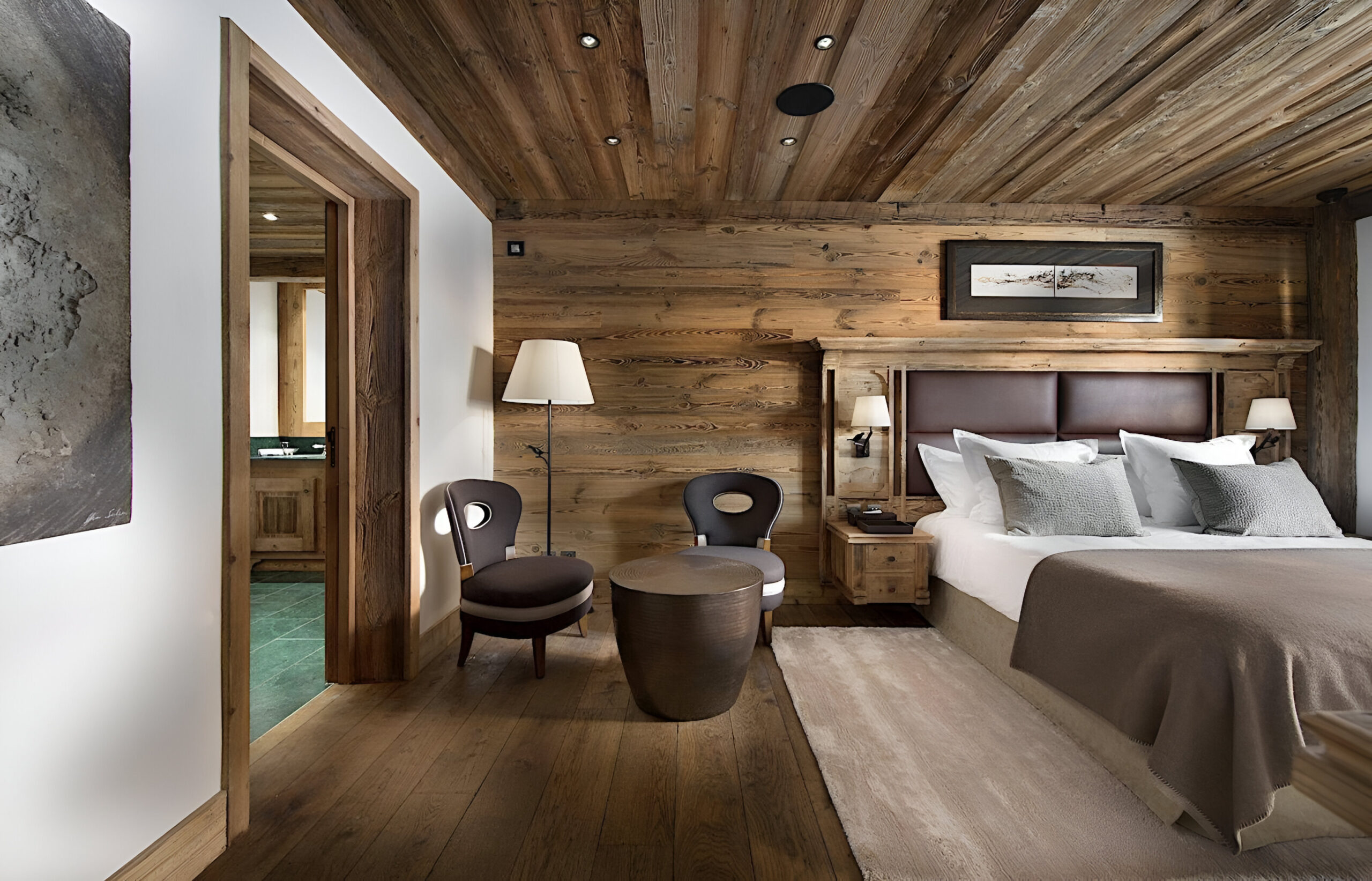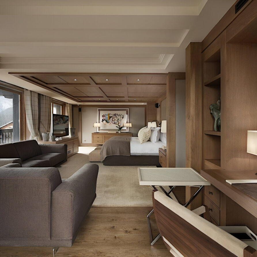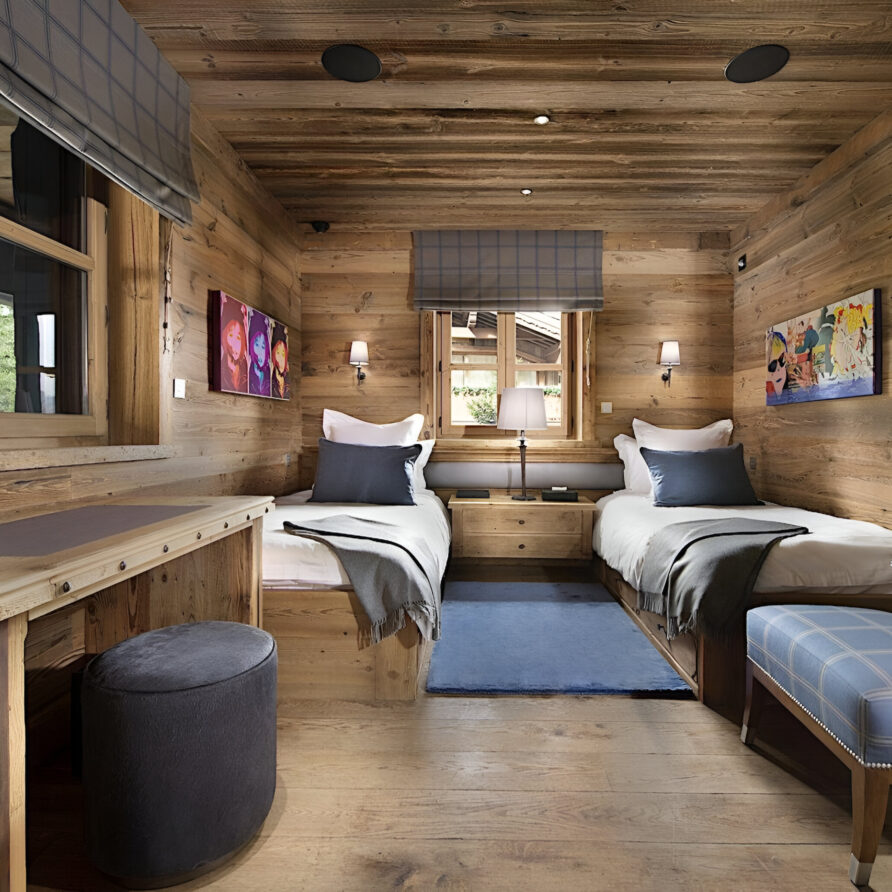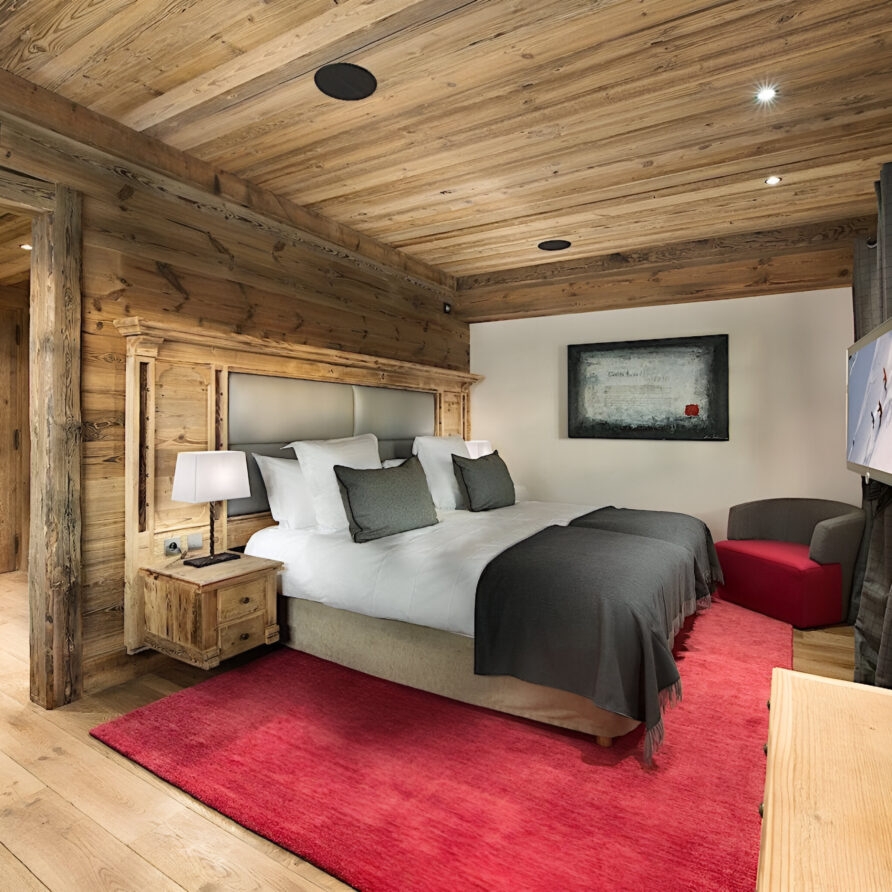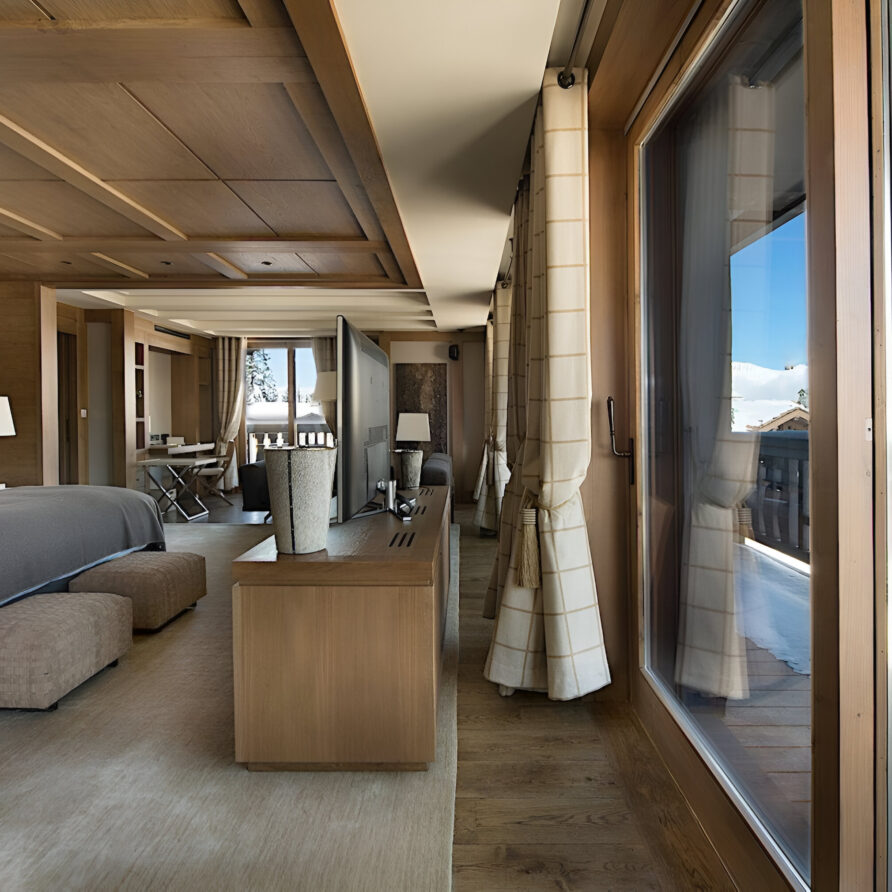 To the very heart of the chalet you will find an elegant spiral staircase covering the all floors of the property. This is a truly impressive space, with many famous artworks also on display here. Leading off from the landings, you will find each of the bedrooms, which are spread across three levels of the property. The chalet has a total of seven spacious bedrooms, two of which are master suites. The first master sits alone on the top floor of the chalet. Spanning 100m², it constitutes a stylish bedroom, a separate lounge with a study area, two dressing rooms and a stunning en-suite bathroom. The second master suite, along with three further bedrooms, are located on the second floor. This master bedroom is also 100m² in size, and similarly boasts a sitting area, desk space, private balcony and beautiful en-suite bathroom. All the further bedrooms can be set up as a queen or twin bed configuration for complete flexibility.
