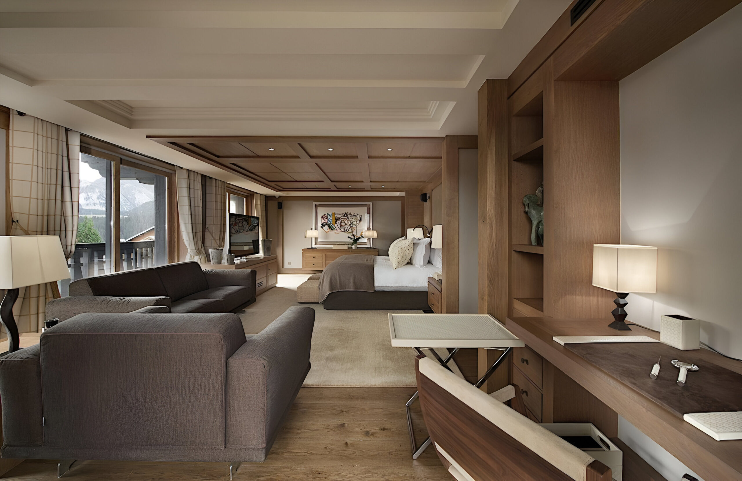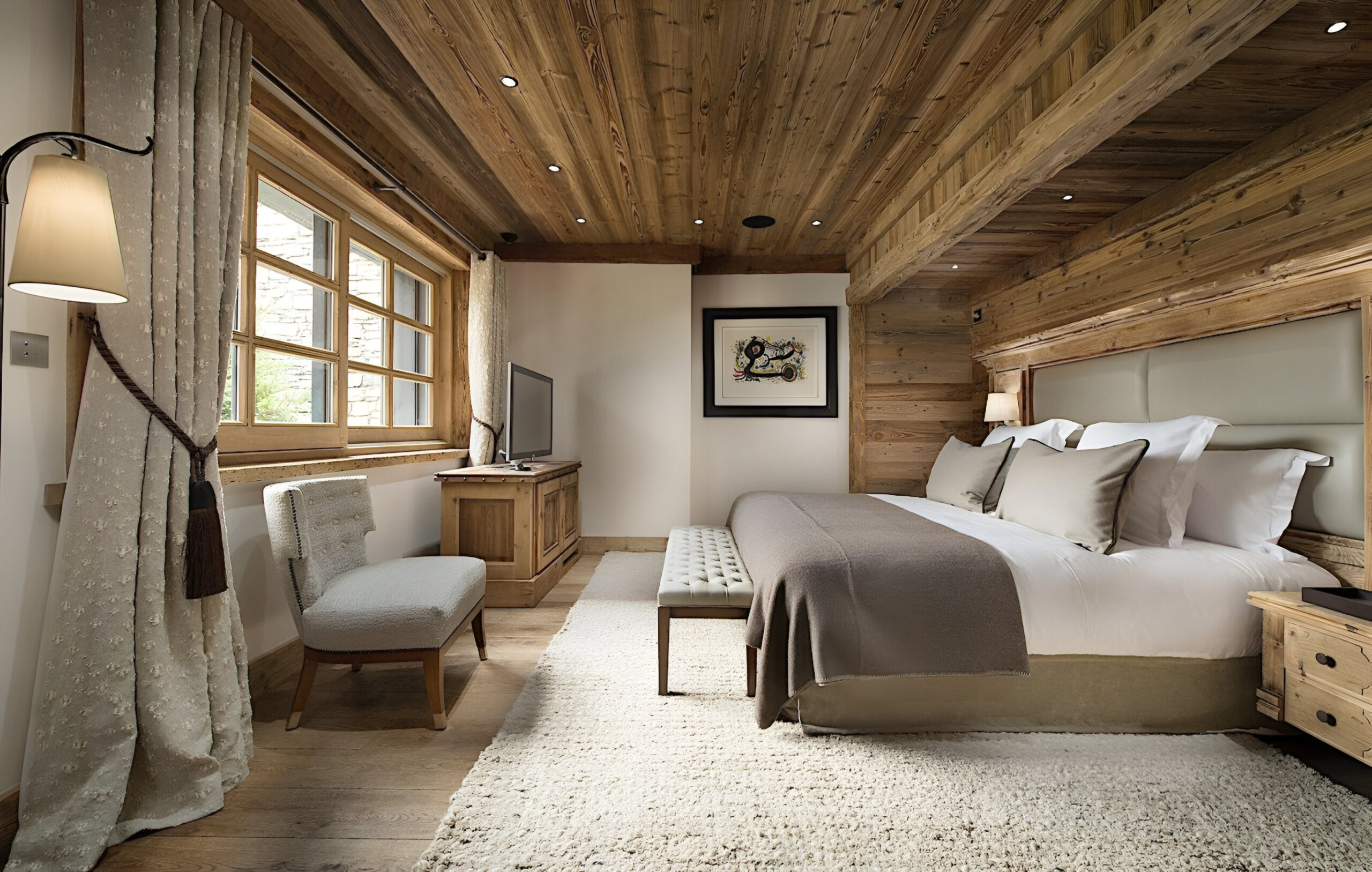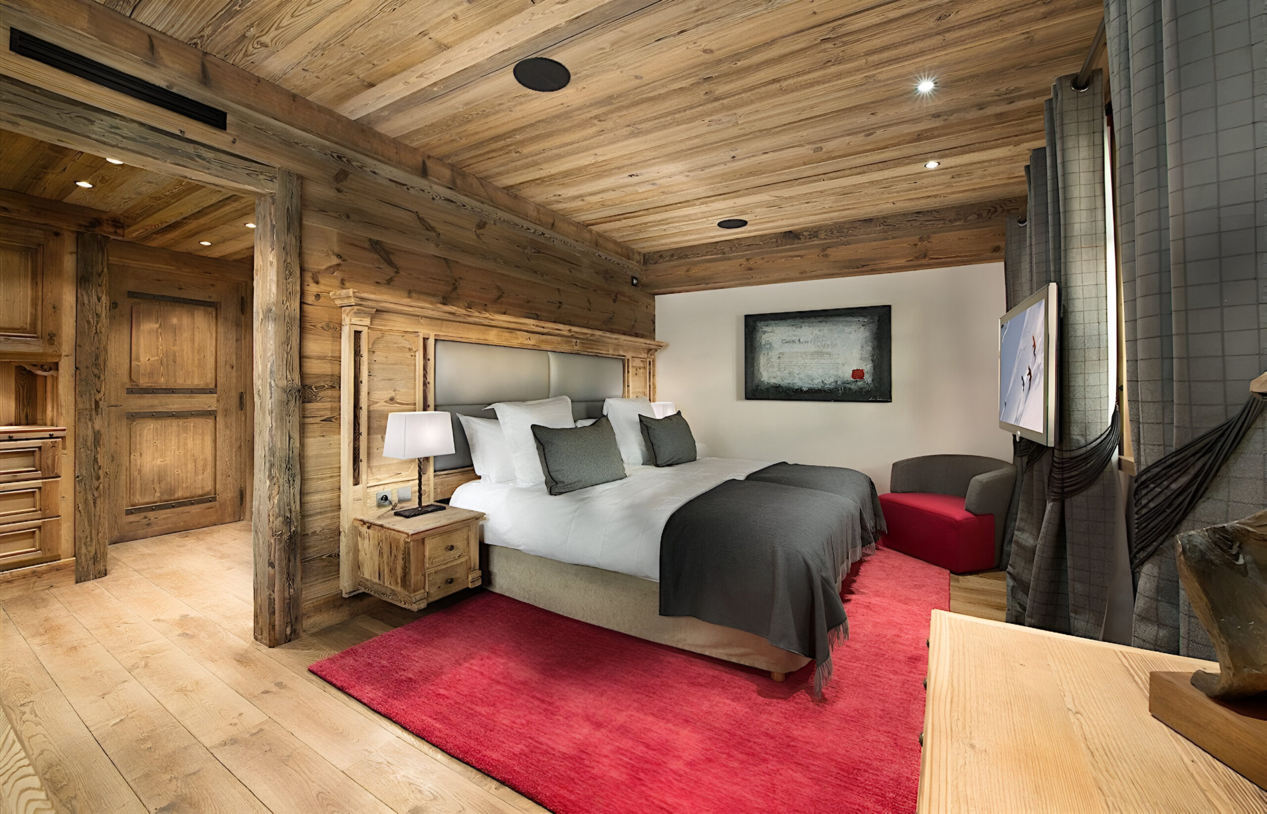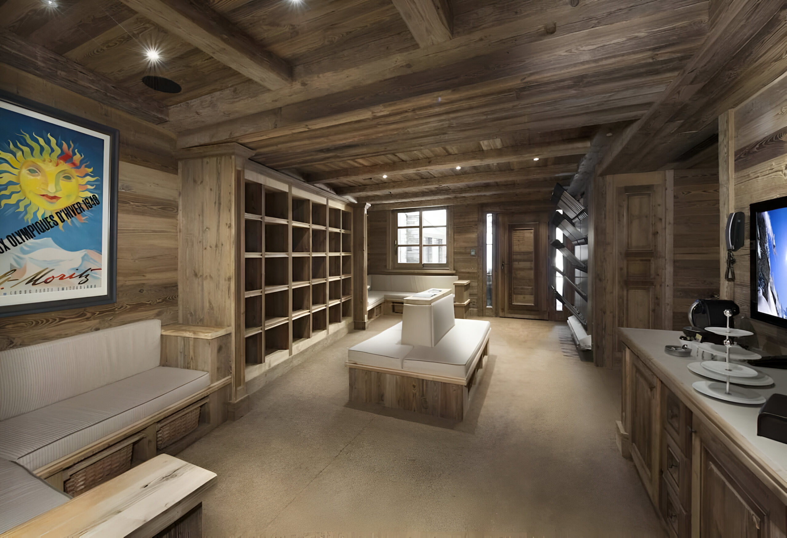 To the very heart of the chalet you will find an elegant spiral staircase covering the all floors of the property. This is a truly impressive space, with many famous artworks also on display here. Leading off from the landings, you will find each of the bedrooms, which are spread across three levels of the property. The chalet has a total of seven spacious bedrooms, two of which are master suites. The first master sits alone on the top floor of the chalet. Spanning 100m², it constitutes a stylish bedroom, a separate lounge with a study area, two dressing rooms and a stunning en-suite bathroom. The second master suite, along with three further bedrooms, are located on the second floor. This master bedroom is also 100m² in size, and similarly boasts a sitting area, desk space, private balcony and beautiful en-suite bathroom. All the further bedrooms can be set up as a queen or twin bed configuration for complete flexibility.