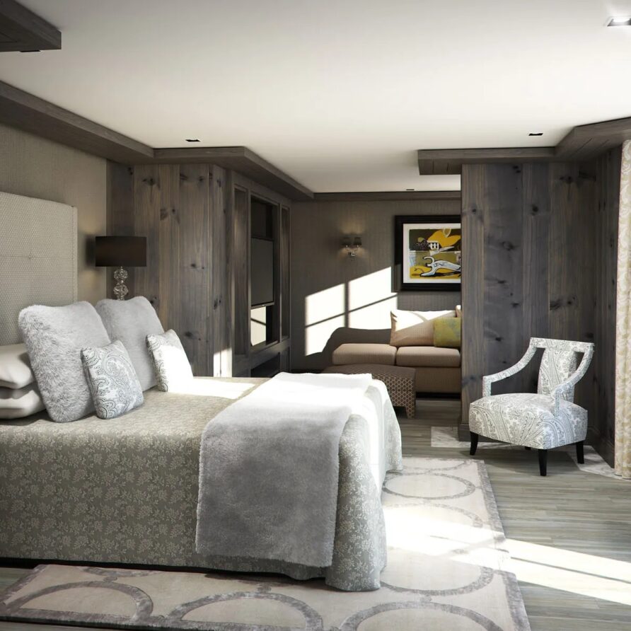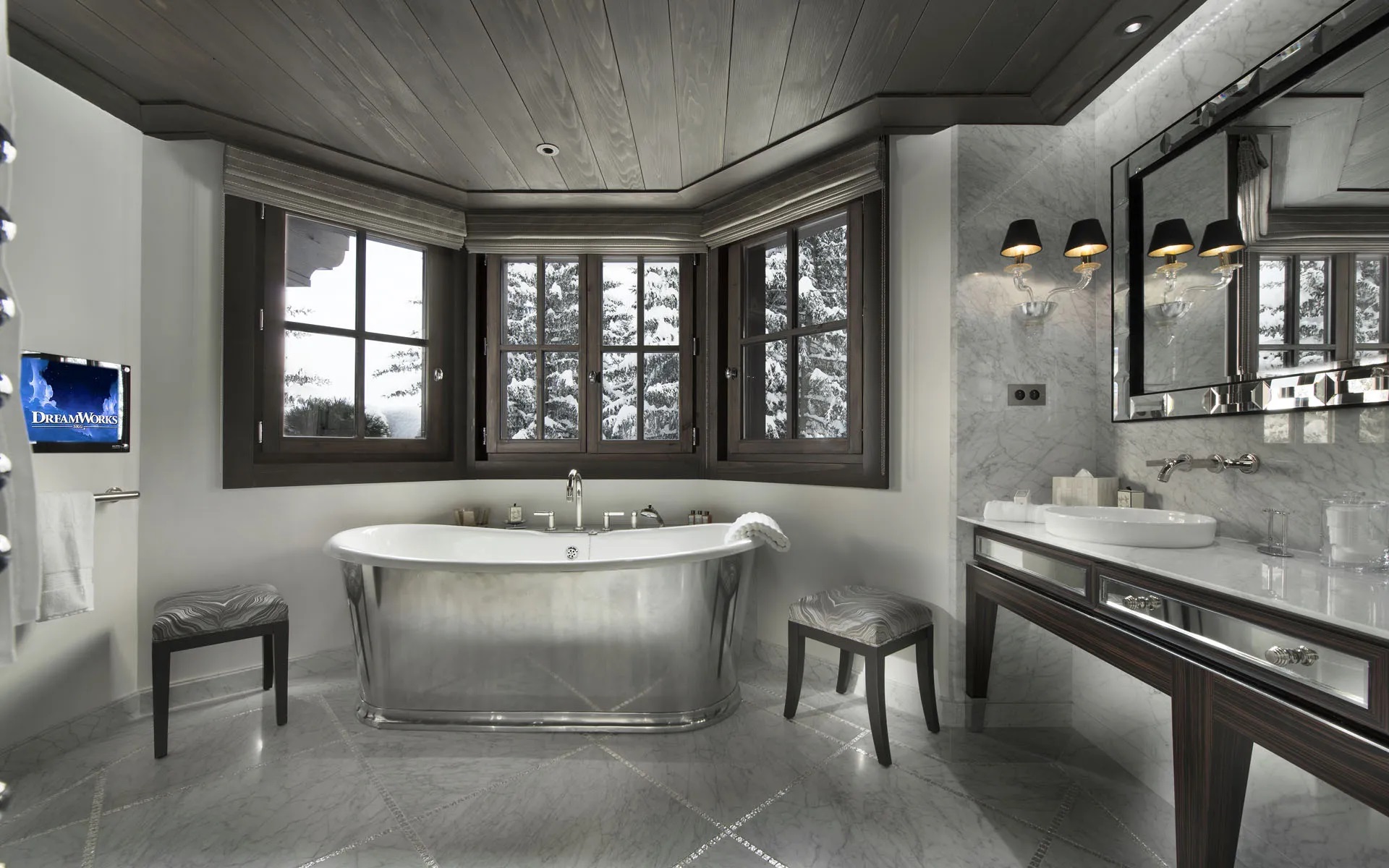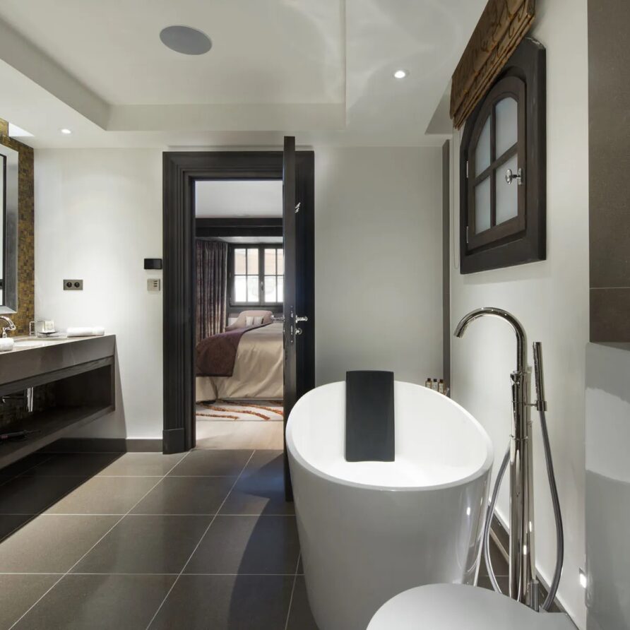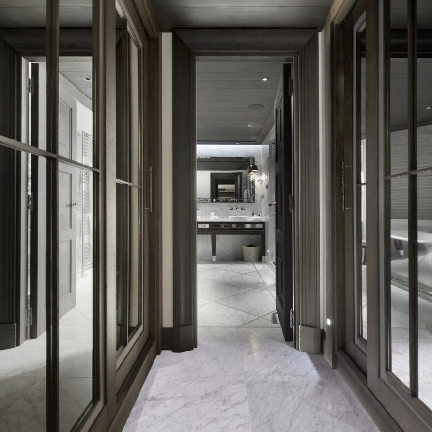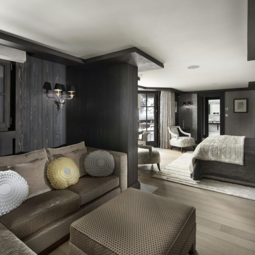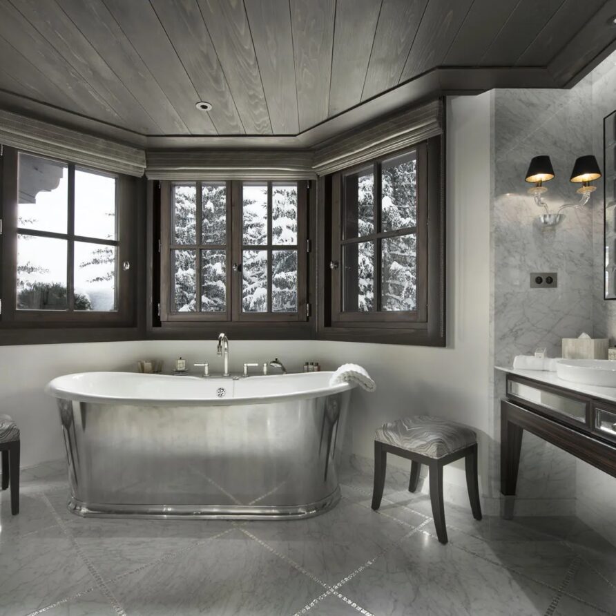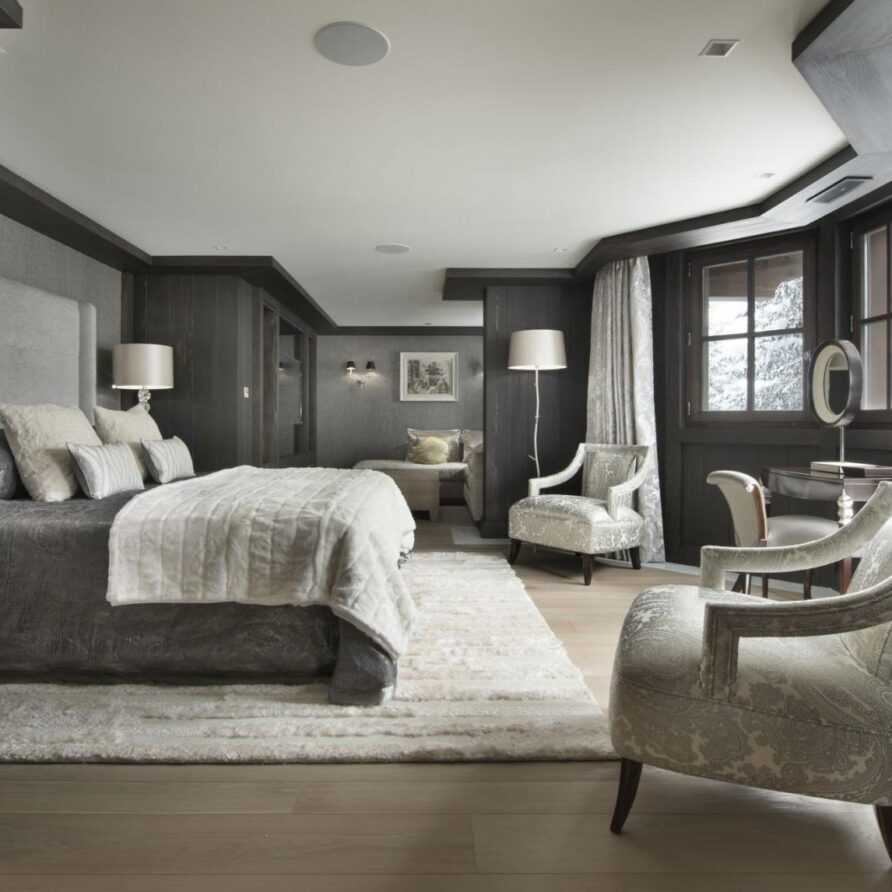The chalet’s 6 bedrooms sleep 12 guests across the 580 sq.m living space the property occupies. The master suite is a lavish haven away from the stresses and strains of everyday life. Tactile materials, muted grey tones, and pops of color create a welcoming environment, while the snug TV corner, and private balcony mean guests in this suite will be hard-pressed to leave it. This is to say nothing of the lavish en-suite bathroom, with free-standing tub and walk-in shower. Further to this are 2 further double bedrooms with luxury en-suite, and 3 double/twin en-suite rooms for complete flexibility.