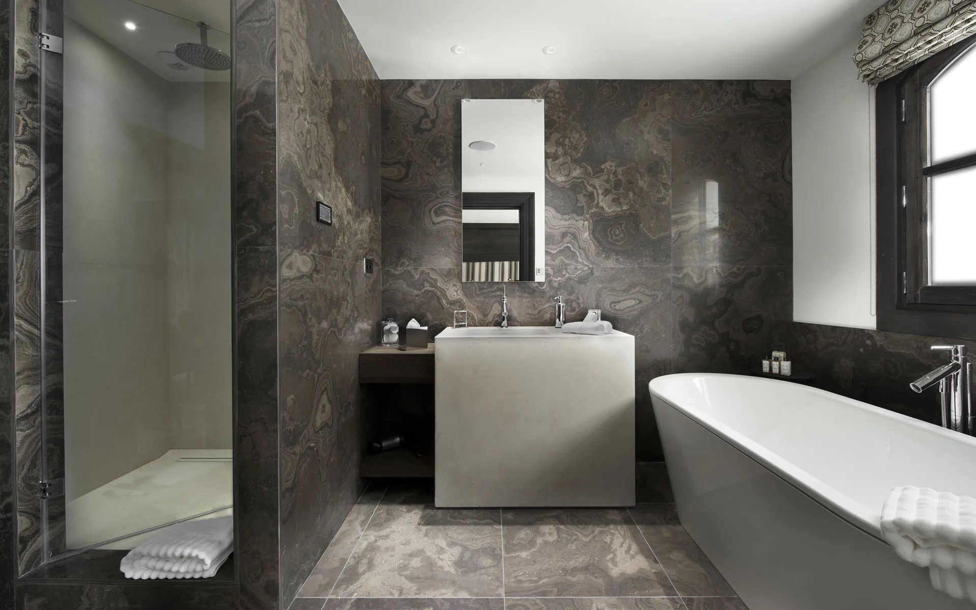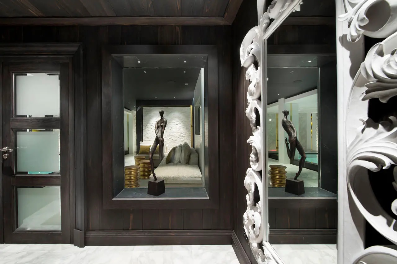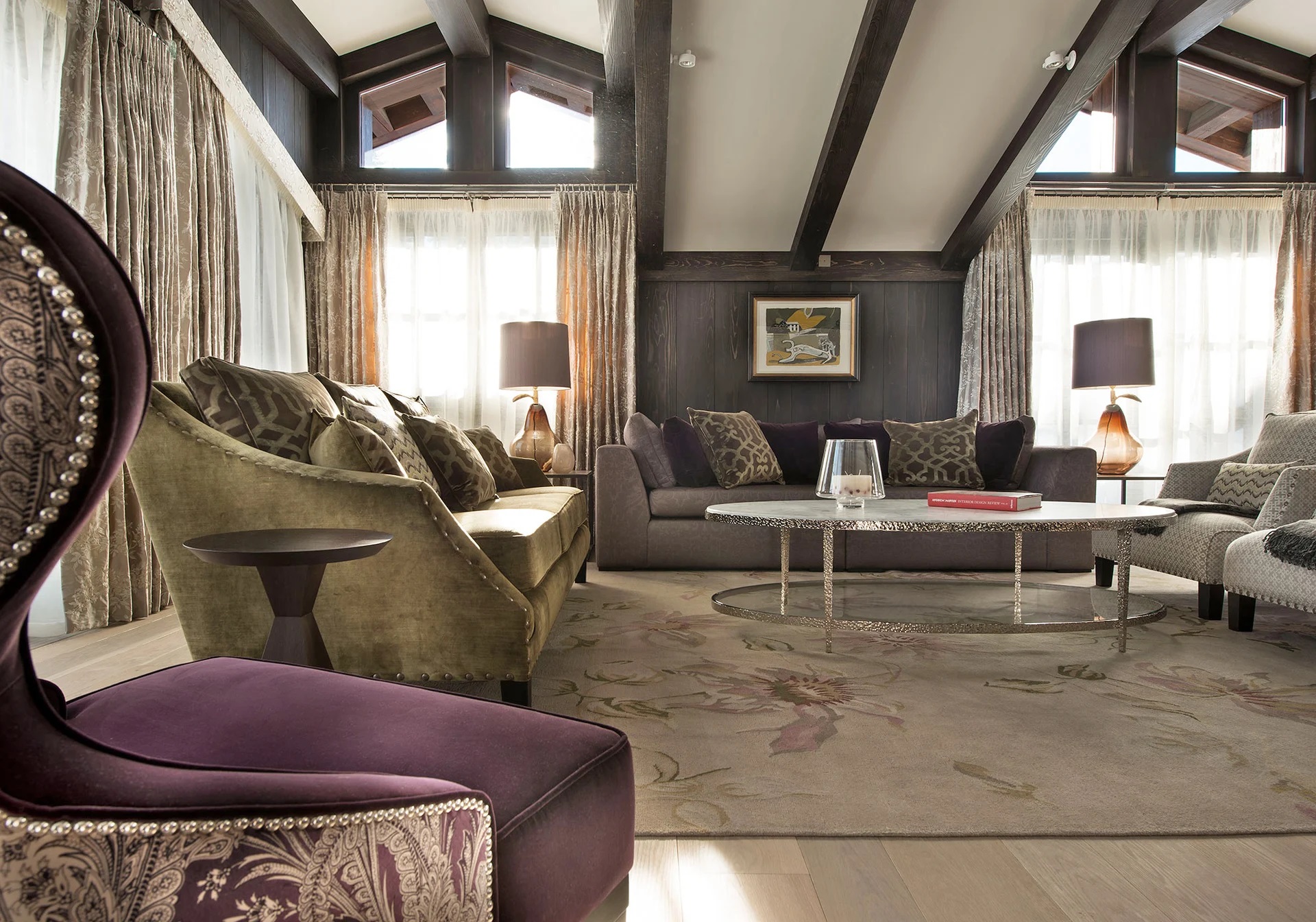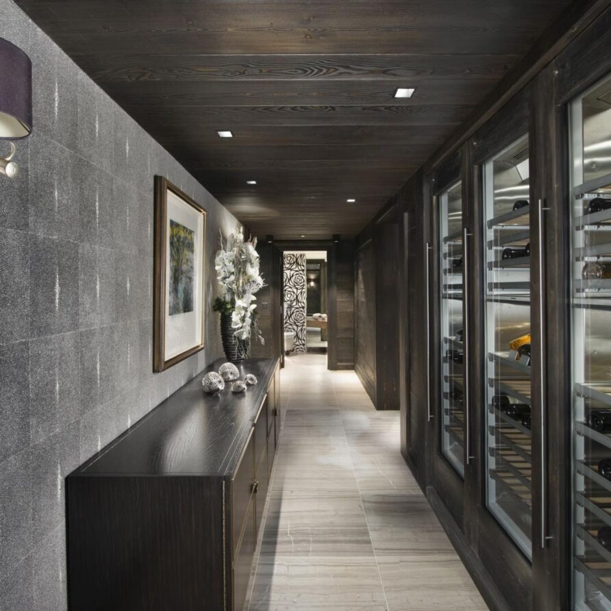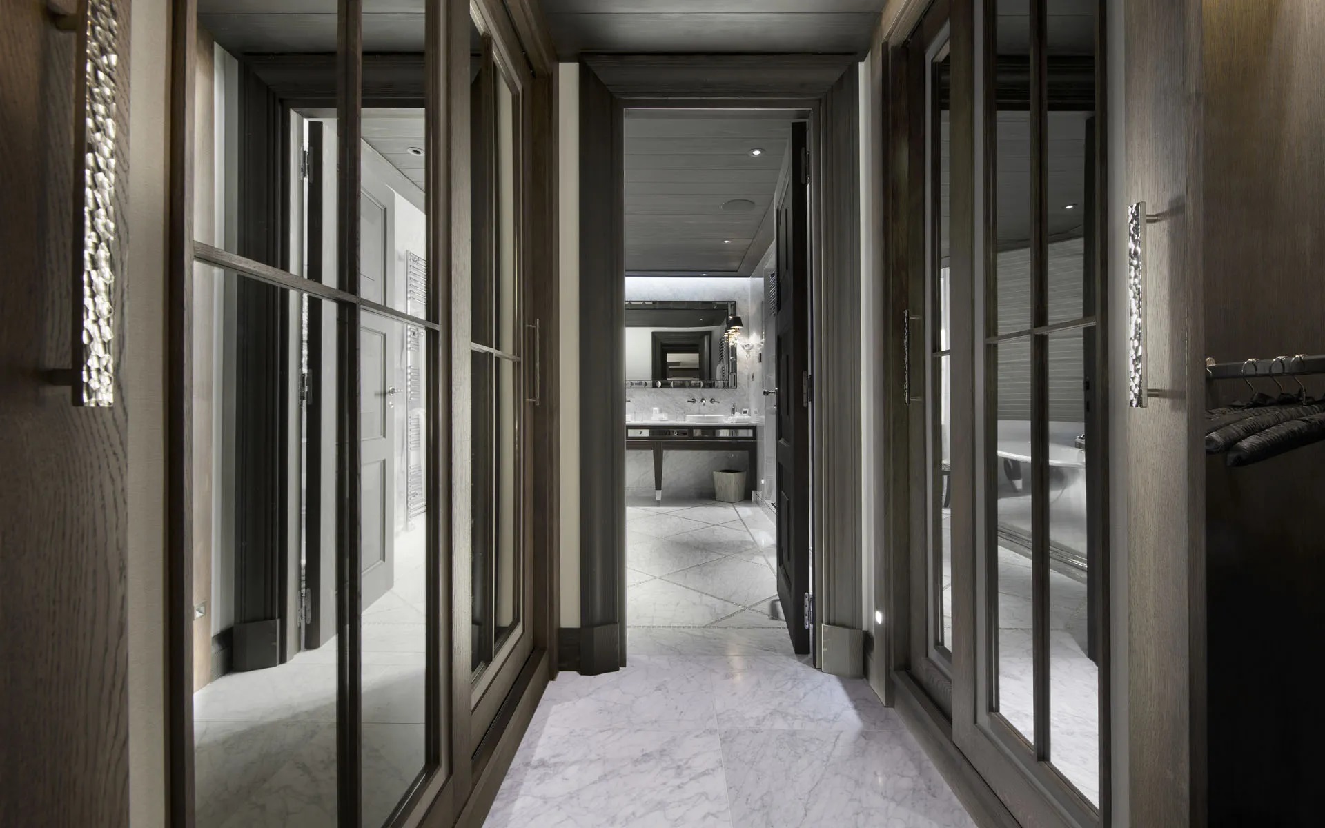 The chalet’s 6 bedrooms sleep 12 guests across the 580 sq.m living space the property occupies. The master suite is a lavish haven away from the stresses and strains of everyday life. Tactile materials, muted grey tones, and pops of color create a welcoming environment, while the snug TV corner, and private balcony mean guests in this suite will be hard-pressed to leave it. This is to say nothing of the lavish en-suite bathroom, with free-standing tub and walk-in shower. Further to this are 2 further double bedrooms with luxury en-suite, and 3 double/twin en-suite rooms for complete flexibility.