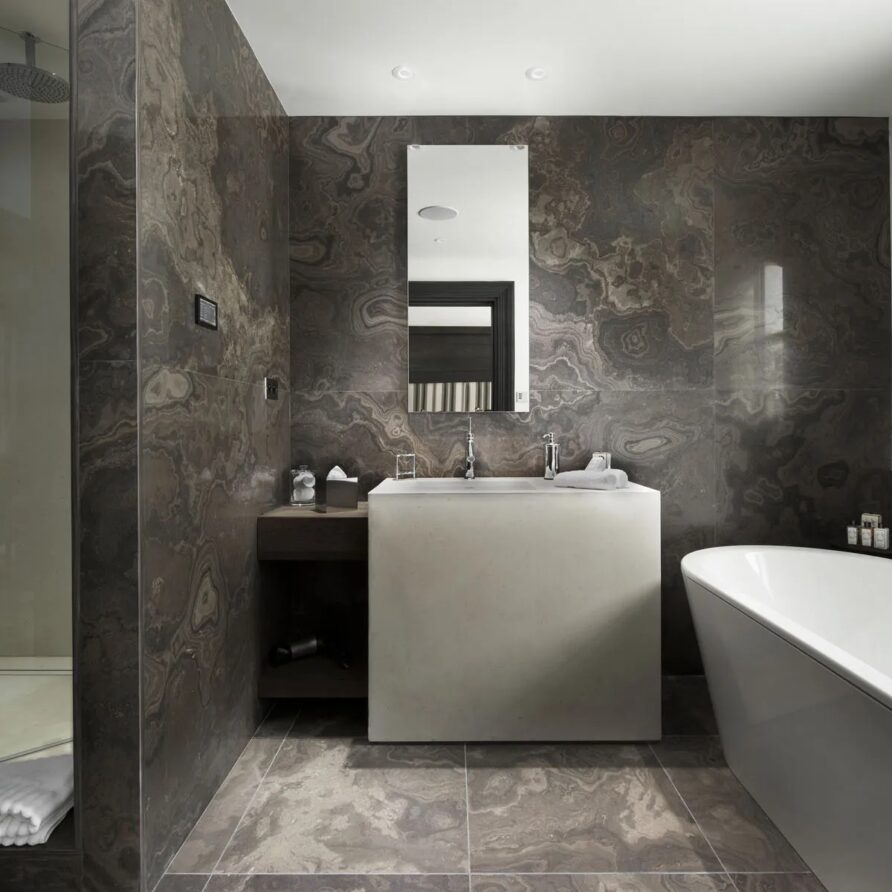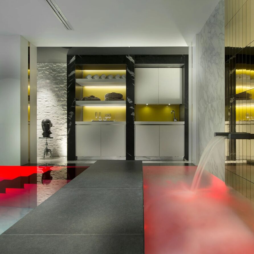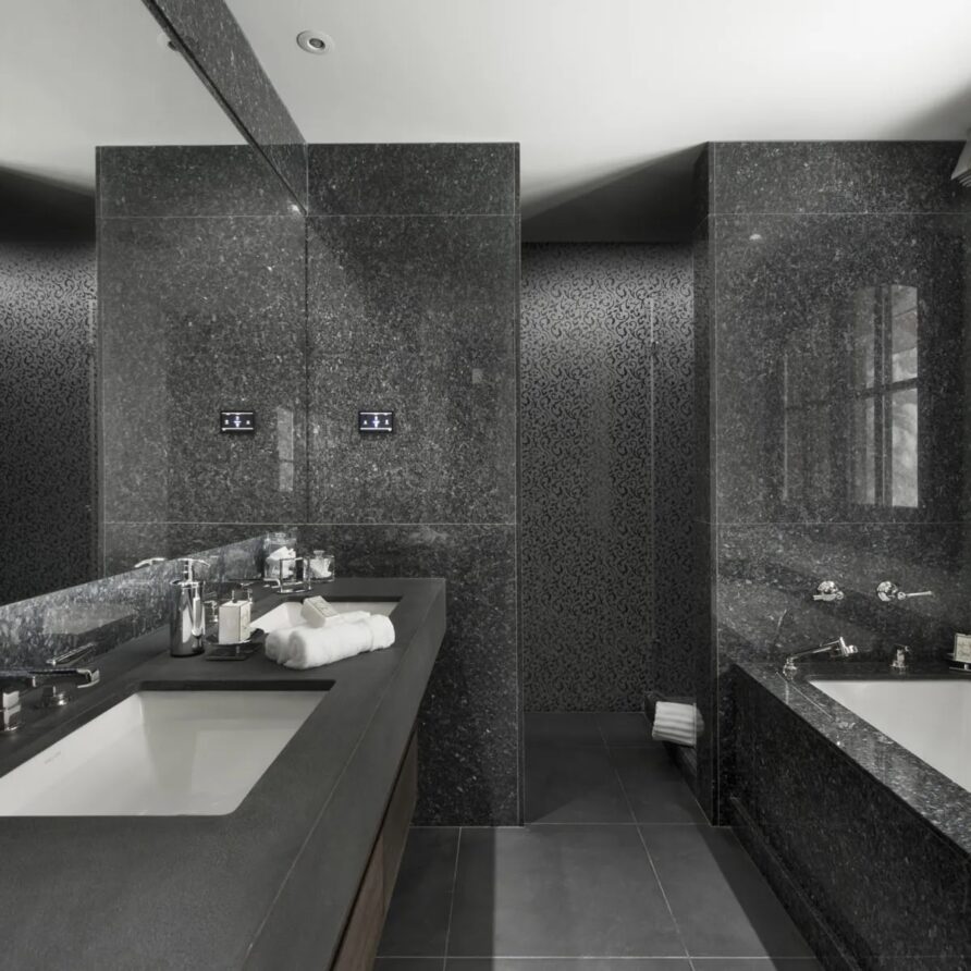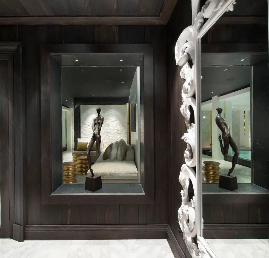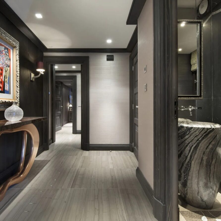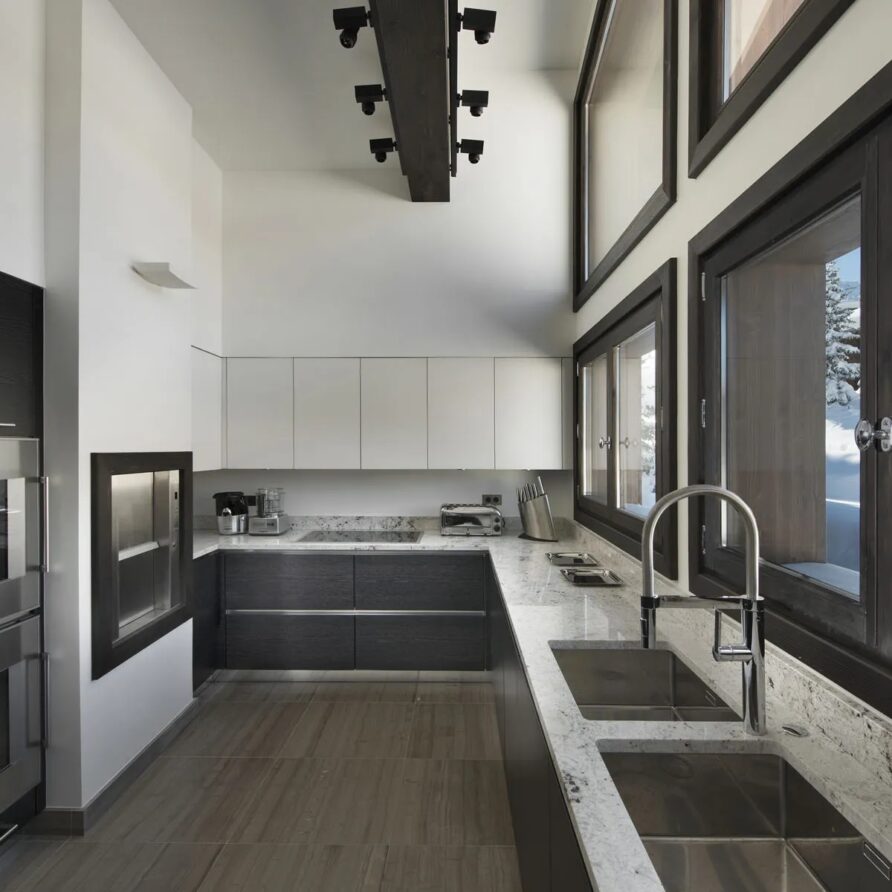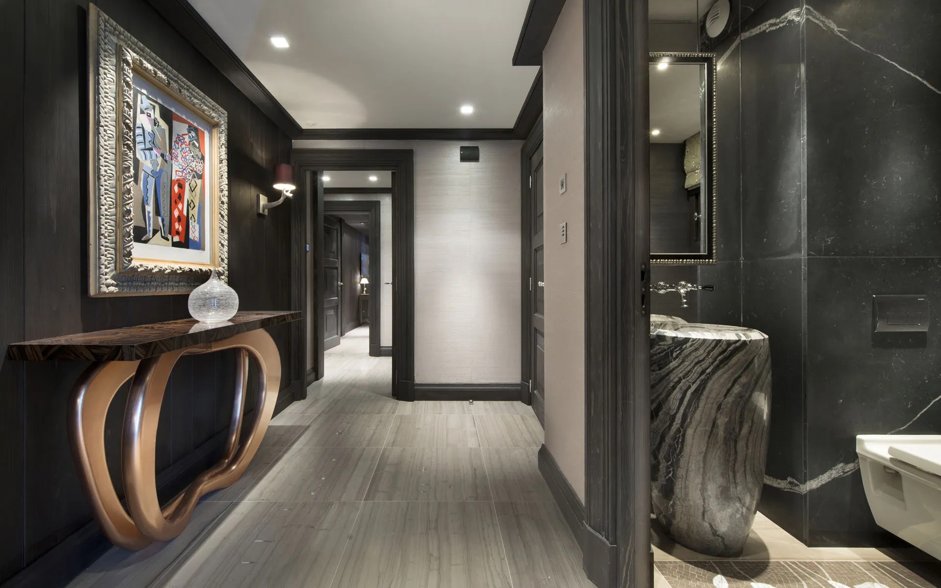 The chalet’s 6 bedrooms sleep 12 guests across the 580 sq.m living space the property occupies. The master suite is a lavish haven away from the stresses and strains of everyday life. Tactile materials, muted grey tones, and pops of color create a welcoming environment, while the snug TV corner, and private balcony mean guests in this suite will be hard-pressed to leave it. This is to say nothing of the lavish en-suite bathroom, with free-standing tub and walk-in shower. Further to this are 2 further double bedrooms with luxury en-suite, and 3 double/twin en-suite rooms for complete flexibility.