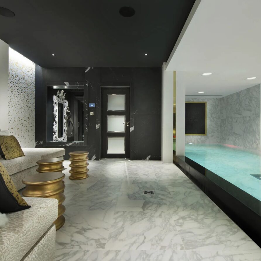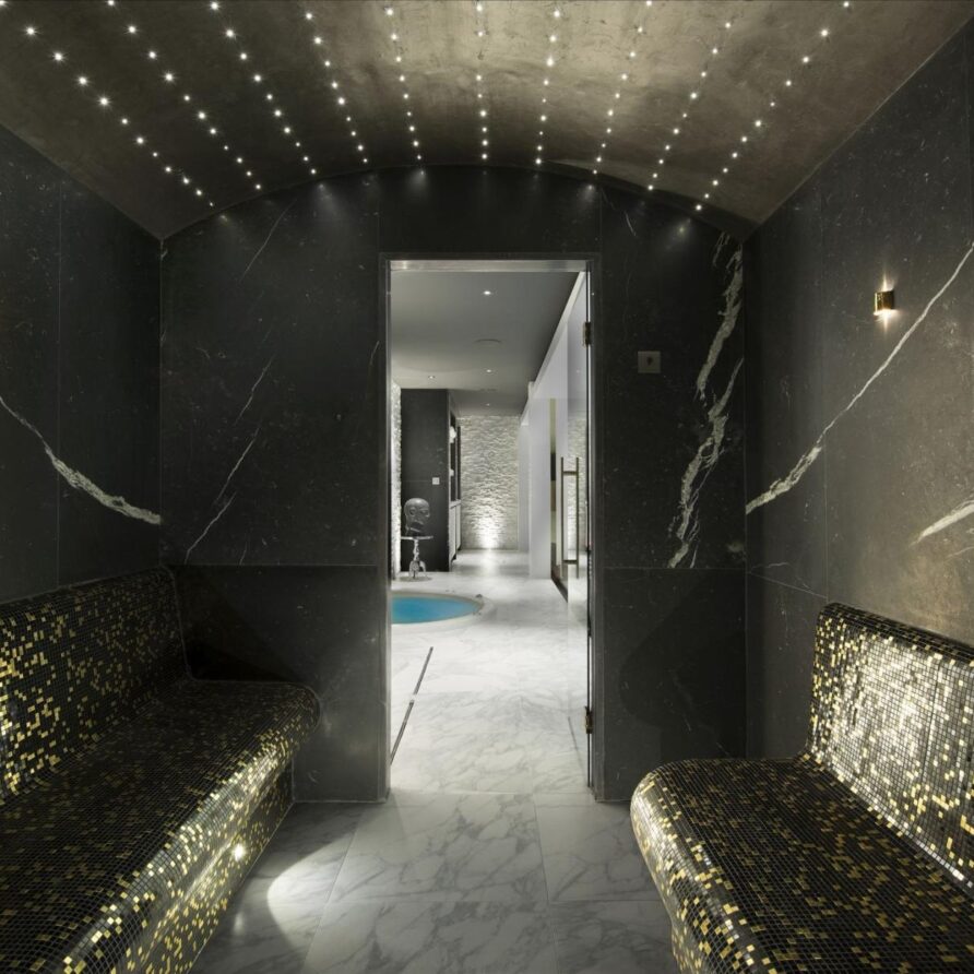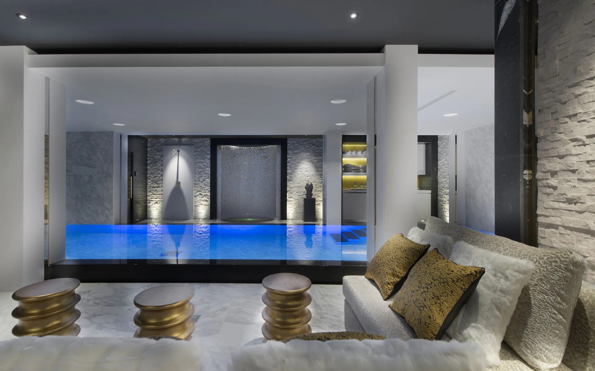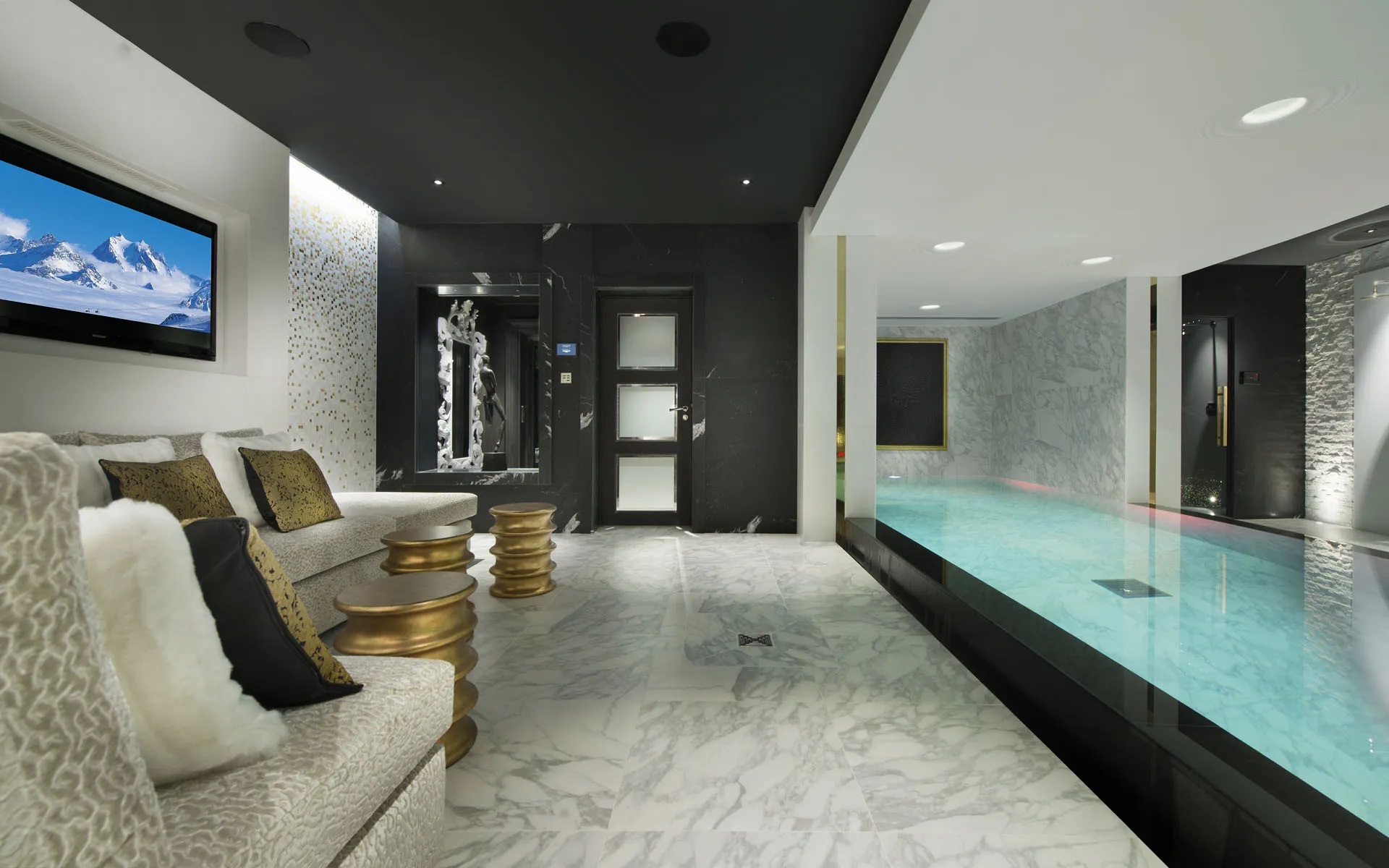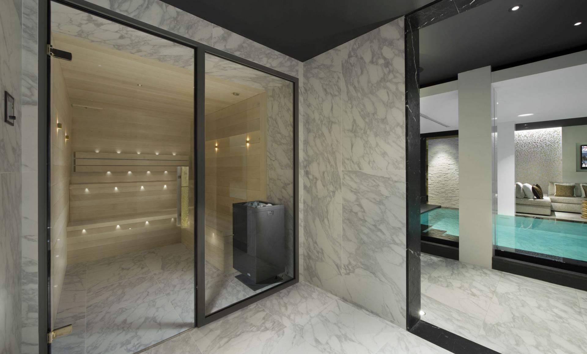While the living area is a relaxing space, the chalet benefits from a showstopping private spa and wellness area. There’s a large 10m chalet swimming pool, an indoor hot tub, sauna, hammam, and treatment room for post-ski massages. For working out the chalet benefits from a well-appointed fitness suite with a variety of free-weights and cardio options.