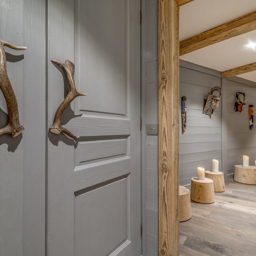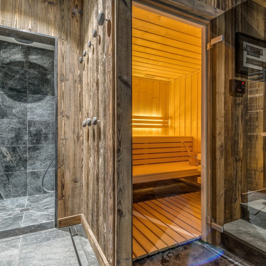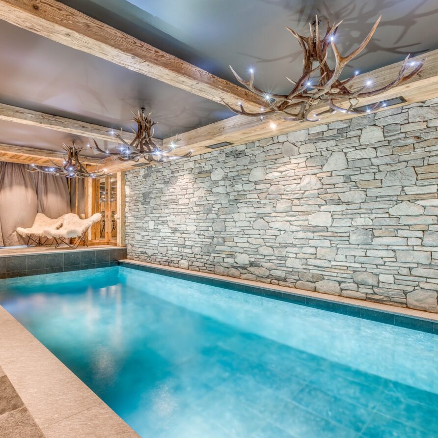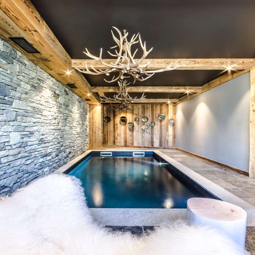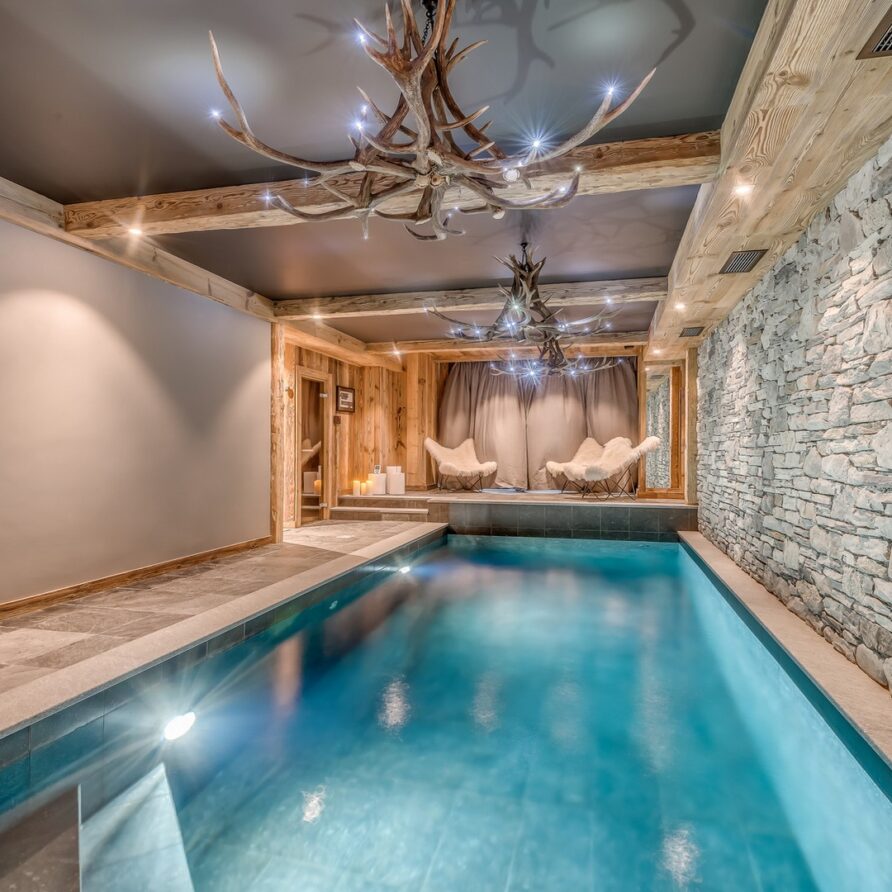 The lowest floor of the chalet holds a further 150sqm of floor space consisting of a sauna, a massage room and a stunning pool and relaxation area. The main garage is also on this level where you will find the ski room and boot warmers.