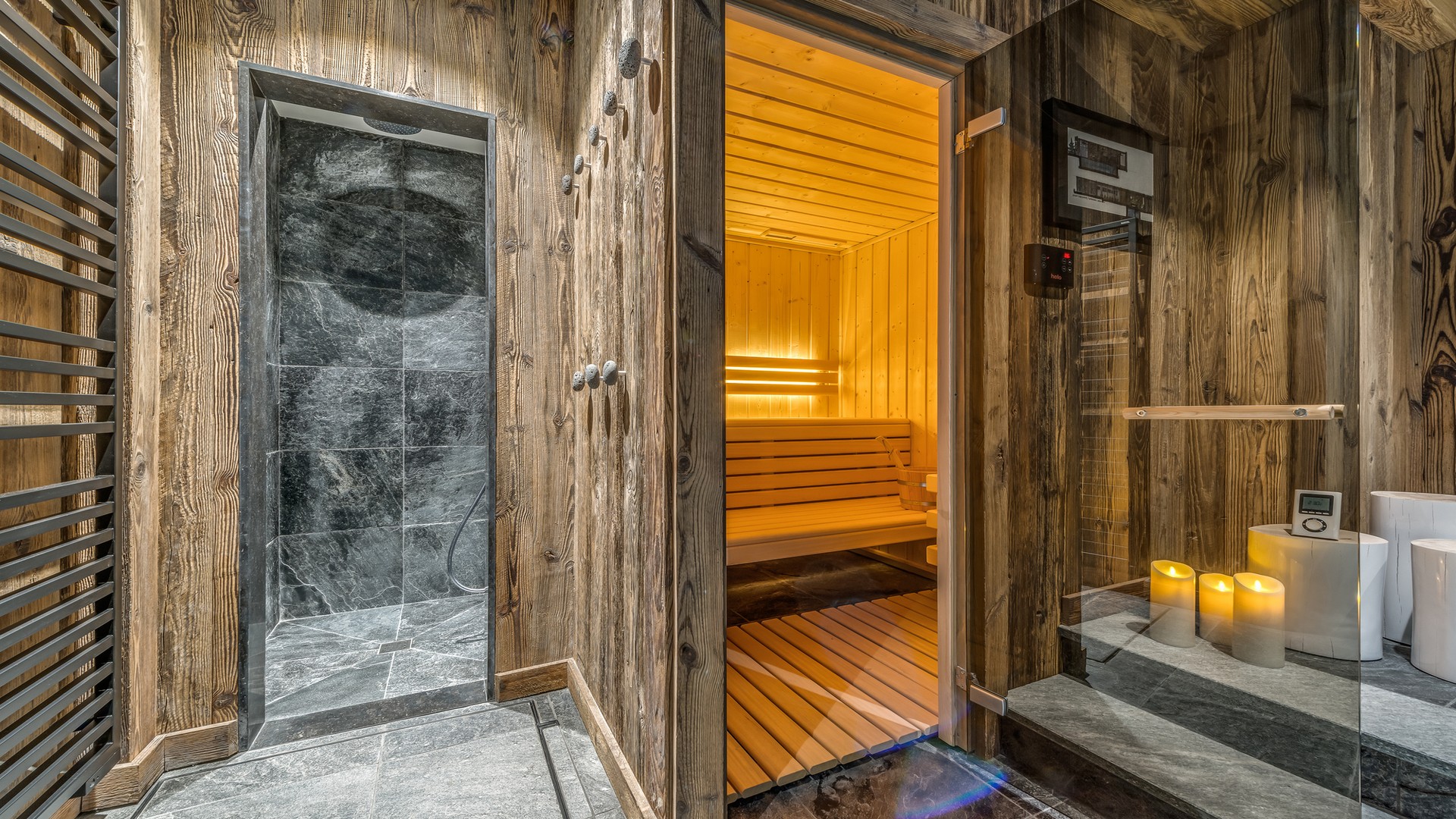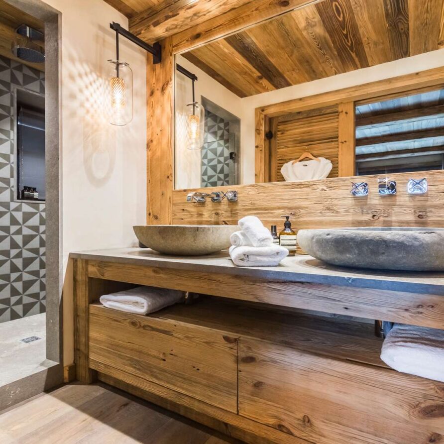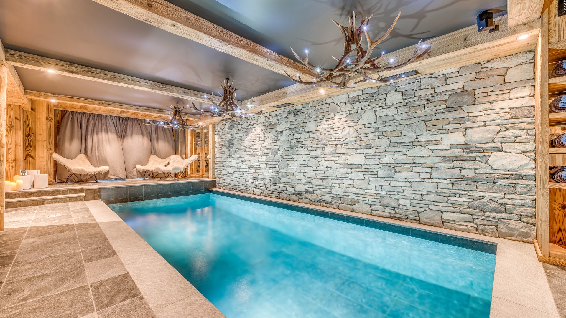 The lowest floor of the chalet holds a further 150sqm of floor space consisting of a sauna, a massage room and a stunning pool and relaxation area. The main garage is also on this level where you will find the ski room and boot warmers.