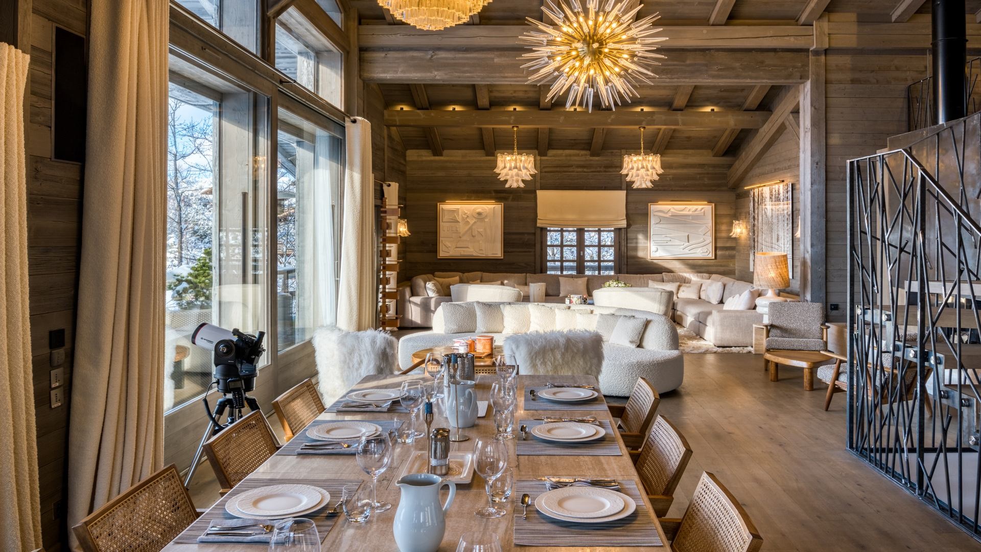 An impressive chalet houses grand interiors inside the chalet, where a magnificent, light-filled living area can be found on the first floor. A refined, contemporary finish shines under the light pouring through the chalet’s large windows. Leading out of these sliding double doors, guests will find a balcony, furnished with outdoor seating and a table, perfect for soaking up the sun, alfresco dinners or gaining a closer look at your surrounding views. Back inside, the chalet living spaces are split into three distinct sections. On one side, a homely sofa lounge corner can be found, adjacent to a fireplace. Towards the other side of this room is a large dining table, positioned under hanging lights and antlers, the perfect setting for your evening meals. The chalet’s fully-equipped kitchen, next to the dining table, will provide plenty of space for your nominated cook to prepare your evening meals, before enjoying your meals as a whole group.