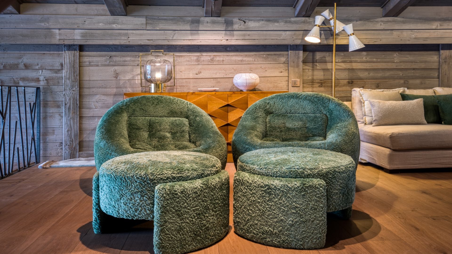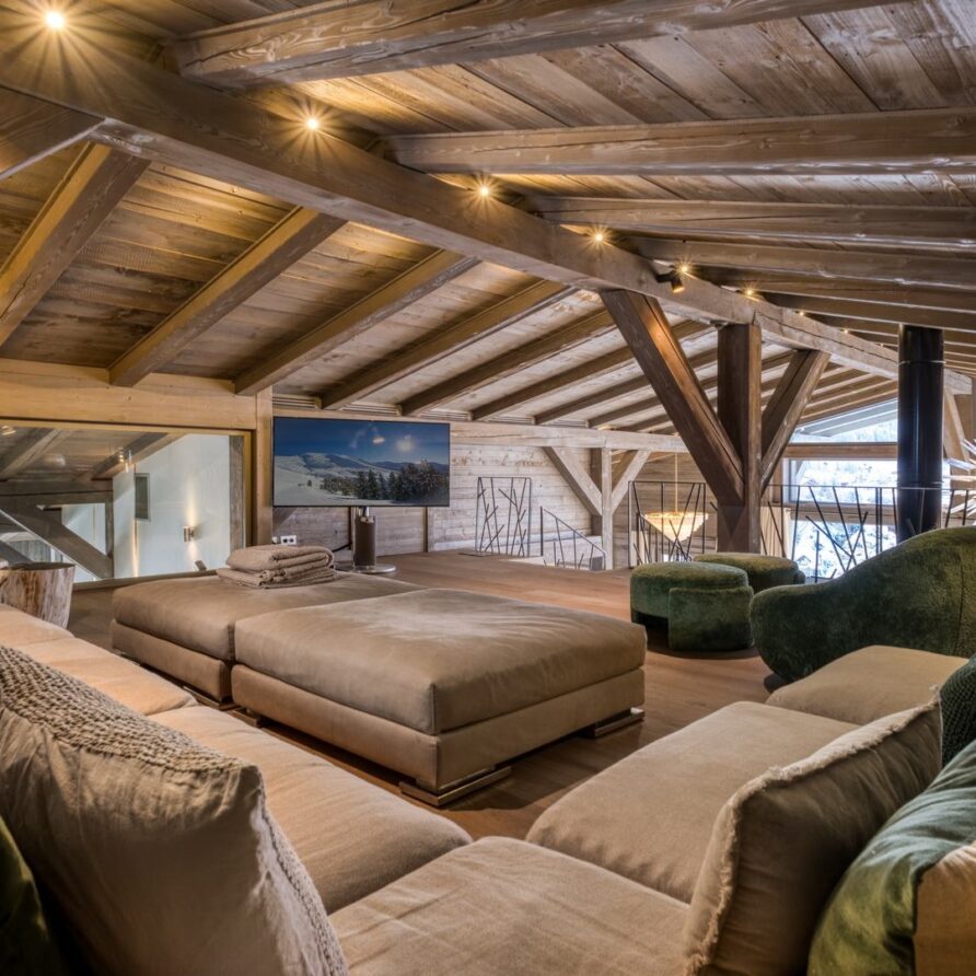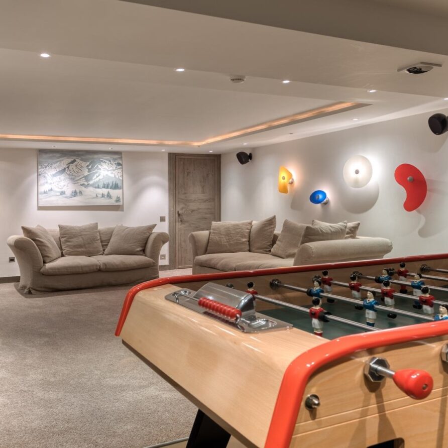 The chalet mezzanine floor is home to a cosy reading/TV snug. Found in the eaves of the property, above the main living area, here lies a comfortable space to relax to the TV, seated on sumptuous sofas or welcoming armchairs. In view of the swimming pool, it’s the perfect spot for adults to enjoy a good book whilst keeping a watchful eye on younger members in the wellness area down below. There is also an additional TV snug area, with a football table, offering an ideal hideaway for teenagers or for those who wish to catch up on their latest series in more privacy.