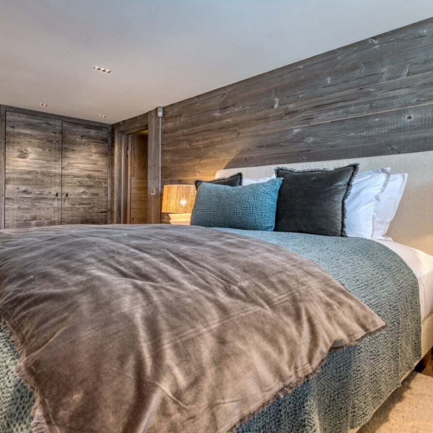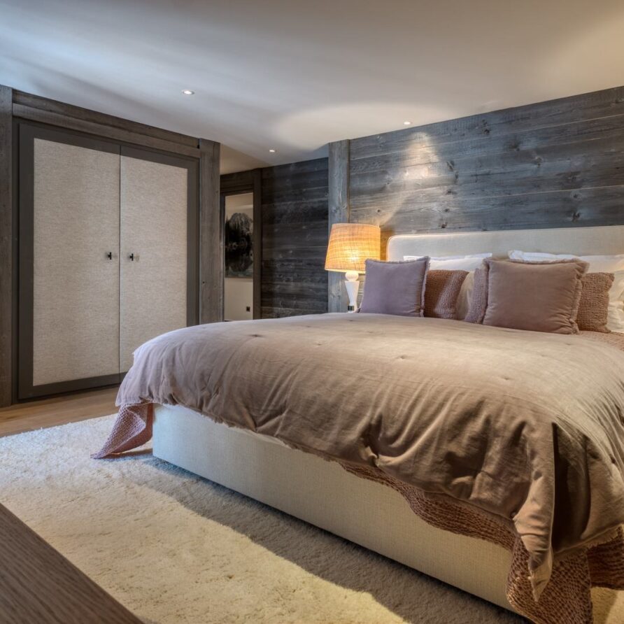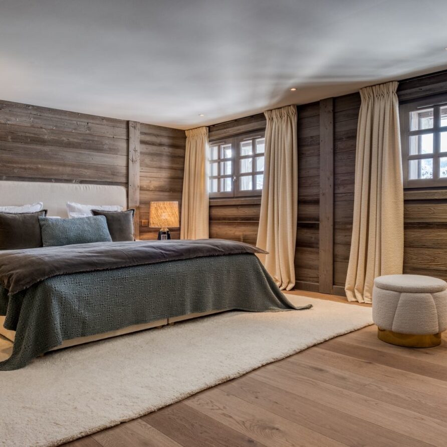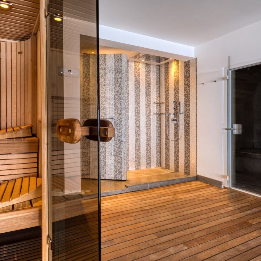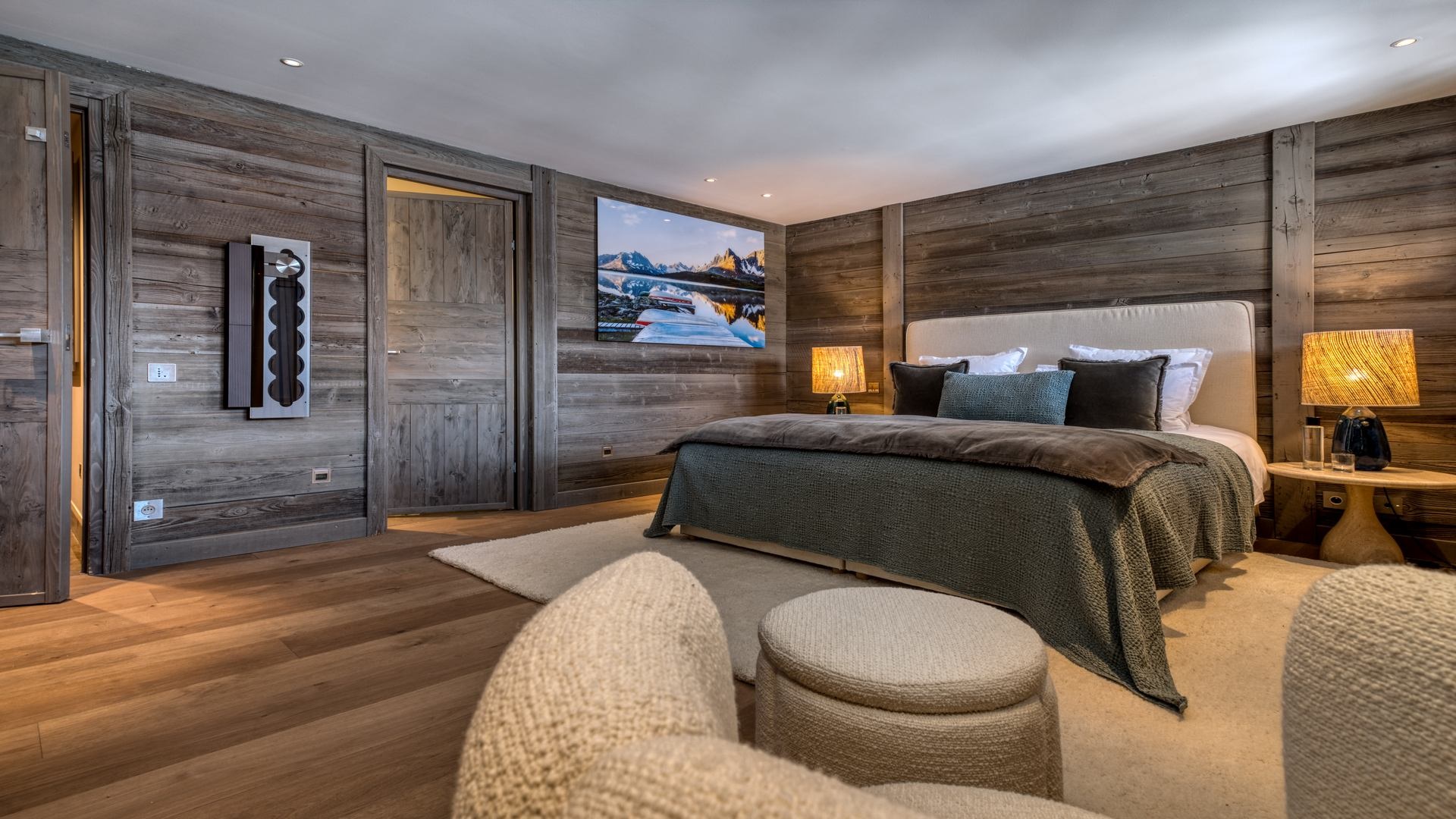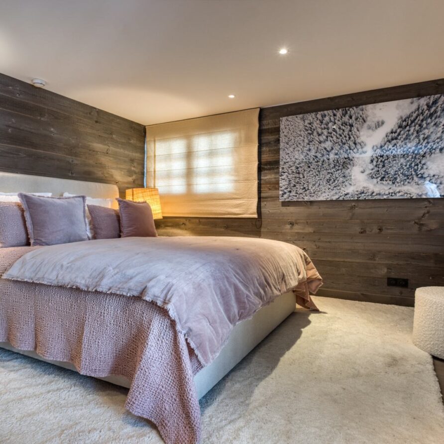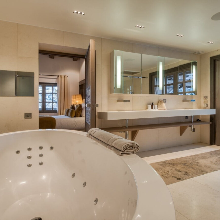 The chalet accommodates groups of 12 guests amongst its 6 delightful bedrooms. The main bedroom floor is the chalet’s garden level, where all except the master bedroom are found. Lovingly finished with natural materials, such as wood, leather and sheepskins, these private settings present a real luxury cocoon to unwind in at the end of the day, with beautifully complemented en-suite bathrooms, rivaling those found in luxury boutique hotels. The chalet first floor is home to the master double bedroom. Featuring plenty of space, this bedroom also has the additional luxury of direct access to the wellness area, leading on through the bedroom’s en-suite facilities.