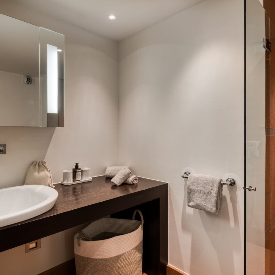 The stay was very pleasant, everything was very new and we felt very comfortable. Communication was also smooth. The kitchen is fully equipped, the living room is spacious, able to accommodate many people. The bedrooms are spacious with their own bathrooms. Great gym and very clean sauna and pool. The pool is heated by the way!