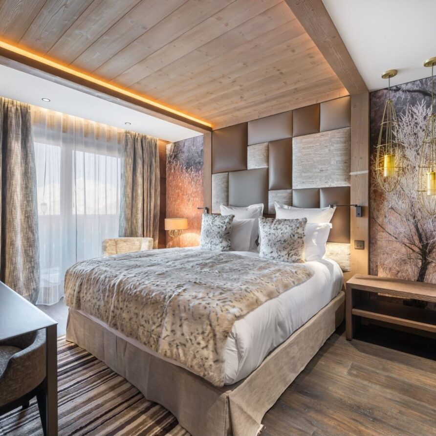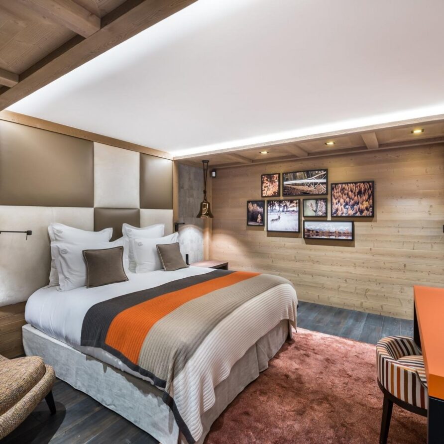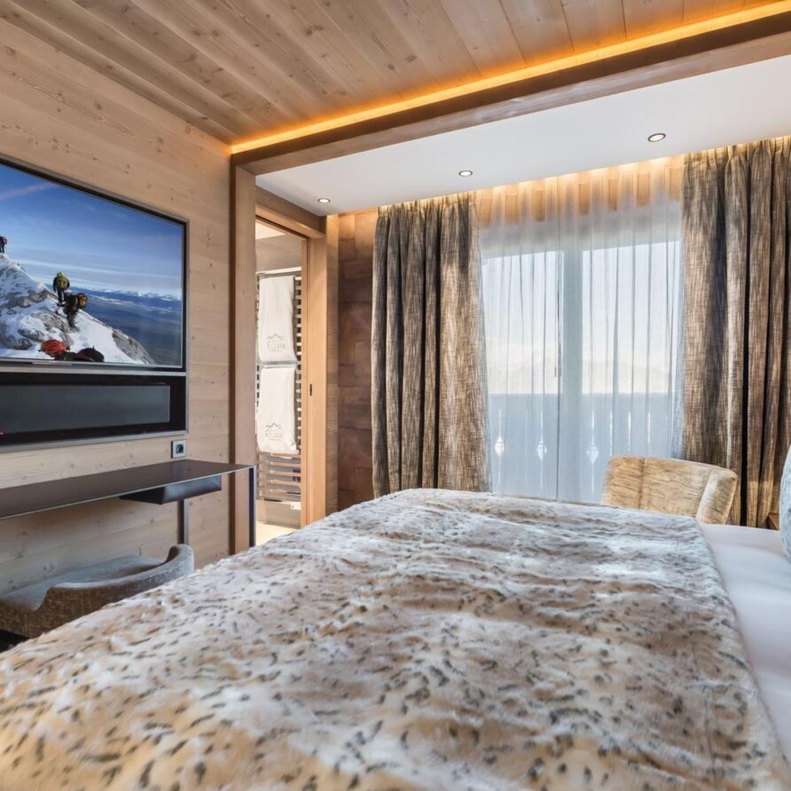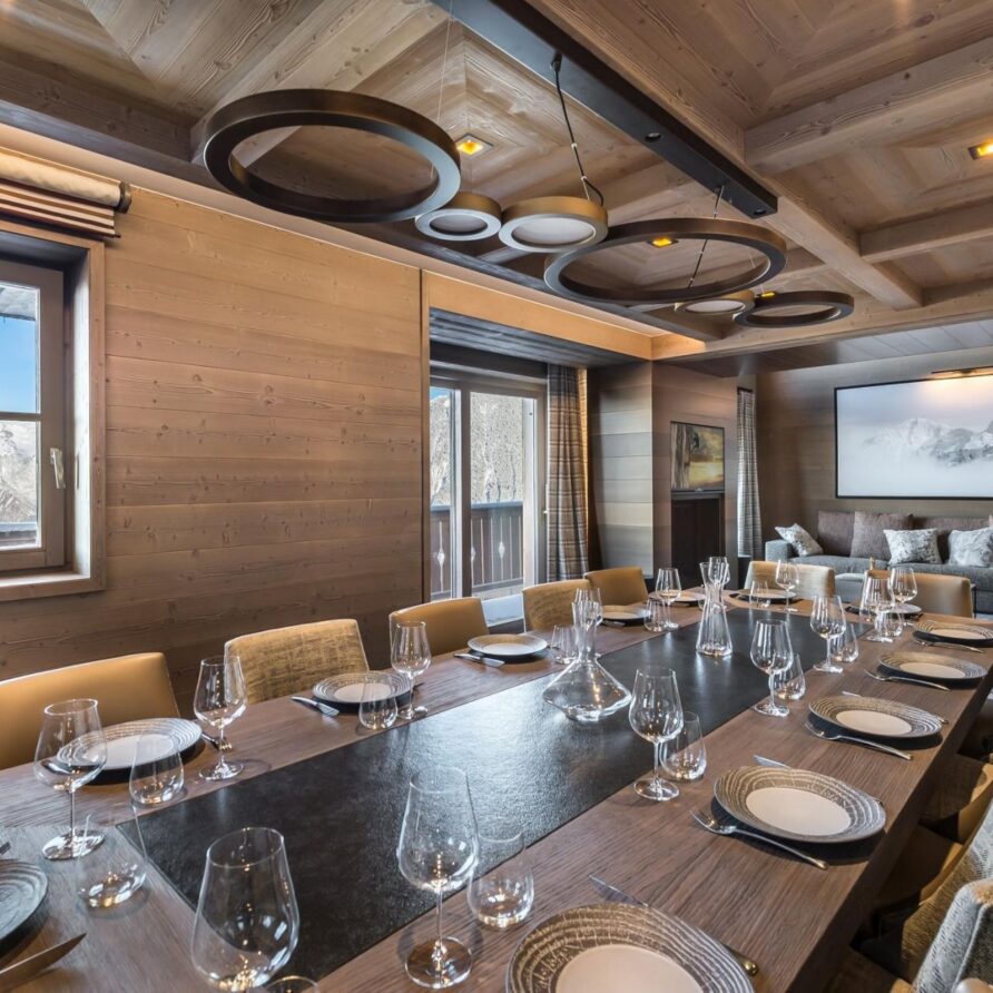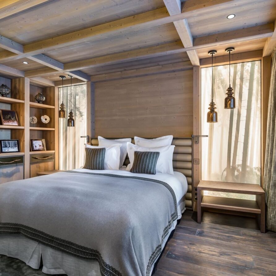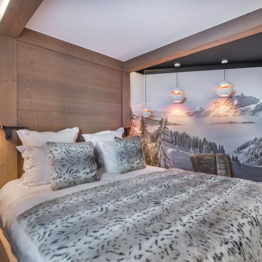 The chalet is pure contemporary ski chalet indulgence. This luxury chalet has a gorgeous chocolate box exterior, whilst inside you’ll find sleek lines, an opulent style, a whole host of entertainment and wellness facilities, and an experienced team to ensure your every comfort. This is a luxury chalet with a swimming pool, with room for up to 14 guests across its 6 bedrooms, making for a delightful large group ski holiday.