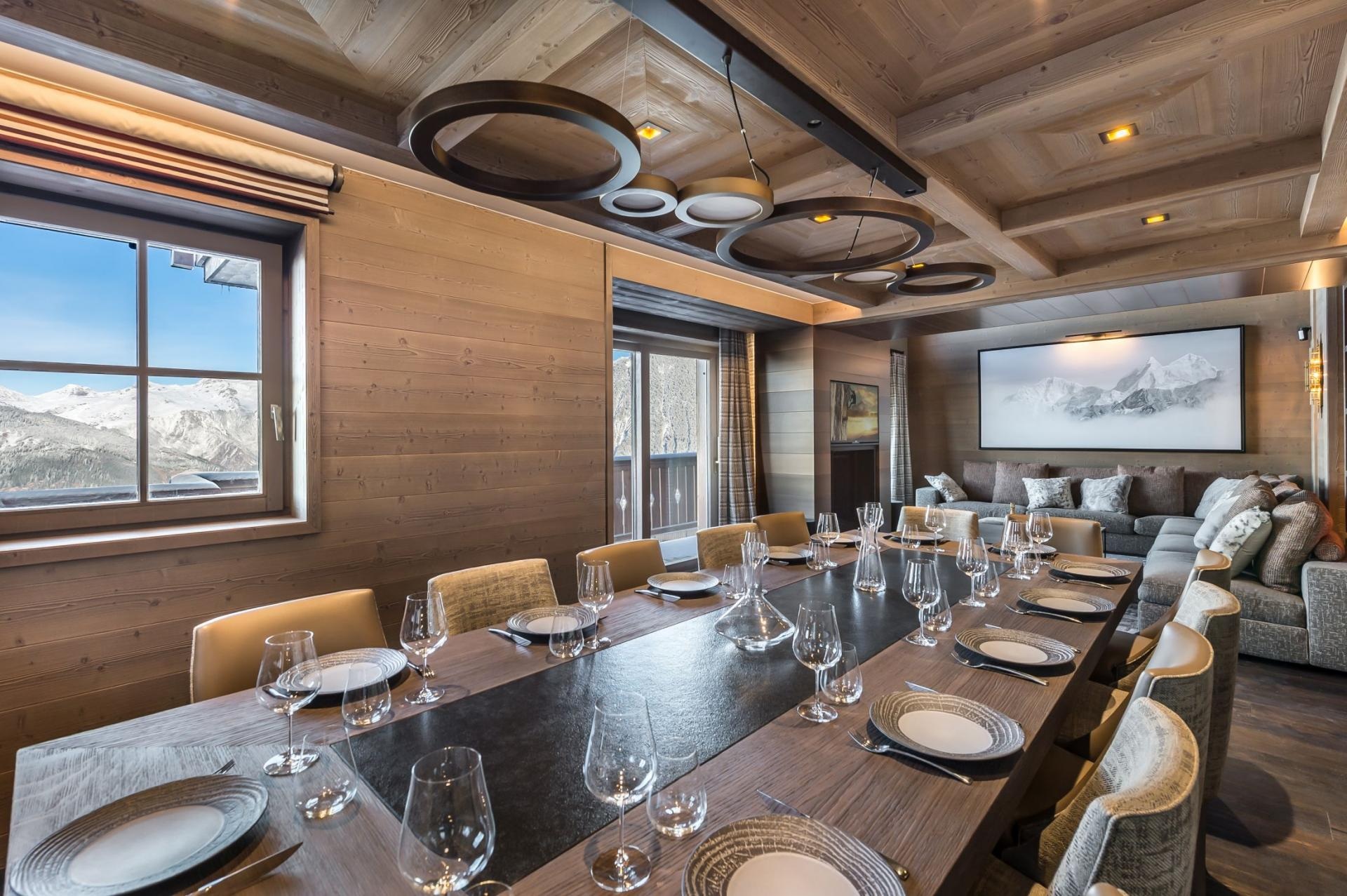 The sociable living and dining room is on the second floor and leads directly onto a wrap-around balcony and the endless views beyond. An enormous corner sofa invites guests to snuggle up in front of the fire with a hot chocolate after a day cruising famous corduroy pistes. The neighboring dining table comfortably has room for all 14 guests, and the dual aspect windows, plus feature lighting, ensure this is a welcoming spot, whether for a hearty breakfast or gourmet evening meal. This level also houses the professional kitchen where these culinary delights are created.