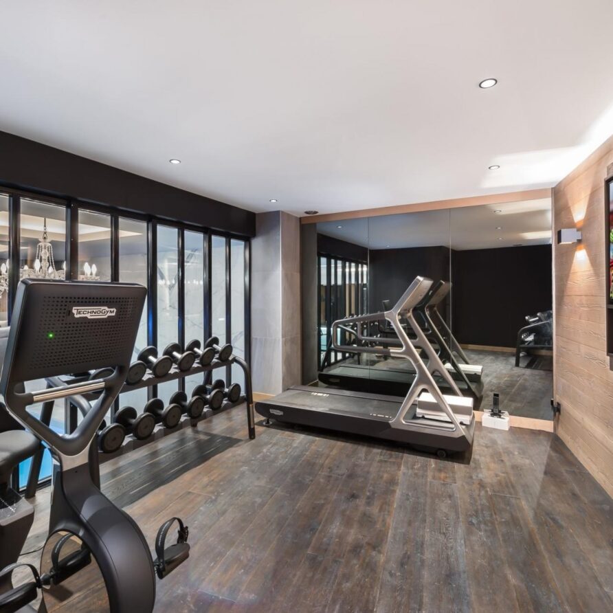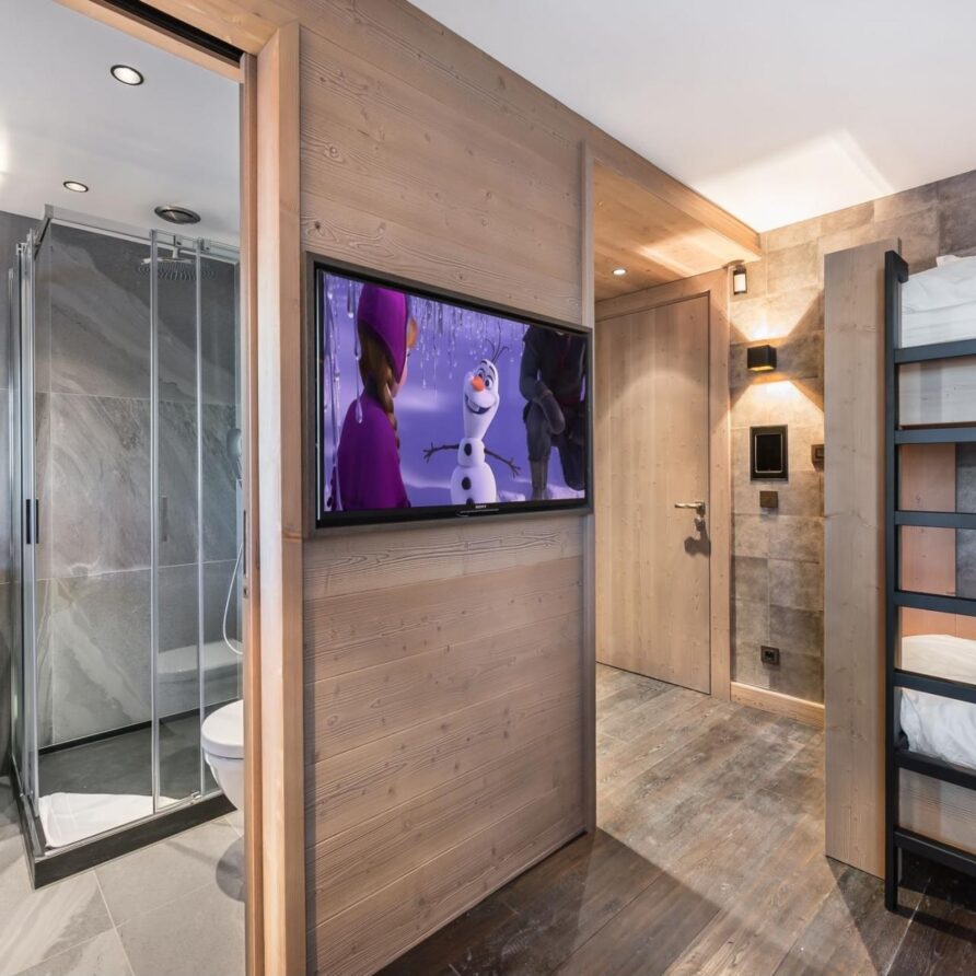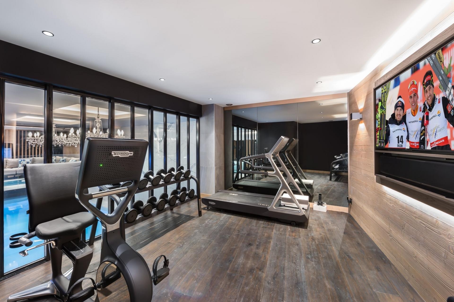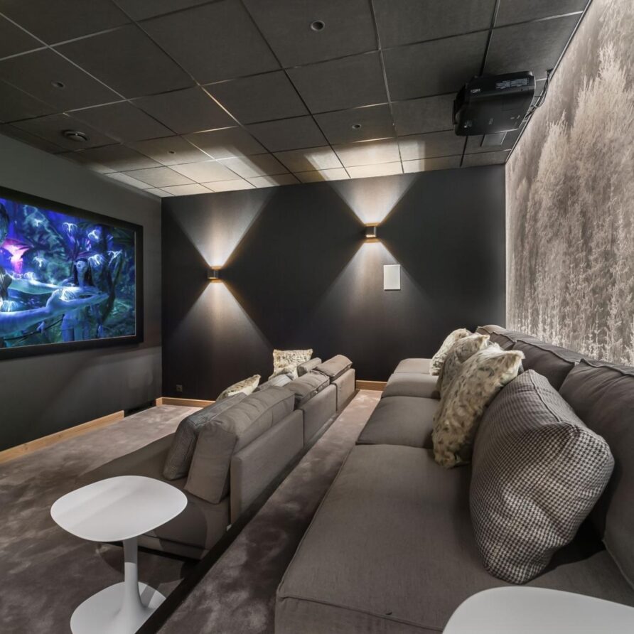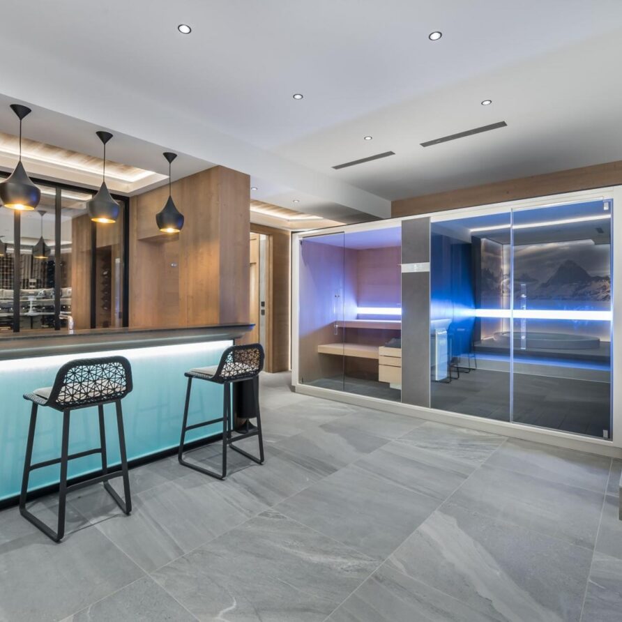 As befits any super-luxury ski chalet has designated an entire floor to wellness and entertainment. This ski chalet swimming pool is a good size and features a mezzanine chill out spot for relaxing post-swim. There’s also an indoor hot tub, treatment room, sauna and Hammam. Completing the wellness suite are a fitness room and a bar, so whether you’re a gym bunny or prefer relaxing with a glass of something sparkling, you’ll find the facility that matches your needs! Also, on this floor is the chalet’s lovely cinema room, the perfect space to enjoy big-screen blockbusters. You will also find down here the well-stocked wine cellar, should you fancy a tempting vintage while you enjoy the film.