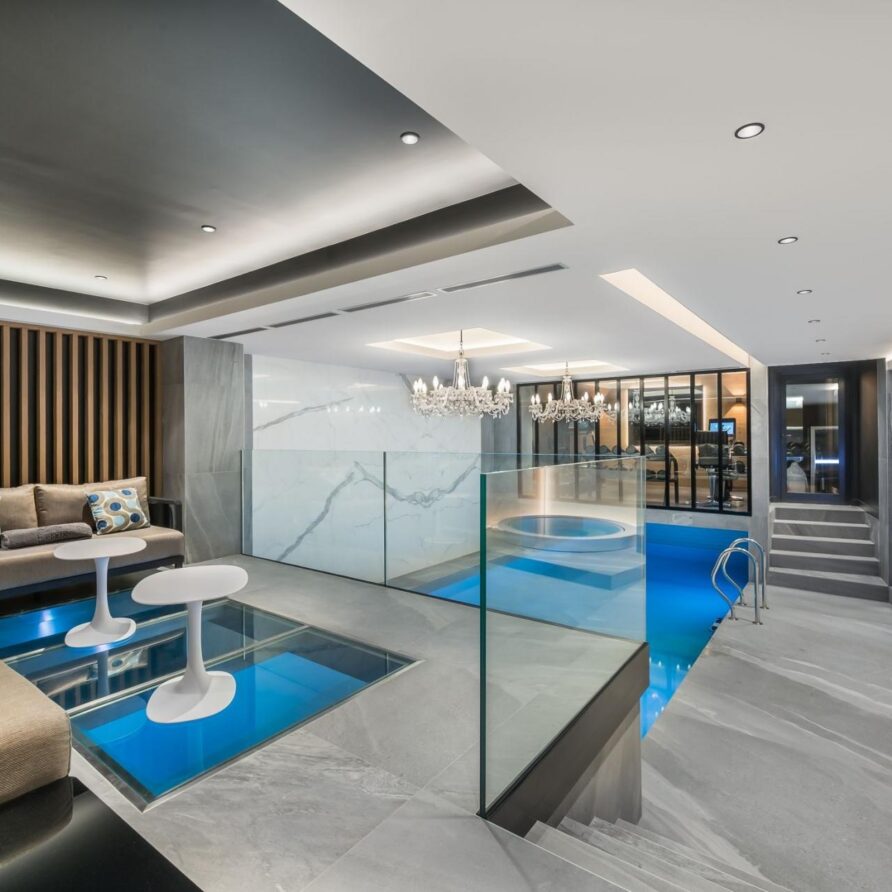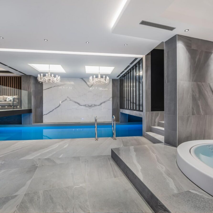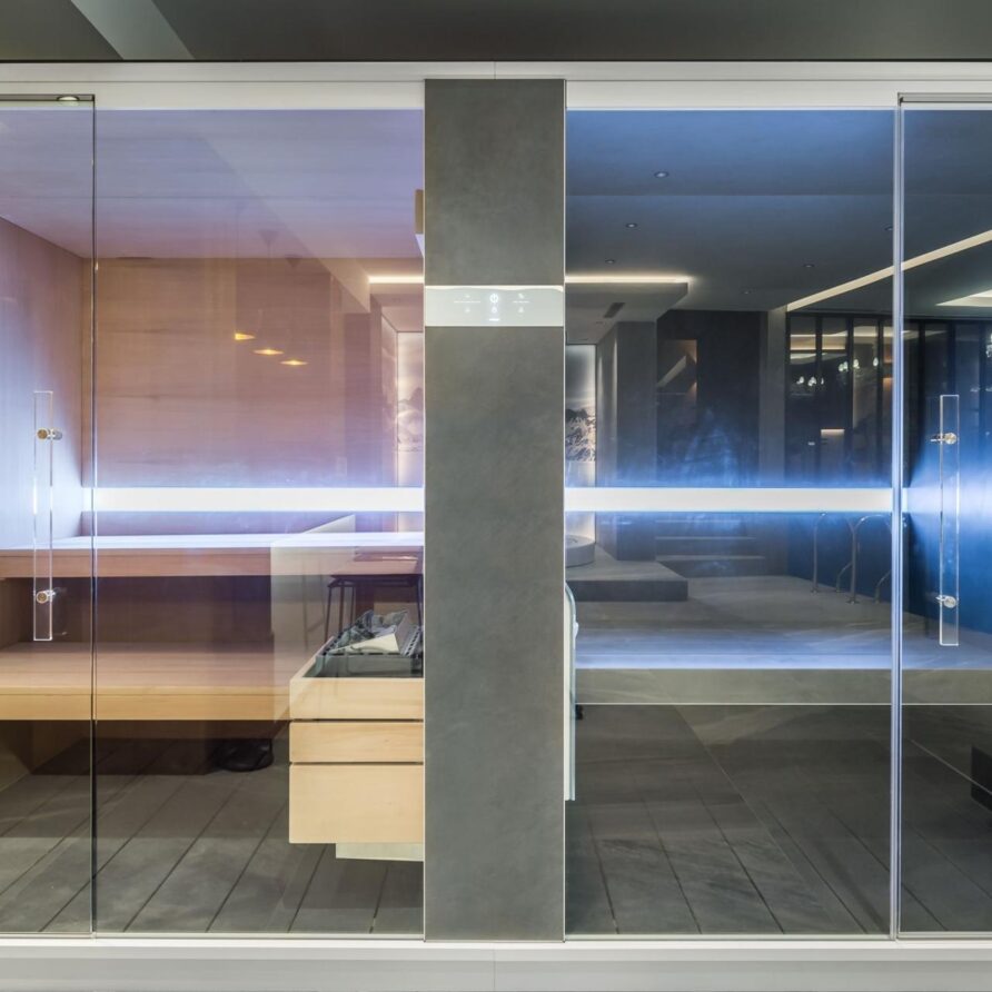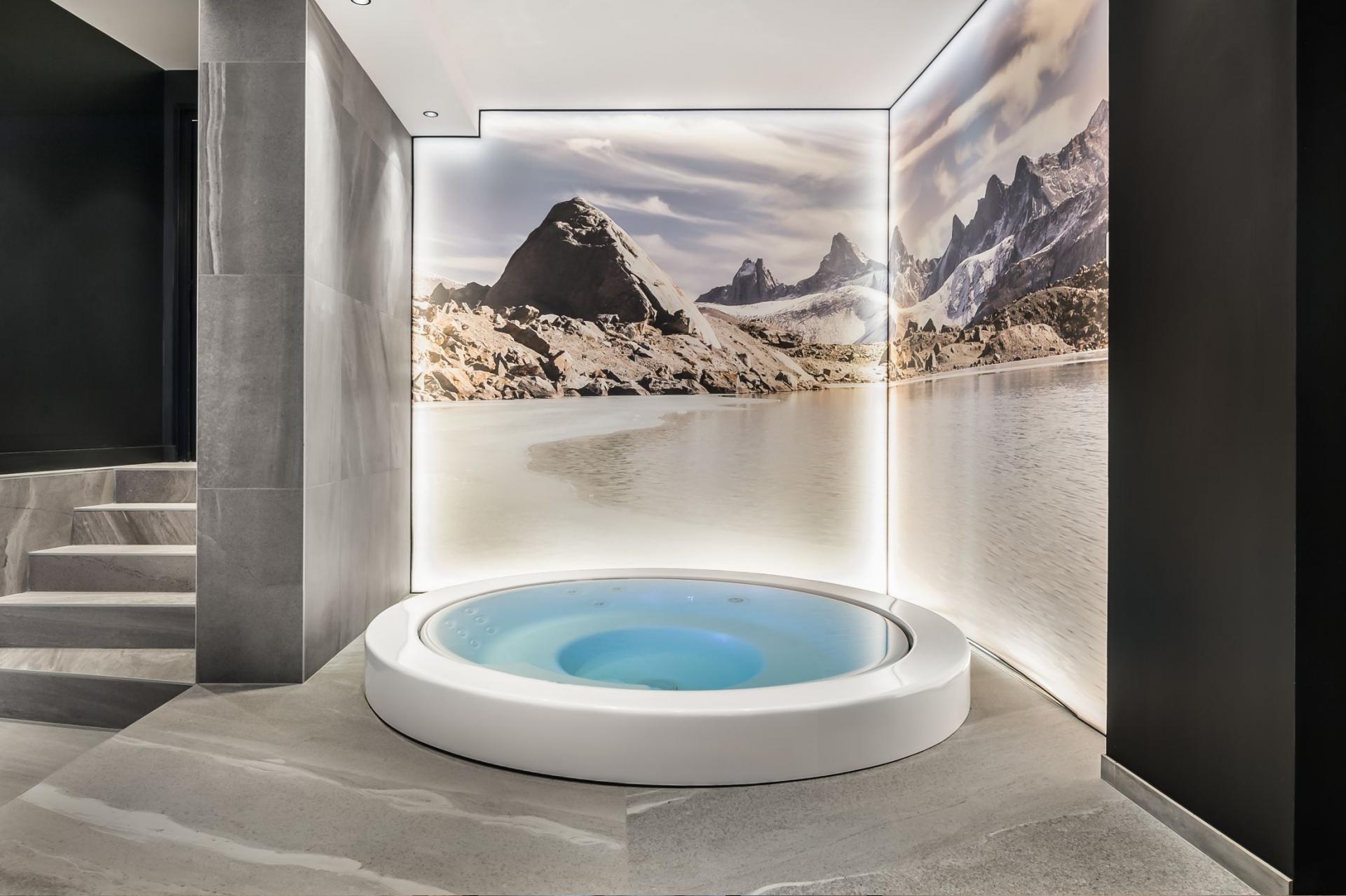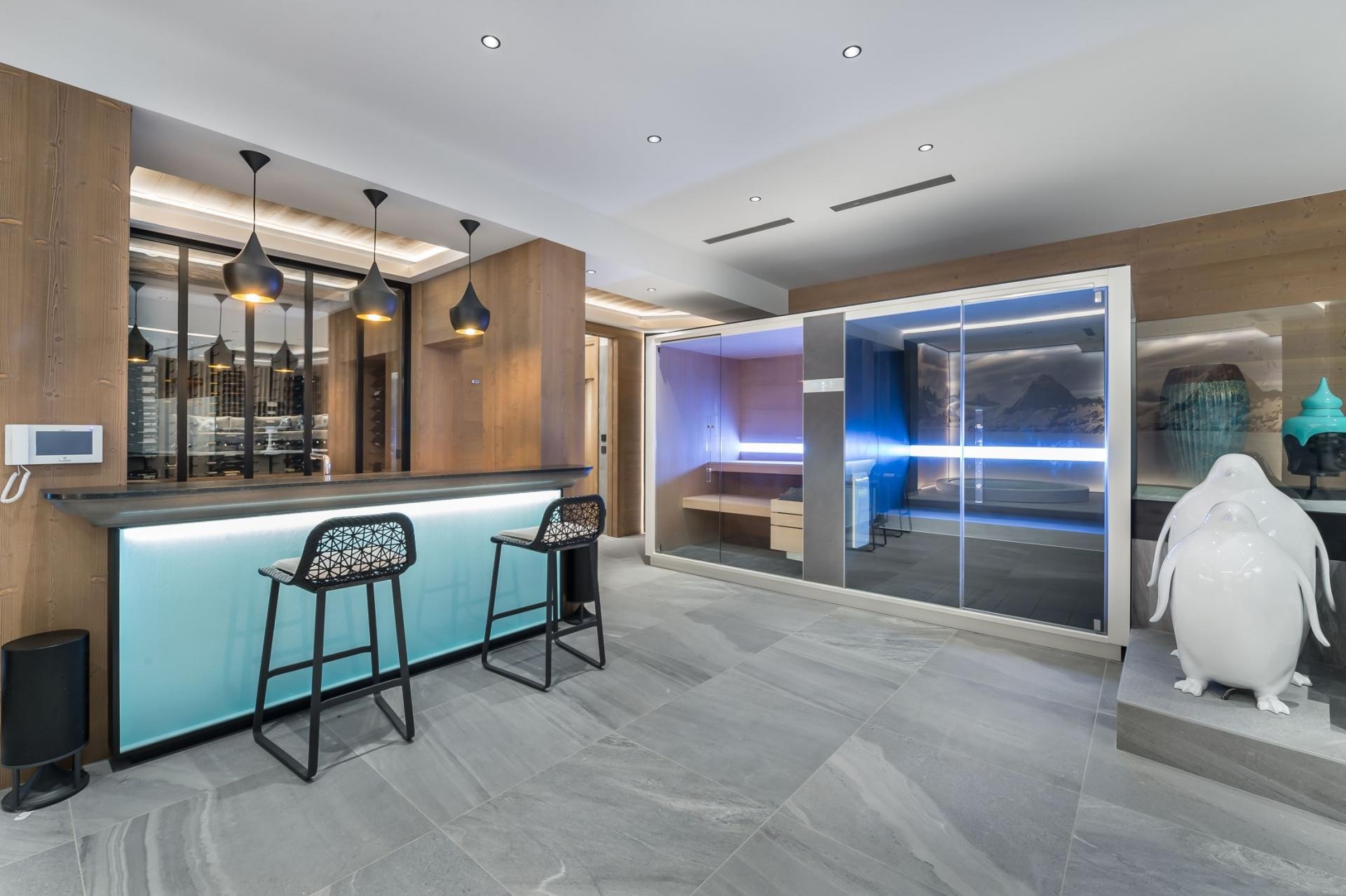 As befits any super-luxury ski chalet has designated an entire floor to wellness and entertainment. This ski chalet swimming pool is a good size and features a mezzanine chill out spot for relaxing post-swim. There’s also an indoor hot tub, treatment room, sauna and Hammam. Completing the wellness suite are a fitness room and a bar, so whether you’re a gym bunny or prefer relaxing with a glass of something sparkling, you’ll find the facility that matches your needs! Also, on this floor is the chalet’s lovely cinema room, the perfect space to enjoy big-screen blockbusters. You will also find down here the well-stocked wine cellar, should you fancy a tempting vintage while you enjoy the film.