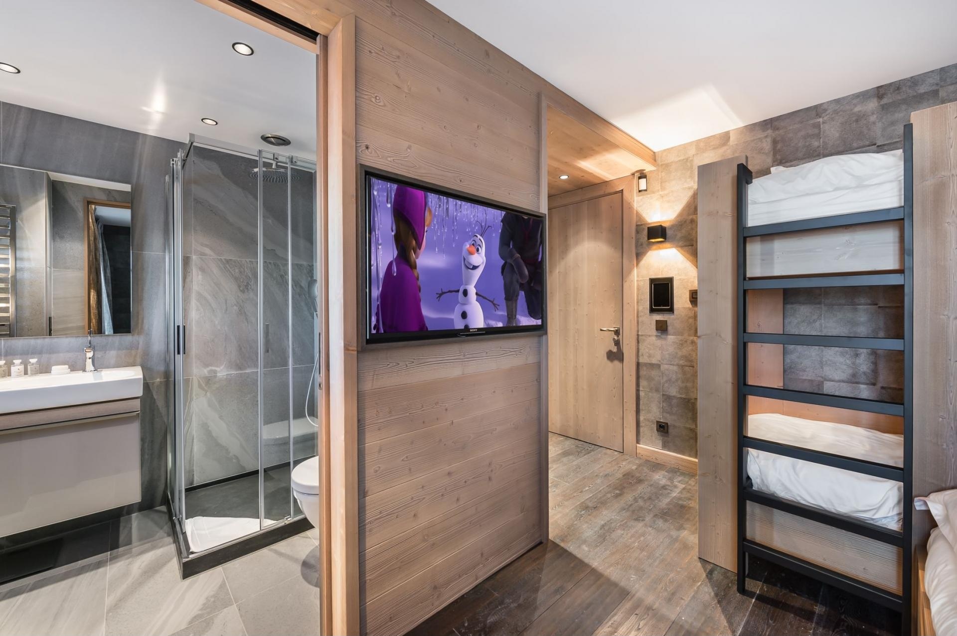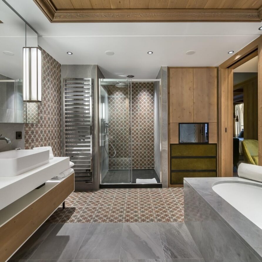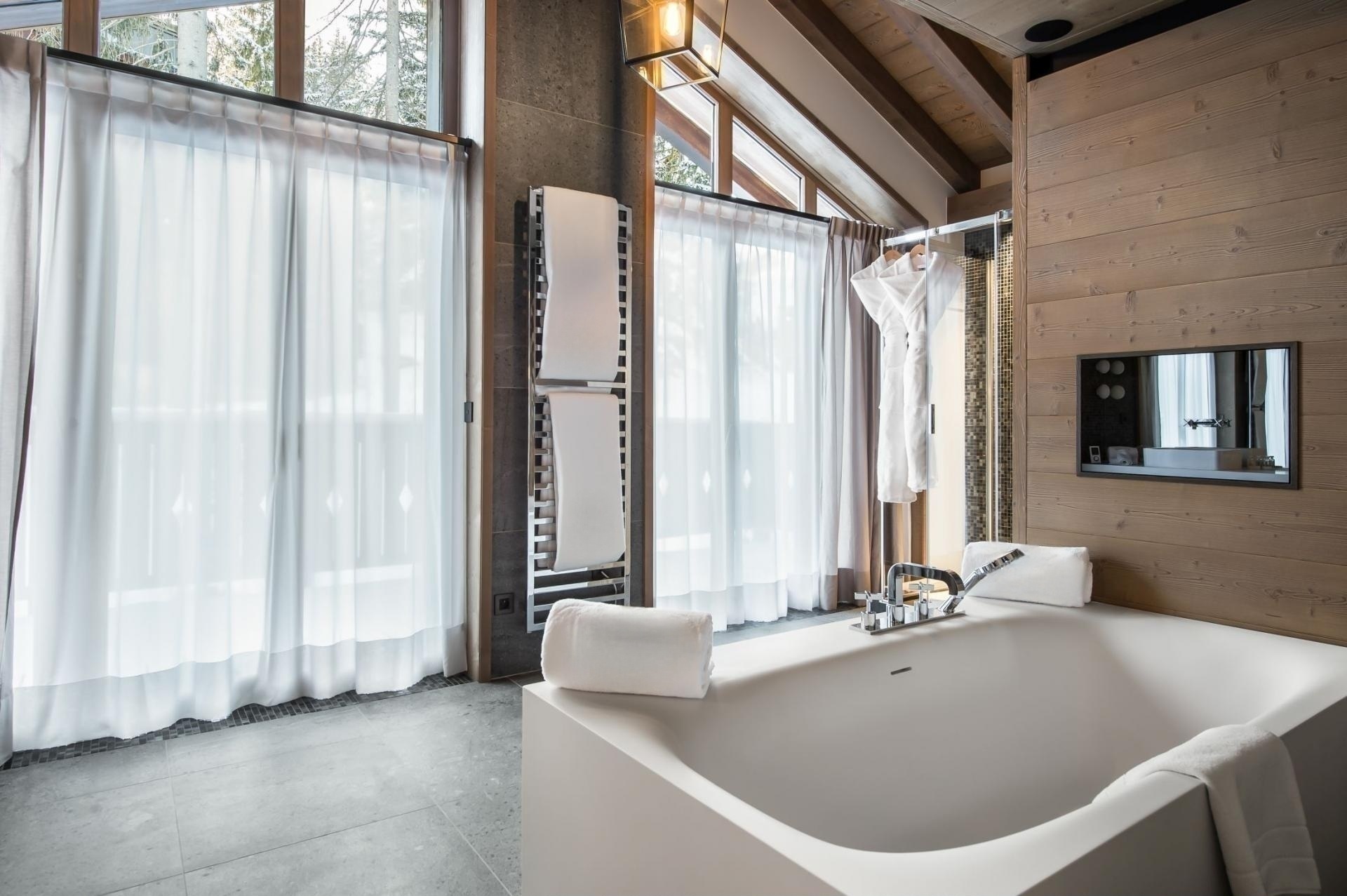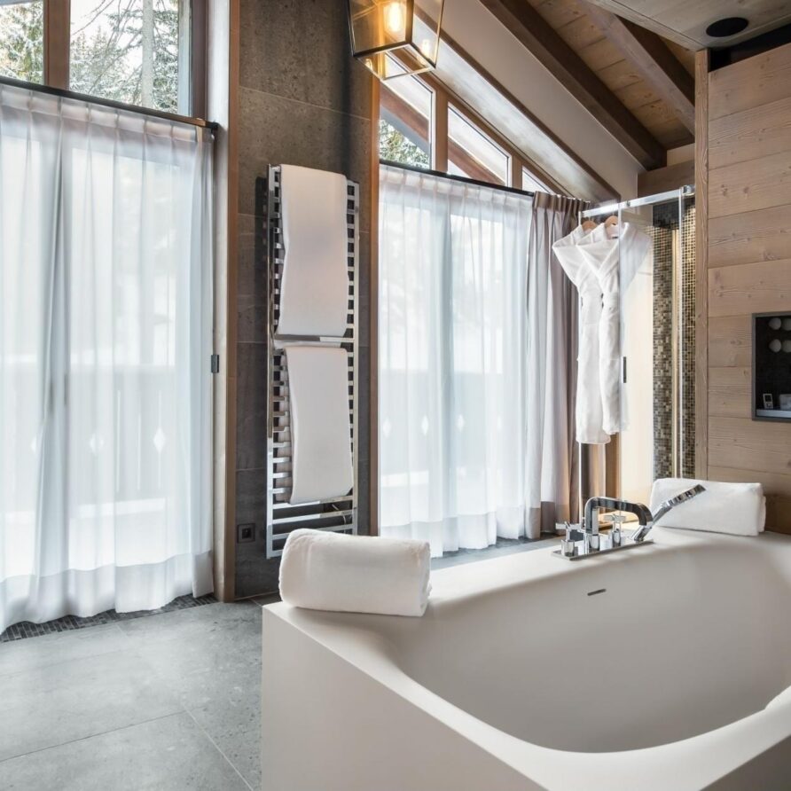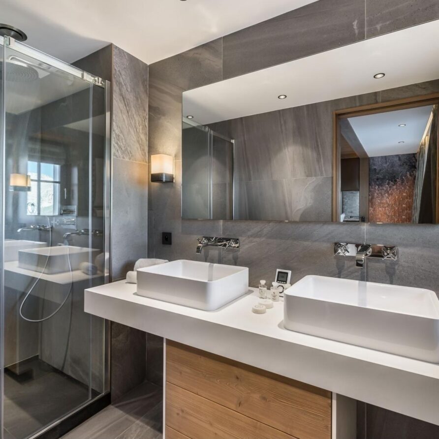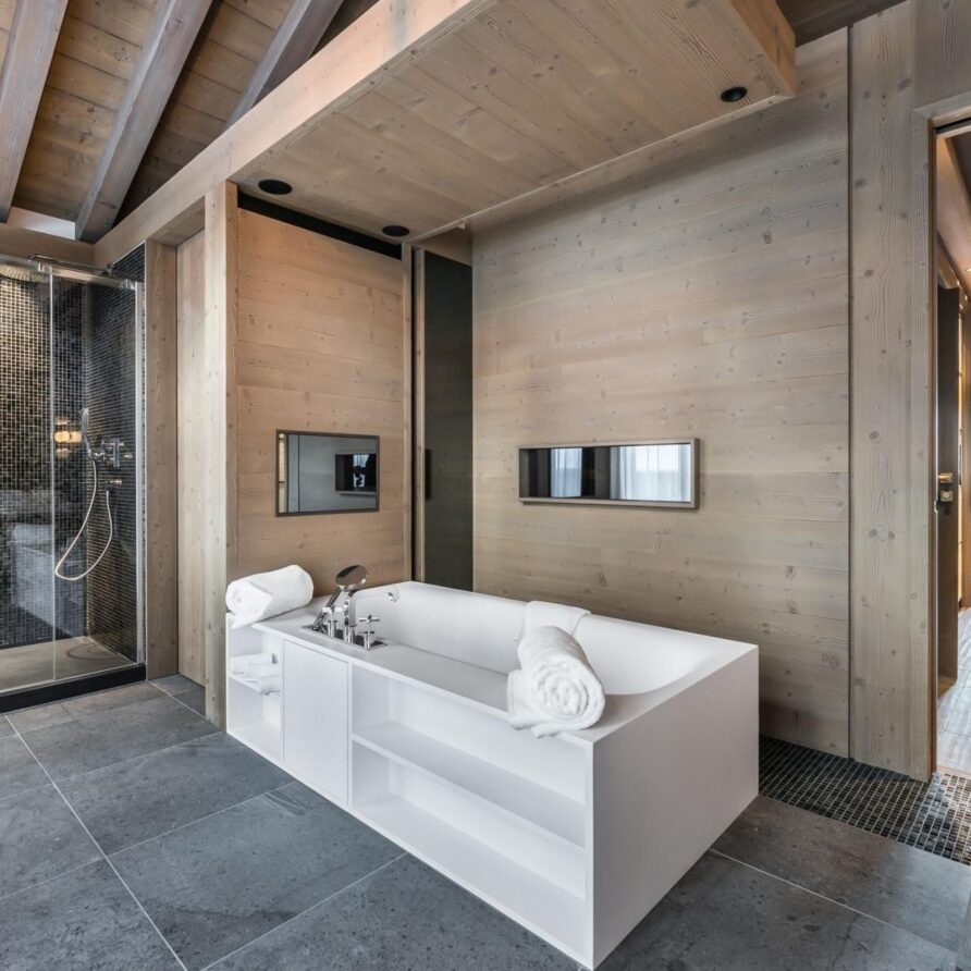 With six bedrooms, the chalet can sleep up to ten adults and four children. The stunning master suite occupies the top floor, so guests can truly indulge in the panoramic alpine views from their private balcony. In the chalet’s eaves, this bedroom is spacious and enjoys comfortable seating, a desk/dressing table, a generous walk-through wardrobe and luxuriant en-suite bathroom. The further four double/twin bedrooms are divided between the first and ground floors. Each has its own en-suite, and two of them also feature dressing rooms. The children’s bedroom has two sets of bunk beds, plus an en-suite, and is also on the first floor. The bedrooms are stylish and modern, with lavish furnishings, refined wooden interiors and decor that recalls the natural mountain environment that the chalet calls home.