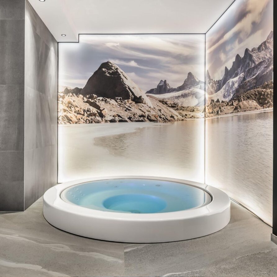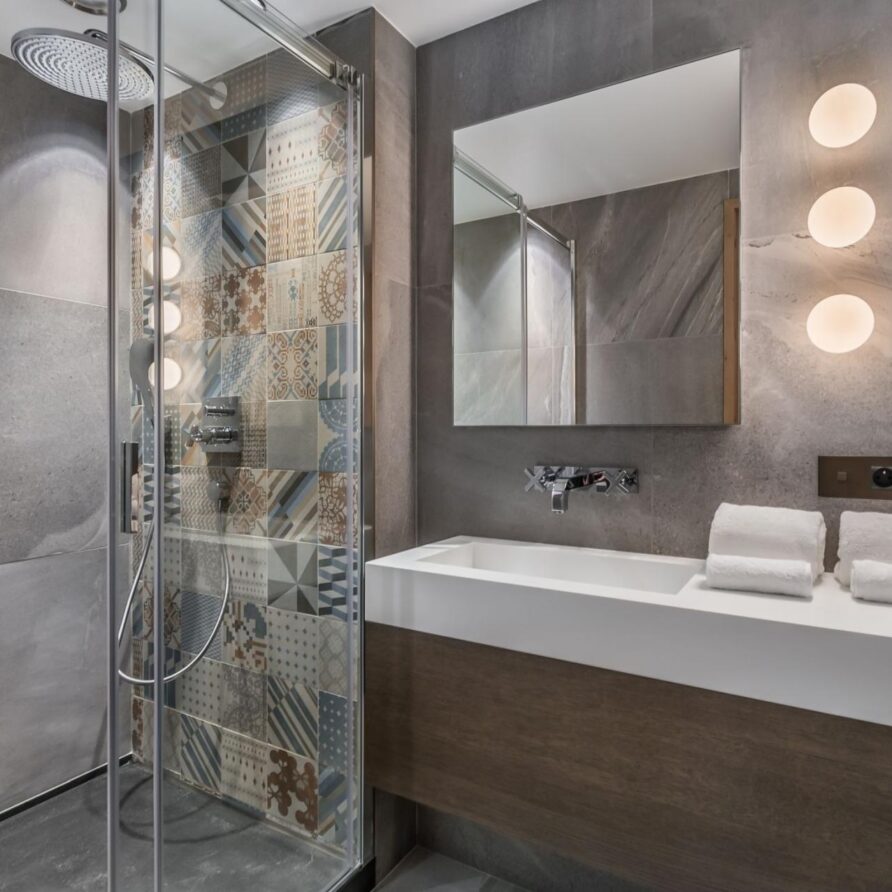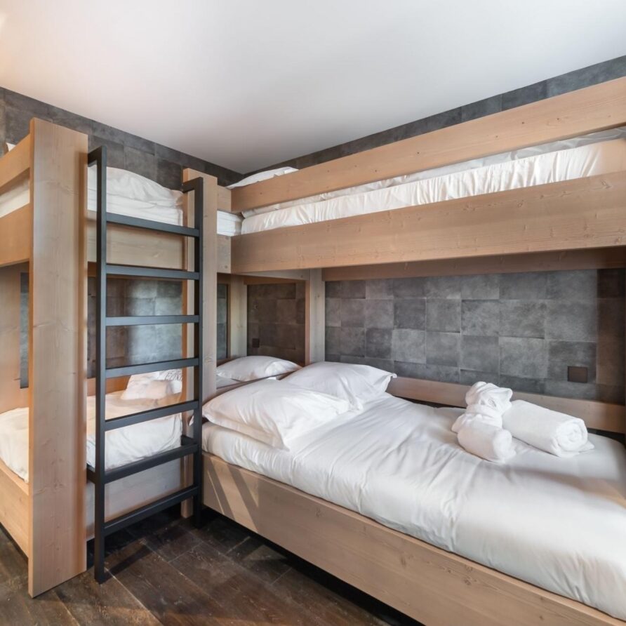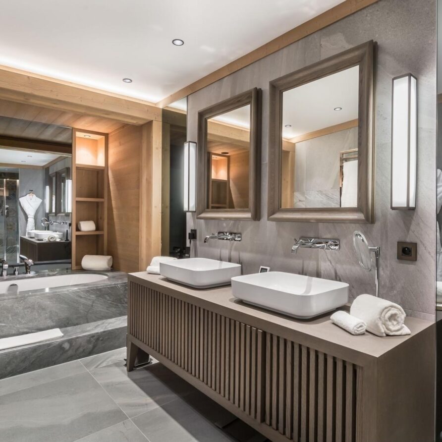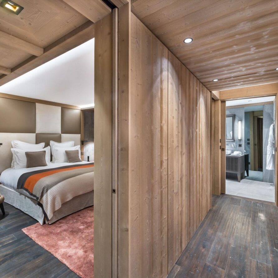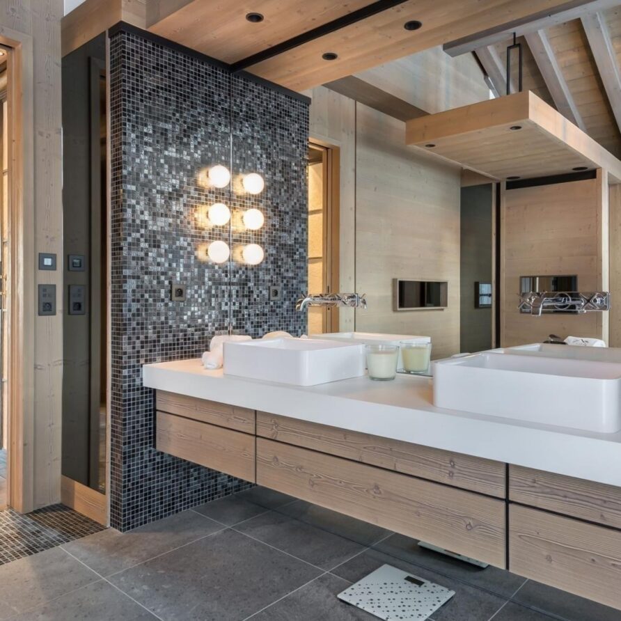 With six bedrooms, the chalet can sleep up to ten adults and four children. The stunning master suite occupies the top floor, so guests can truly indulge in the panoramic alpine views from their private balcony. In the chalet’s eaves, this bedroom is spacious and enjoys comfortable seating, a desk/dressing table, a generous walk-through wardrobe and luxuriant en-suite bathroom. The further four double/twin bedrooms are divided between the first and ground floors. Each has its own en-suite, and two of them also feature dressing rooms. The children’s bedroom has two sets of bunk beds, plus an en-suite, and is also on the first floor. The bedrooms are stylish and modern, with lavish furnishings, refined wooden interiors and decor that recalls the natural mountain environment that the chalet calls home.