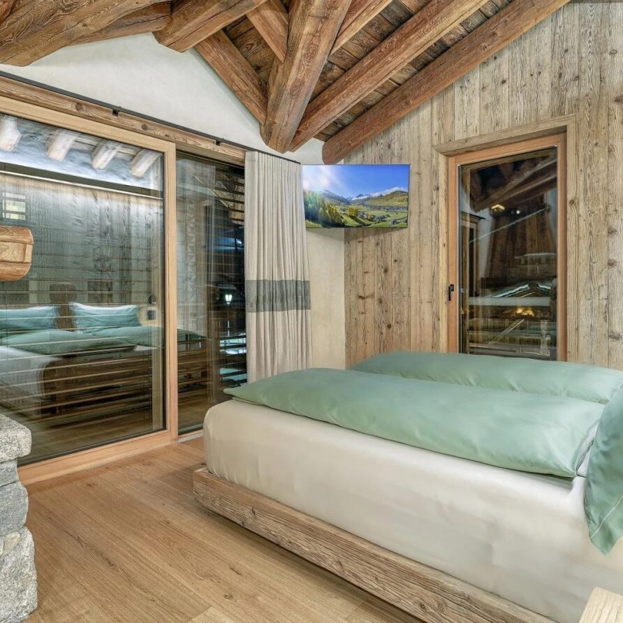The chalet spans 380sqm across three spacious floors, where alpine charm meets stylish ambiance, blending warmth with contemporary alpine flair. At the heart of the chalet lies the open-plan living area on the ground floor, featuring a glass-fronted gas fireplace that creates the perfect setting for cozy gatherings after a day on the slopes. Picture yourself sipping a hot chocolate while chatting with family, nestled into the super-modern sofas that invite relaxation. Large windows and French doors seamlessly connect the indoors with the breathtaking natural surroundings, allowing the beauty of the outdoors to fill the space with light.