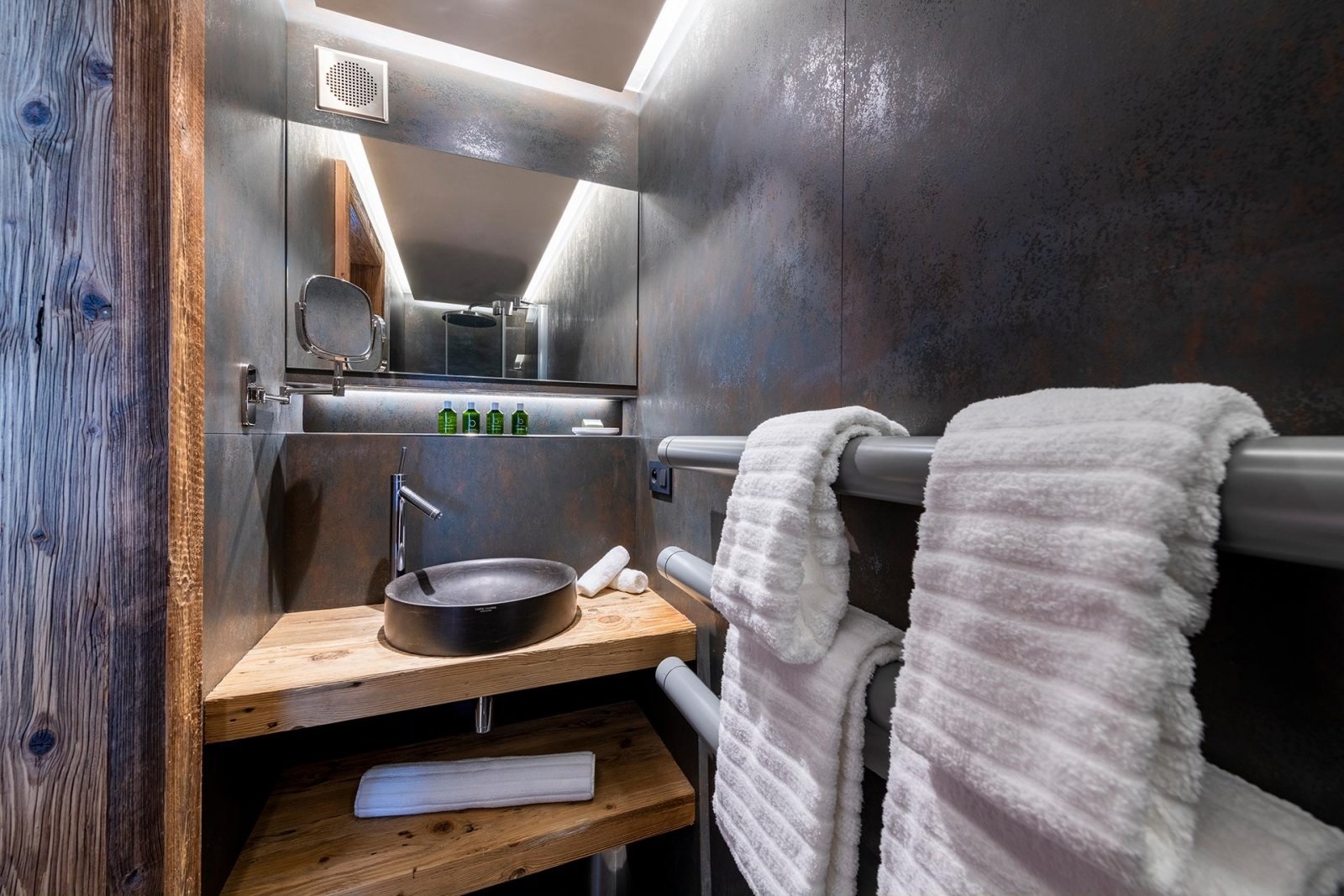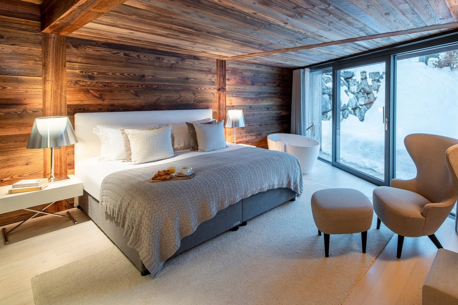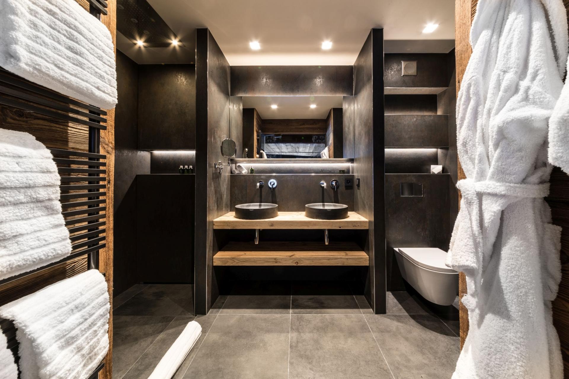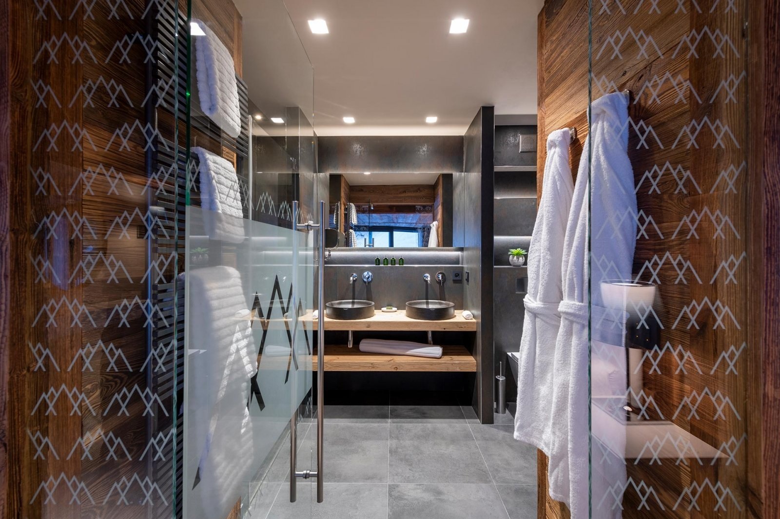 The chalet`s bedrooms were made to delight. Hanging seats and free-standing bathtubs are all carefully positioned for perfect mountain views. Every bedroom opens out onto its own terrace so you can continue to experience the mountain when luxuriating in your private suite. The bathrooms enjoy ceiling rain showers, diffused lighting, and unique features such as slatted doors to allow natural light into the space, or huge 1.5m2 black stone tiles chosen for their delicate rusty hues making the shower feel deliciously warm, intimate, almost protective in its design. The chalet also offers ample sleep options, whatever the makeup of your group. Choose between the master suite, a family suite (which includes a separate 4-bed bunk room) and three further double bedrooms all with super-king size beds and some with the option to set up the rooms as twins.