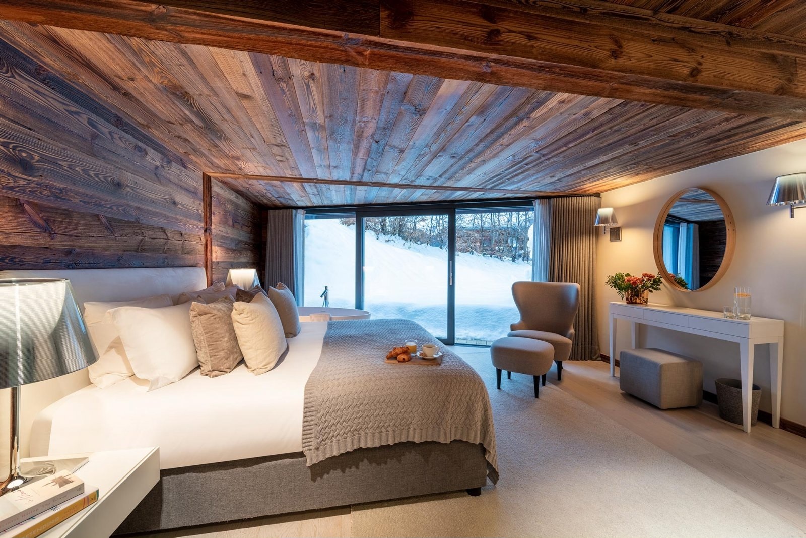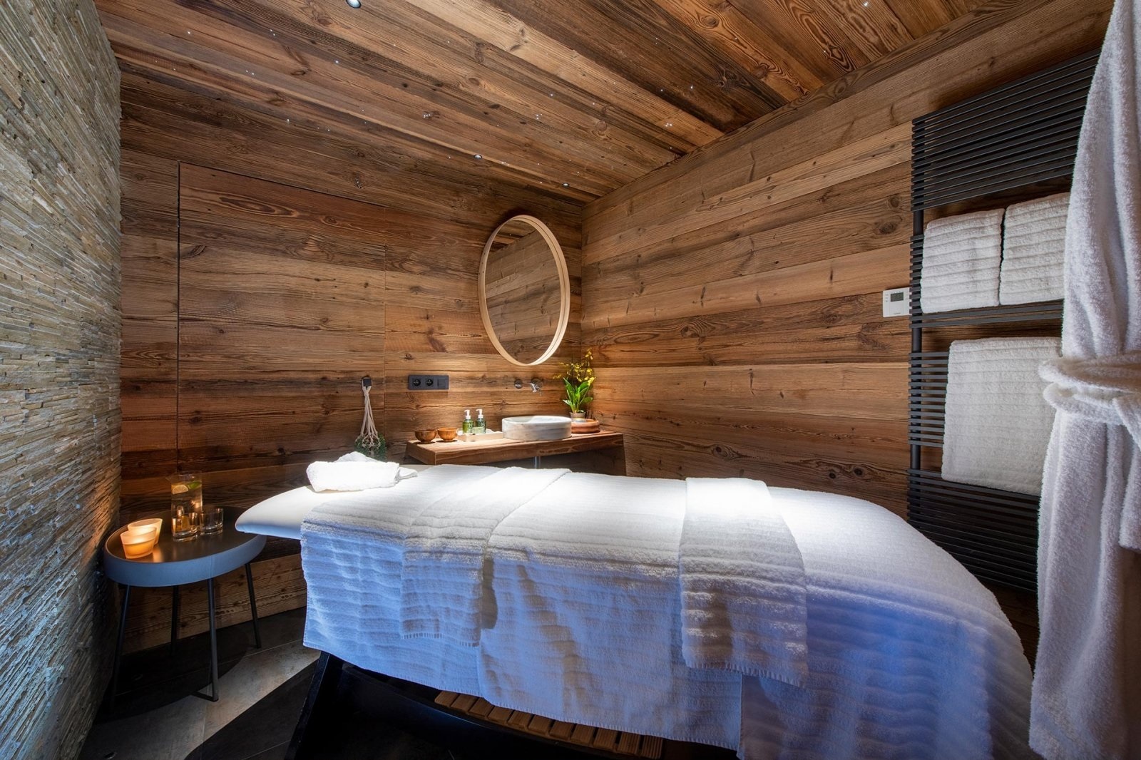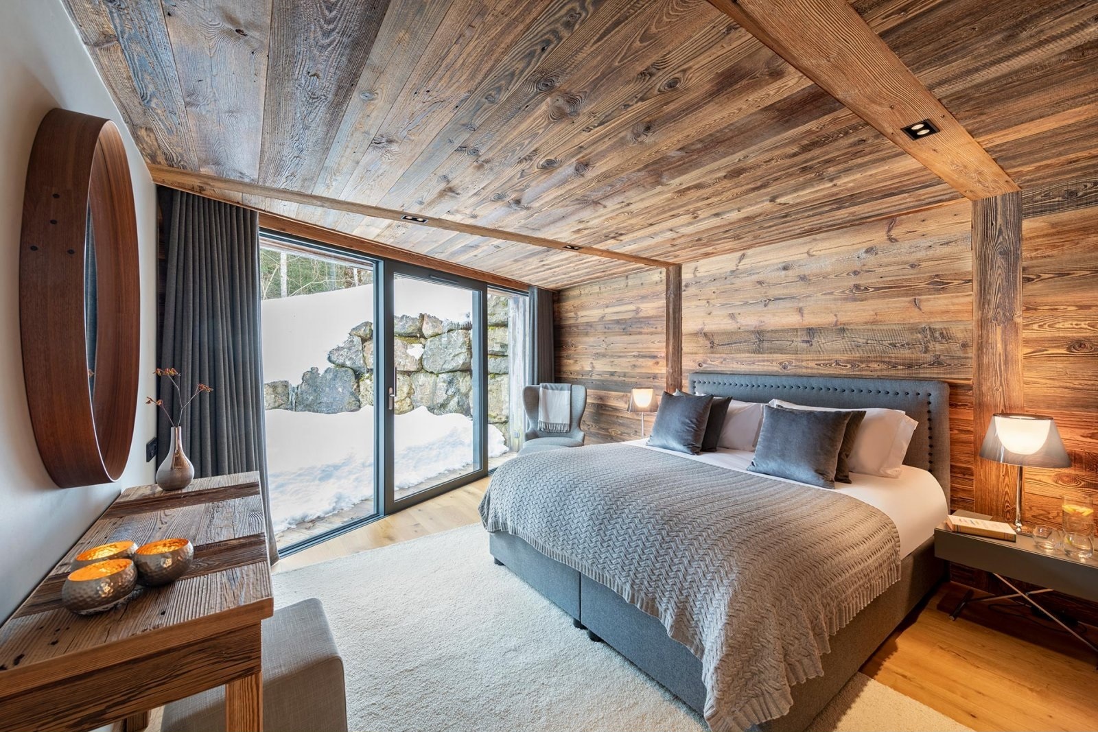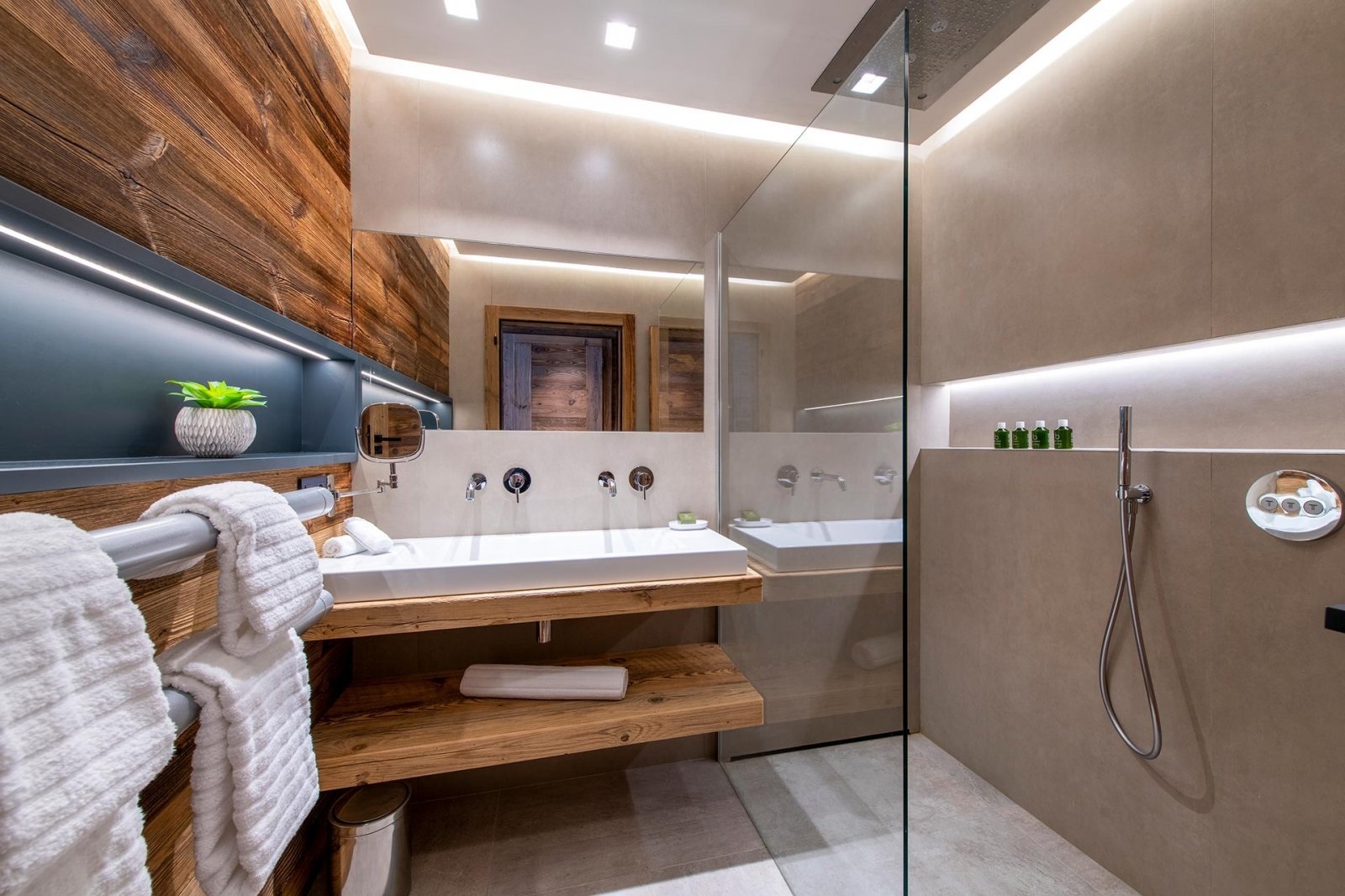 The chalet`s bedrooms were made to delight. Hanging seats and free-standing bathtubs are all carefully positioned for perfect mountain views. Every bedroom opens out onto its own terrace so you can continue to experience the mountain when luxuriating in your private suite. The bathrooms enjoy ceiling rain showers, diffused lighting, and unique features such as slatted doors to allow natural light into the space, or huge 1.5m2 black stone tiles chosen for their delicate rusty hues making the shower feel deliciously warm, intimate, almost protective in its design. The chalet also offers ample sleep options, whatever the makeup of your group. Choose between the master suite, a family suite (which includes a separate 4-bed bunk room) and three further double bedrooms all with super-king size beds and some with the option to set up the rooms as twins.
