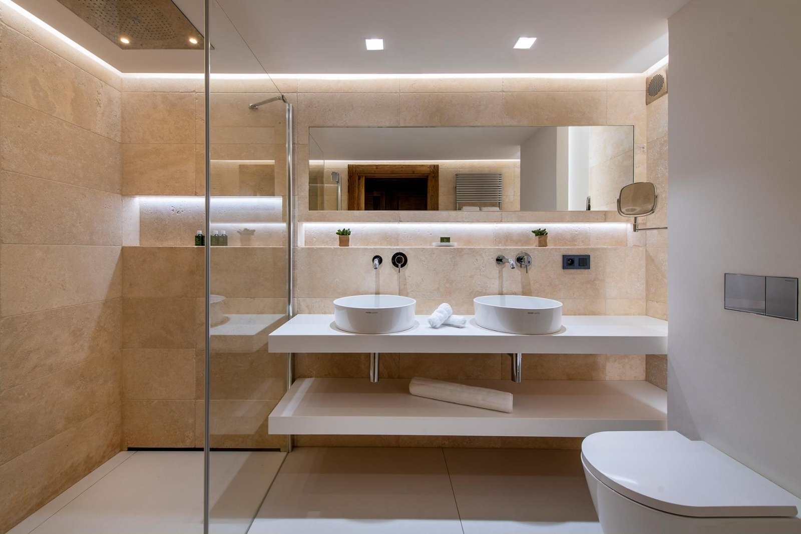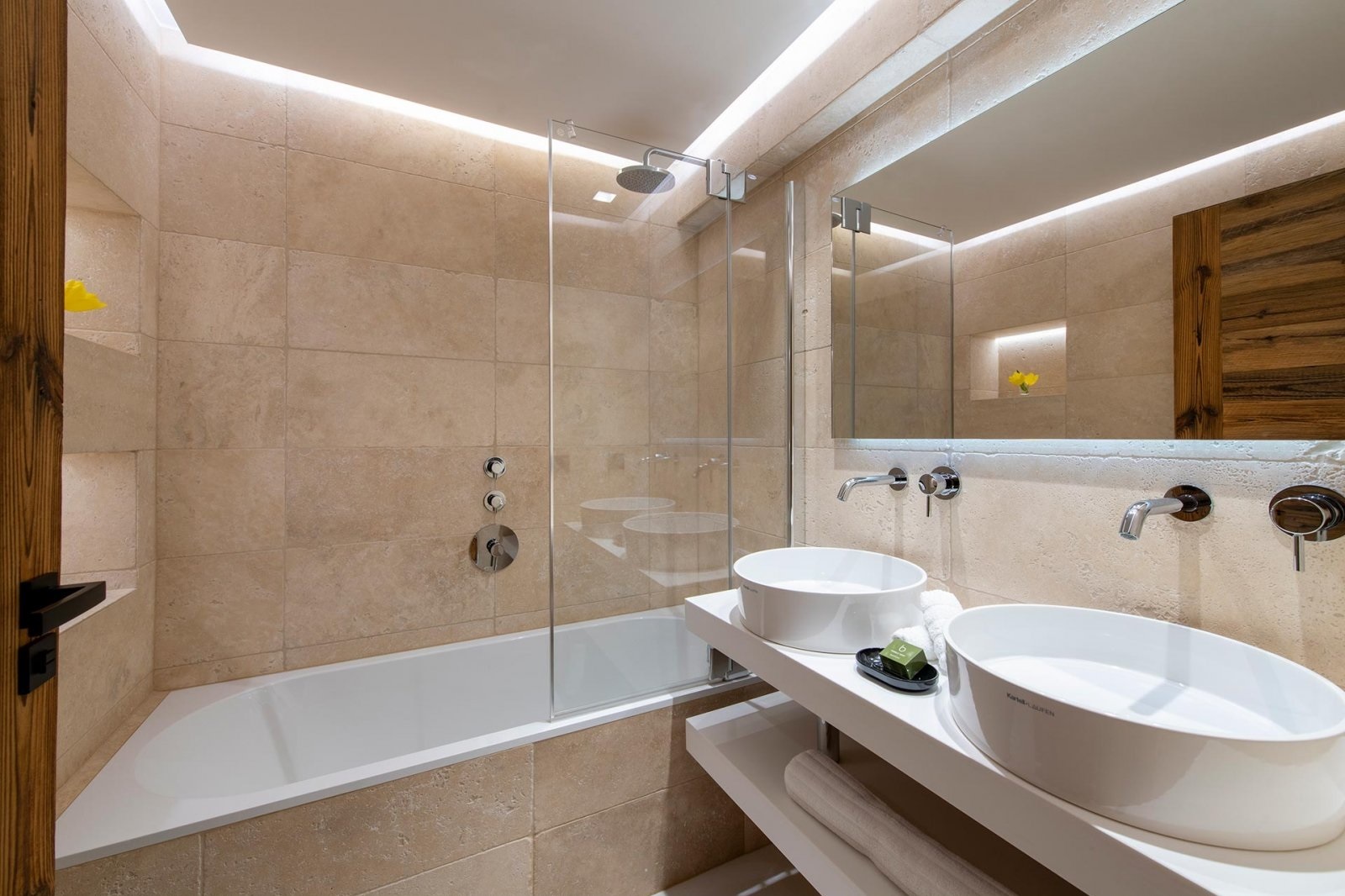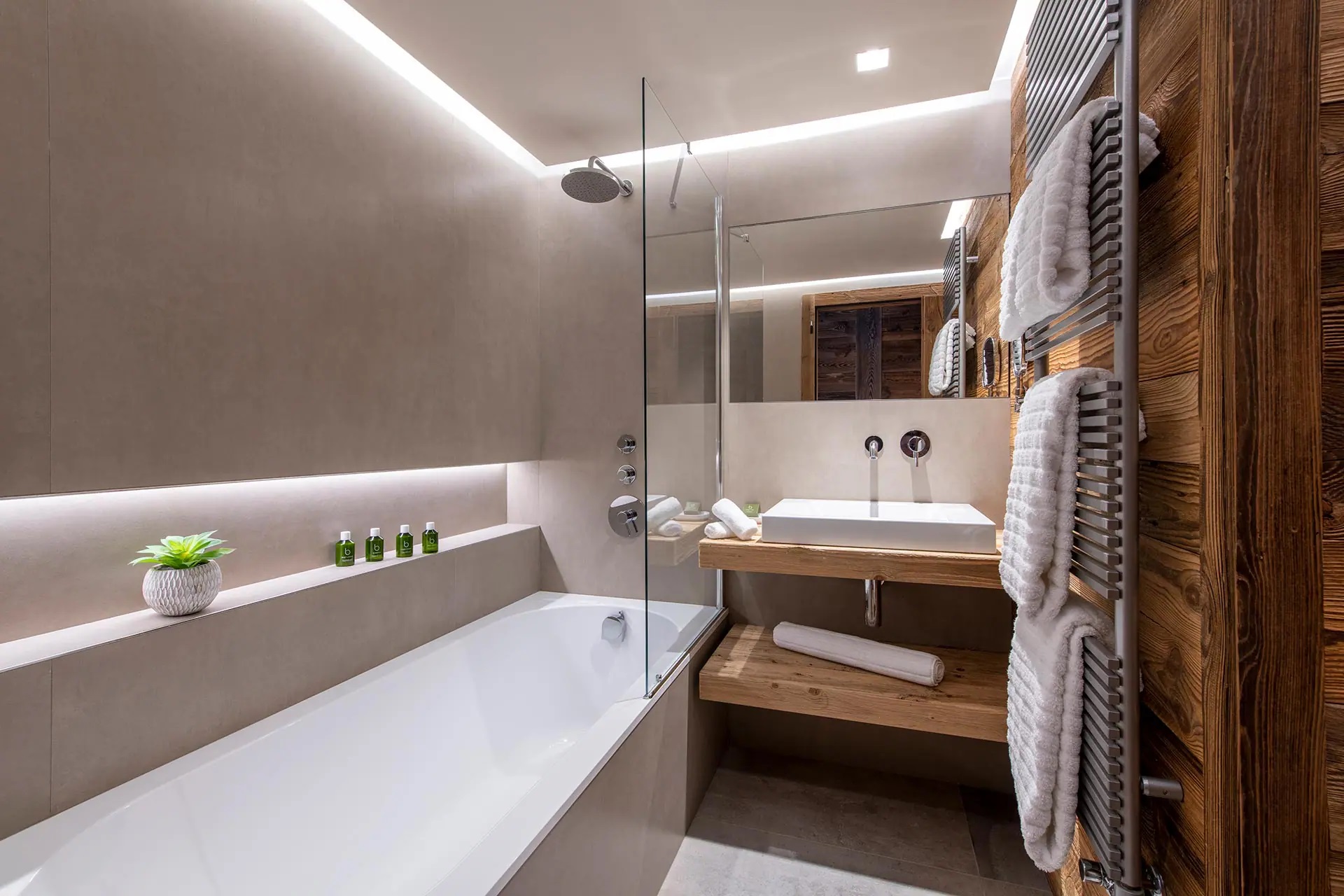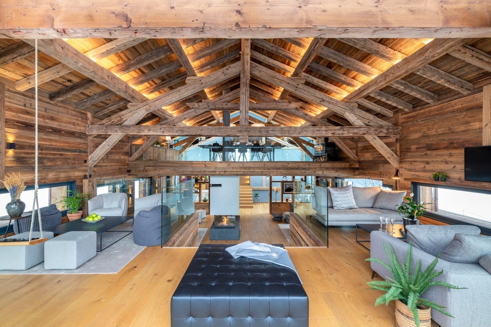 The chalet`s bedrooms were made to delight. Hanging seats and free-standing bathtubs are all carefully positioned for perfect mountain views. Every bedroom opens out onto its own terrace so you can continue to experience the mountain when luxuriating in your private suite. The bathrooms enjoy ceiling rain showers, diffused lighting, and unique features such as slatted doors to allow natural light into the space, or huge 1.5m2 black stone tiles chosen for their delicate rusty hues making the shower feel deliciously warm, intimate, almost protective in its design. The chalet also offers ample sleep options, whatever the makeup of your group. Choose between the master suite, a family suite (which includes a separate 4-bed bunk room) and three further double bedrooms all with super-king size beds and some with the option to set up the rooms as twins.