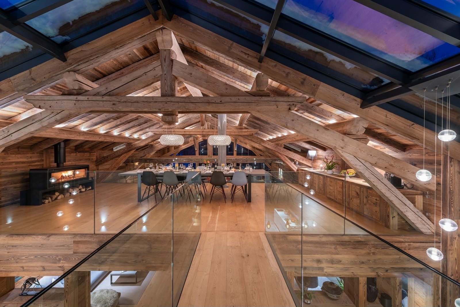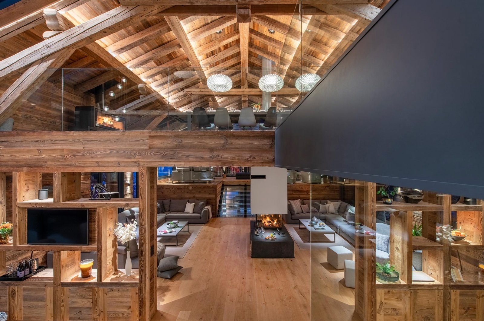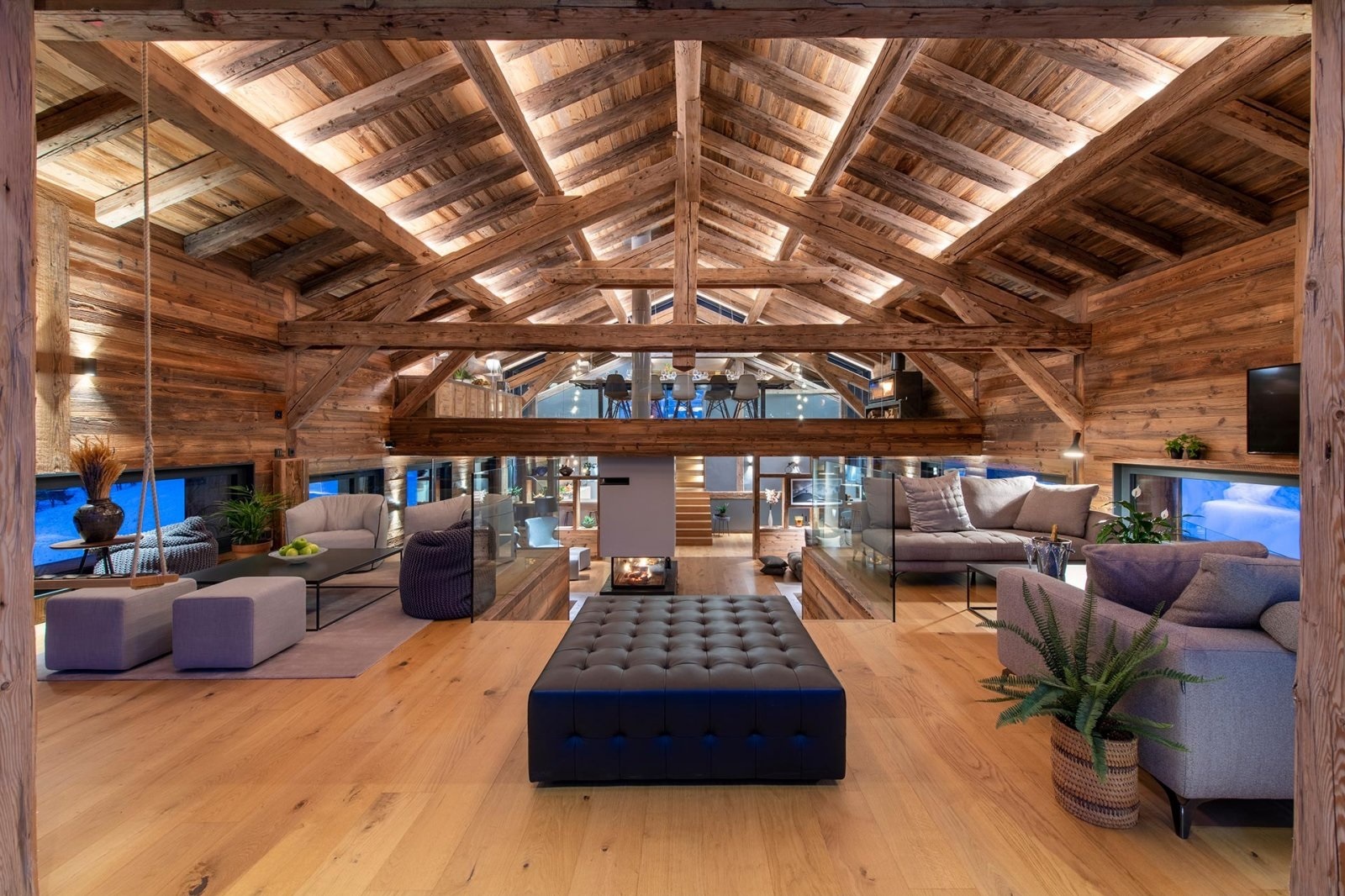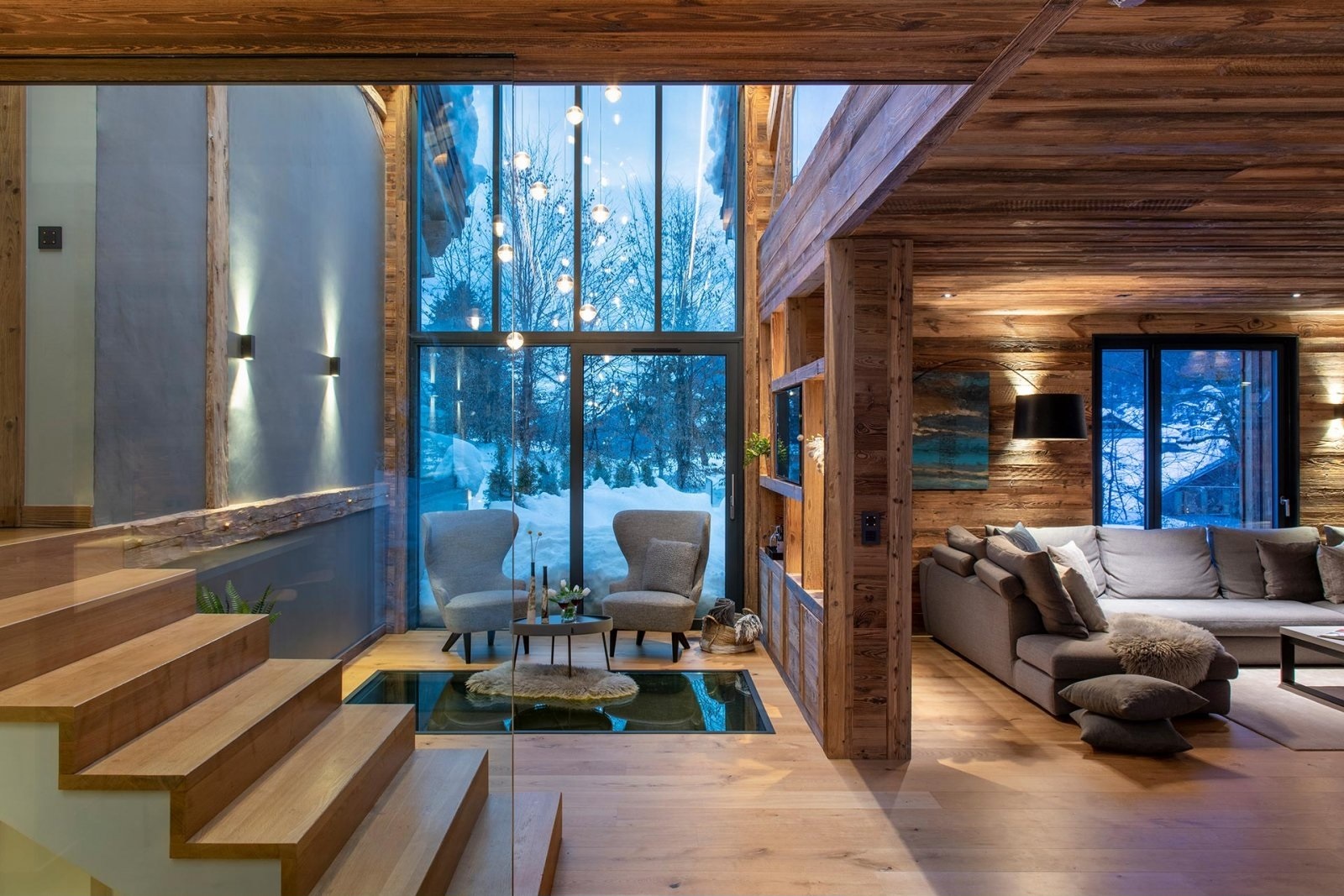 The chalet structure is quite literally built into its mountain location; every bedroom and living space opens out onto private terraces. Inside, the enormous living space has one side entirely glazed and opens out onto a deep balcony overlooking the valley. The building itself is dissected by a glass atrium and there are sections of glass flooring ensuring the chalet is filled, in every area, in every space, with natural light. The chalet allows guests a rare moment, to live in, and exist with, the mountain.