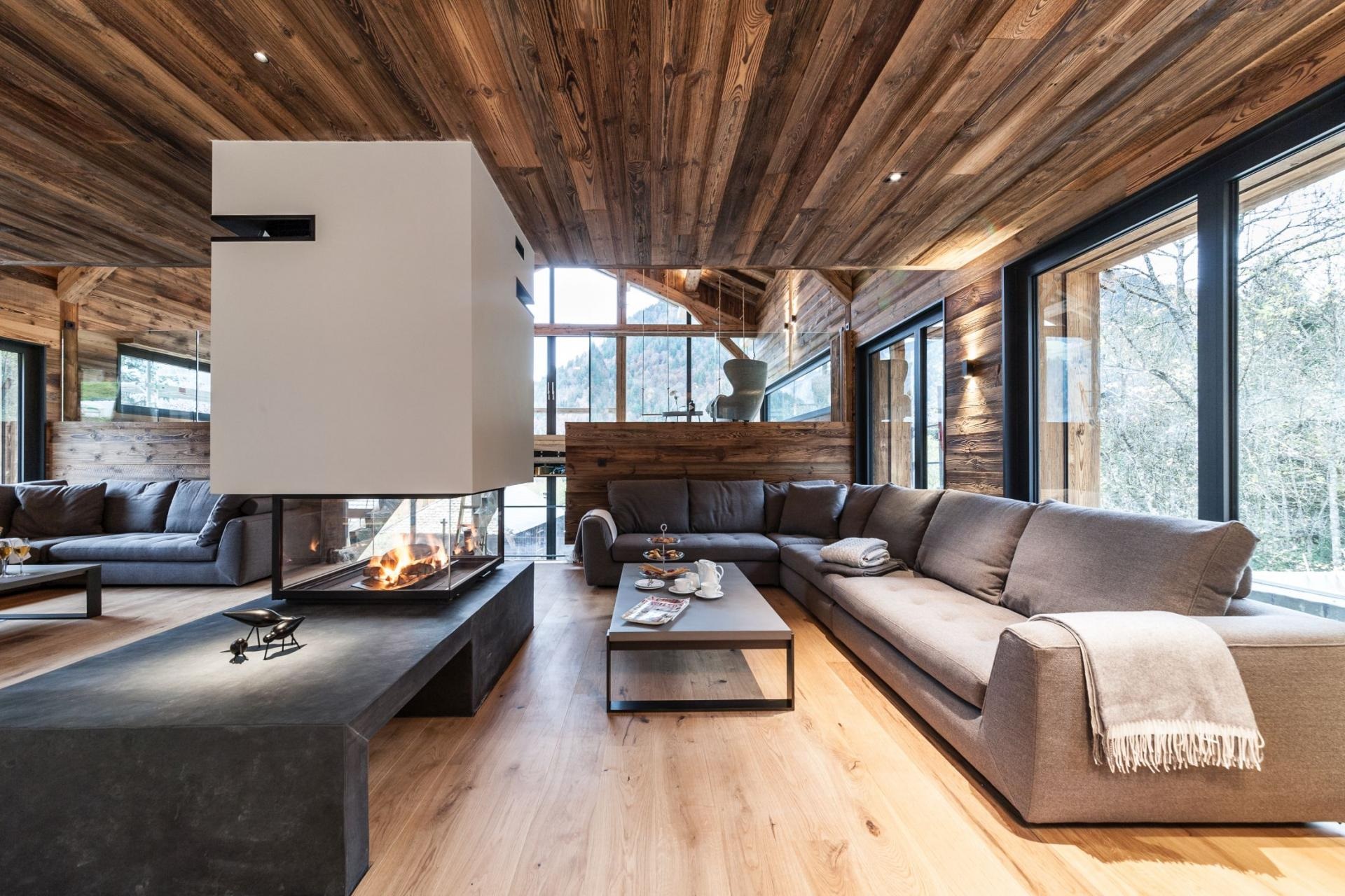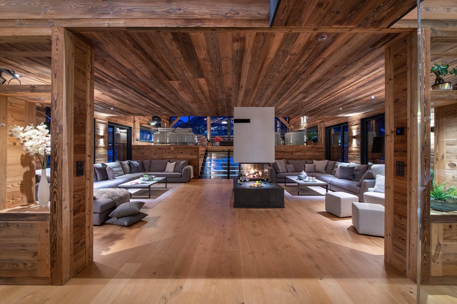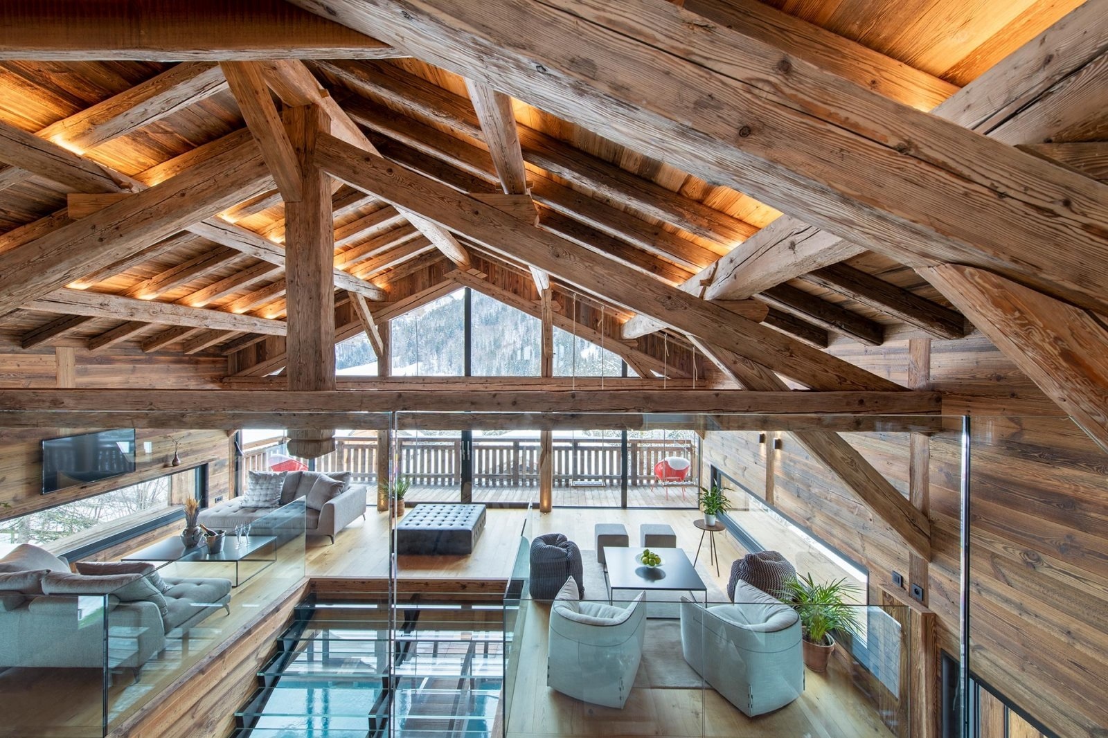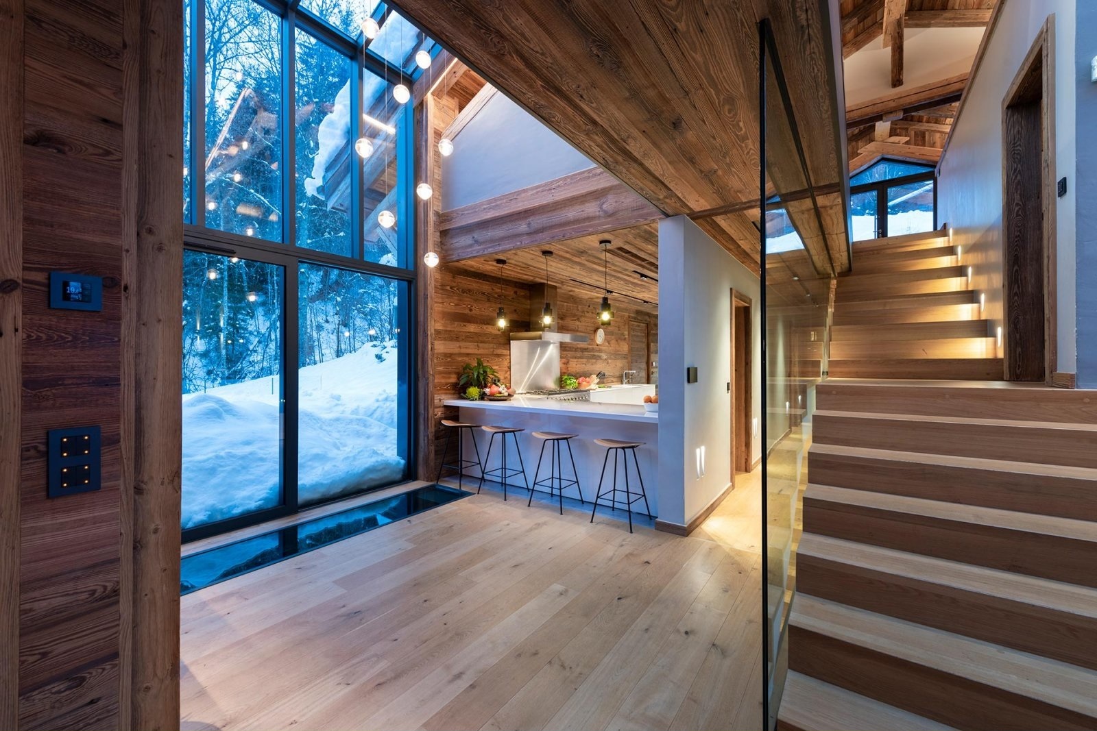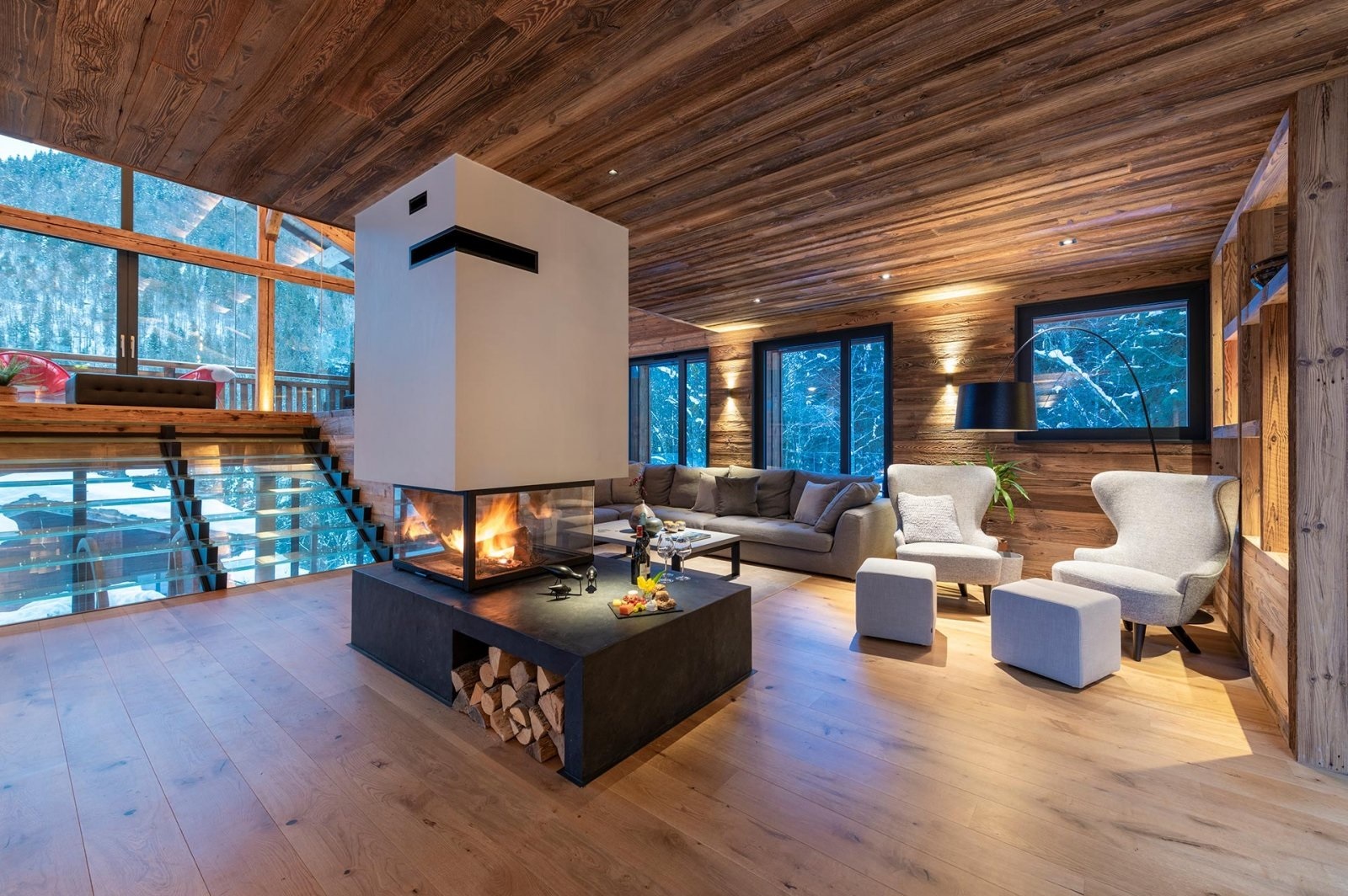 The chalet structure is quite literally built into its mountain location; every bedroom and living space opens out onto private terraces. Inside, the enormous living space has one side entirely glazed and opens out onto a deep balcony overlooking the valley. The building itself is dissected by a glass atrium and there are sections of glass flooring ensuring the chalet is filled, in every area, in every space, with natural light. The chalet allows guests a rare moment, to live in, and exist with, the mountain.