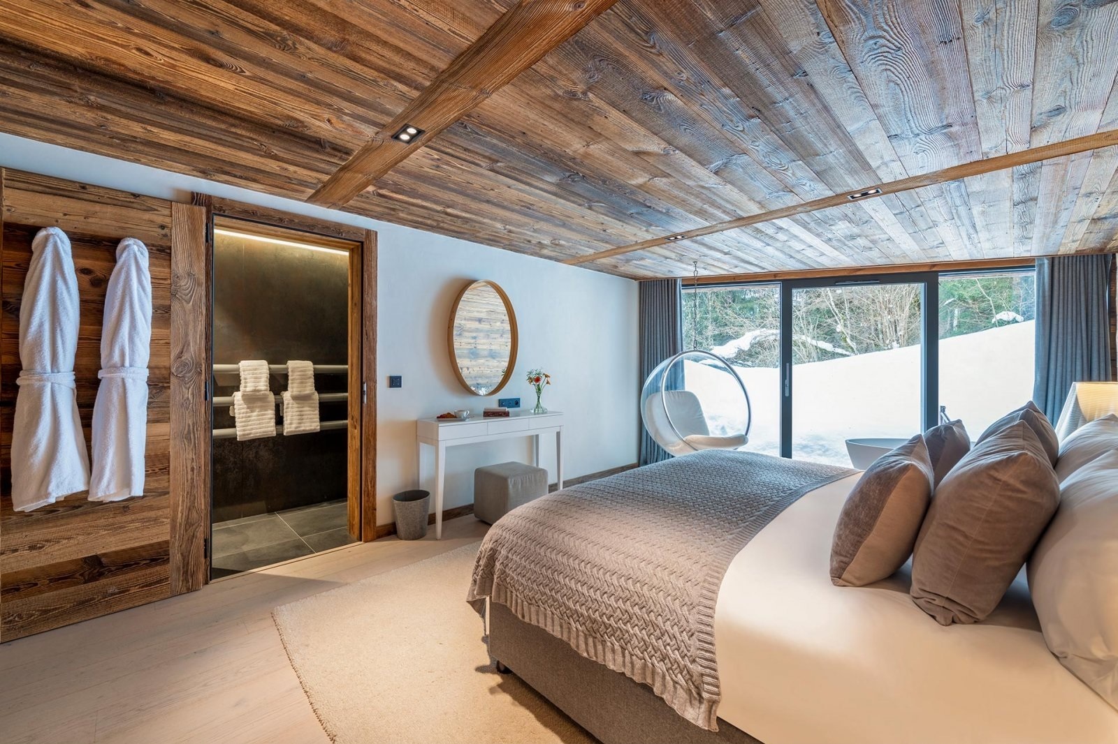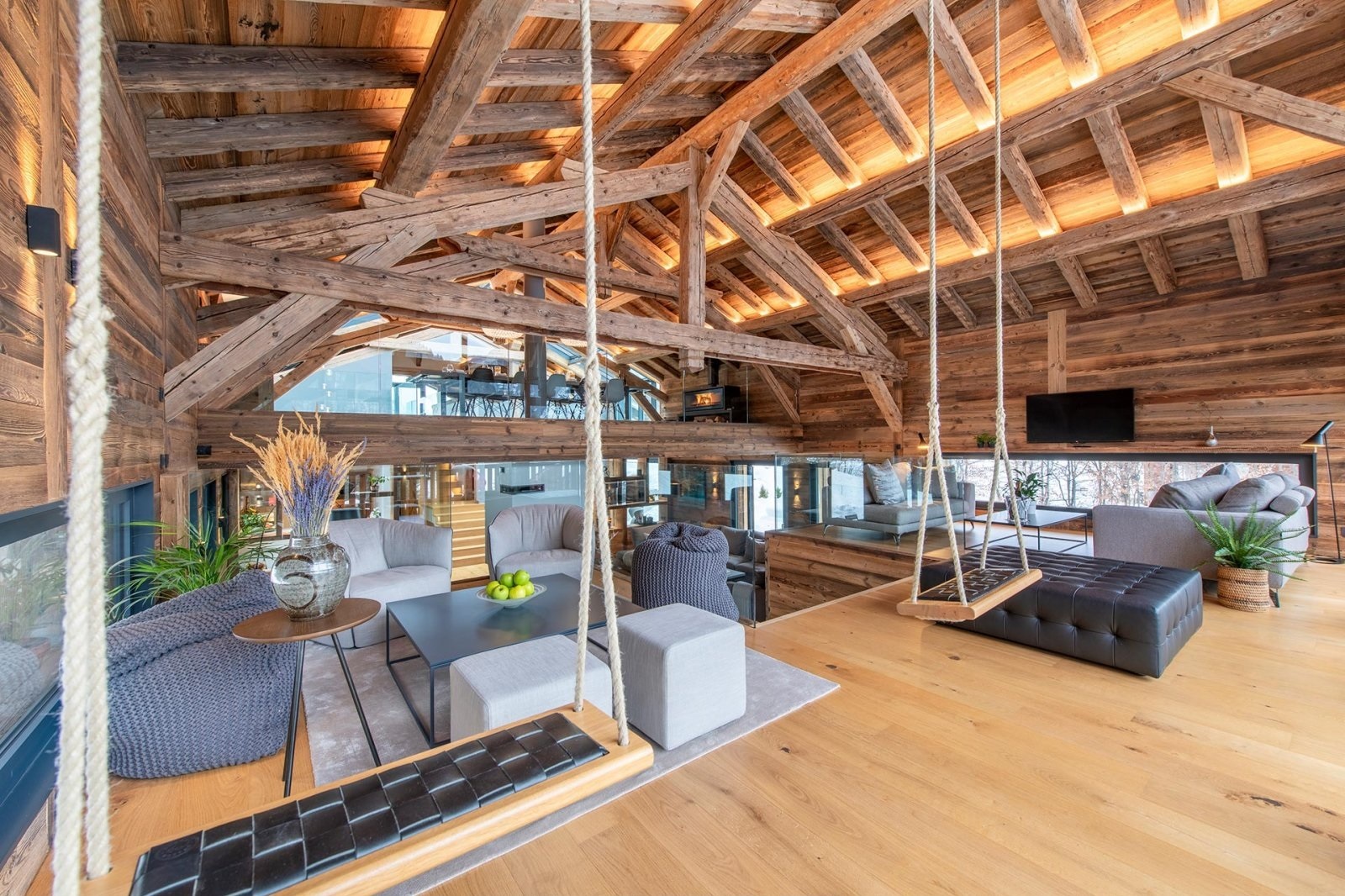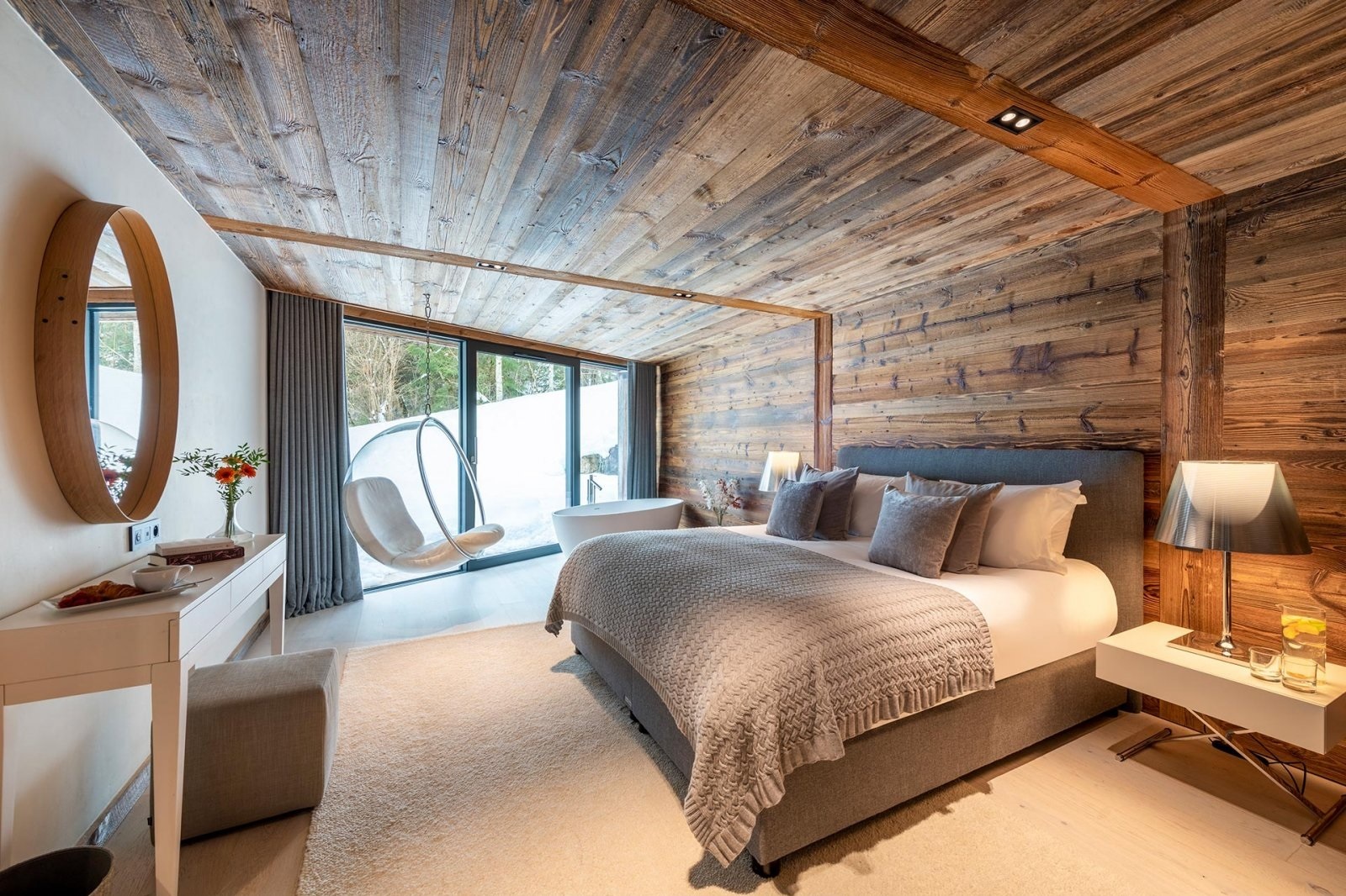 The chalet itself is spread over 600m2, with one side of the chalet almost entirely glazed, offering mountain views from all the living spaces and entertainment areas. The chalet can sleep up to 14 guests across 5 luxurious bedrooms and a family/children’s bunk room, all opening out onto secluded terraces and enjoying free standing baths and hanging seats.