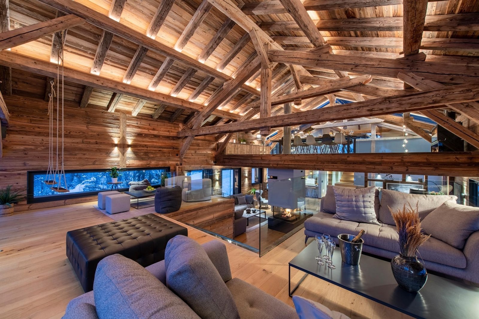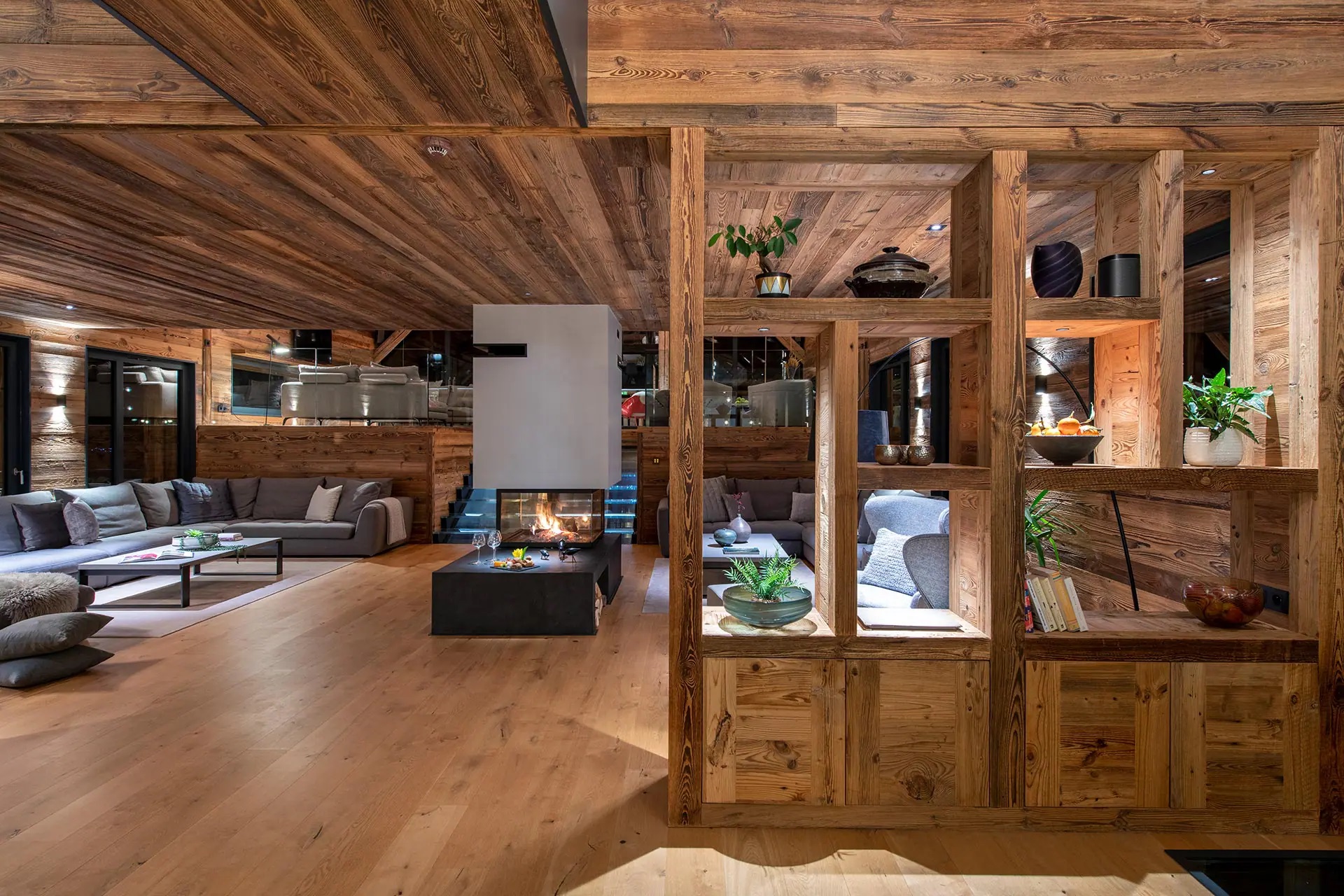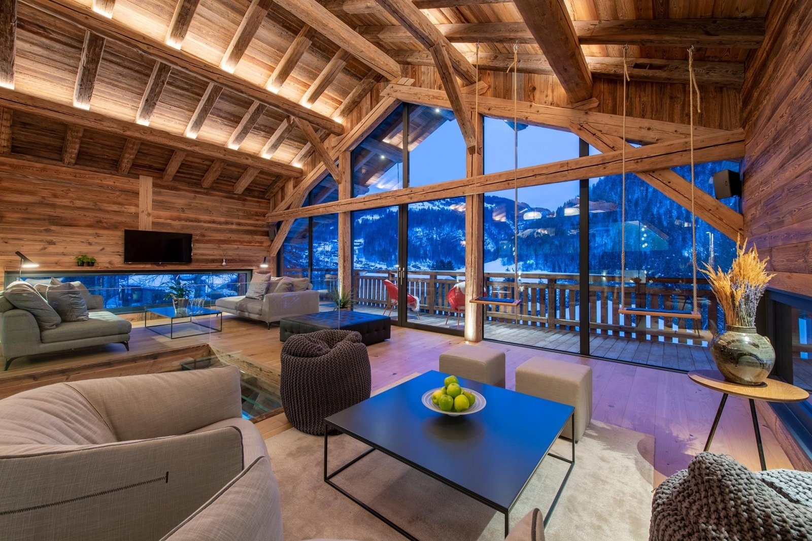 The chalet itself is spread over 600m2, with one side of the chalet almost entirely glazed, offering mountain views from all the living spaces and entertainment areas. The chalet can sleep up to 14 guests across 5 luxurious bedrooms and a family/children’s bunk room, all opening out onto secluded terraces and enjoying free standing baths and hanging seats.