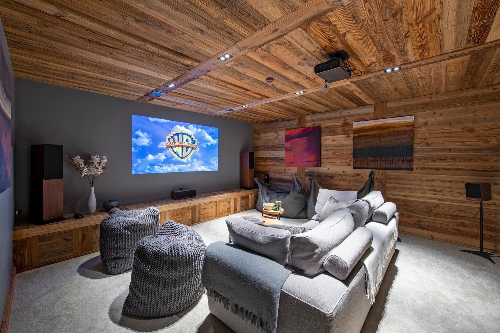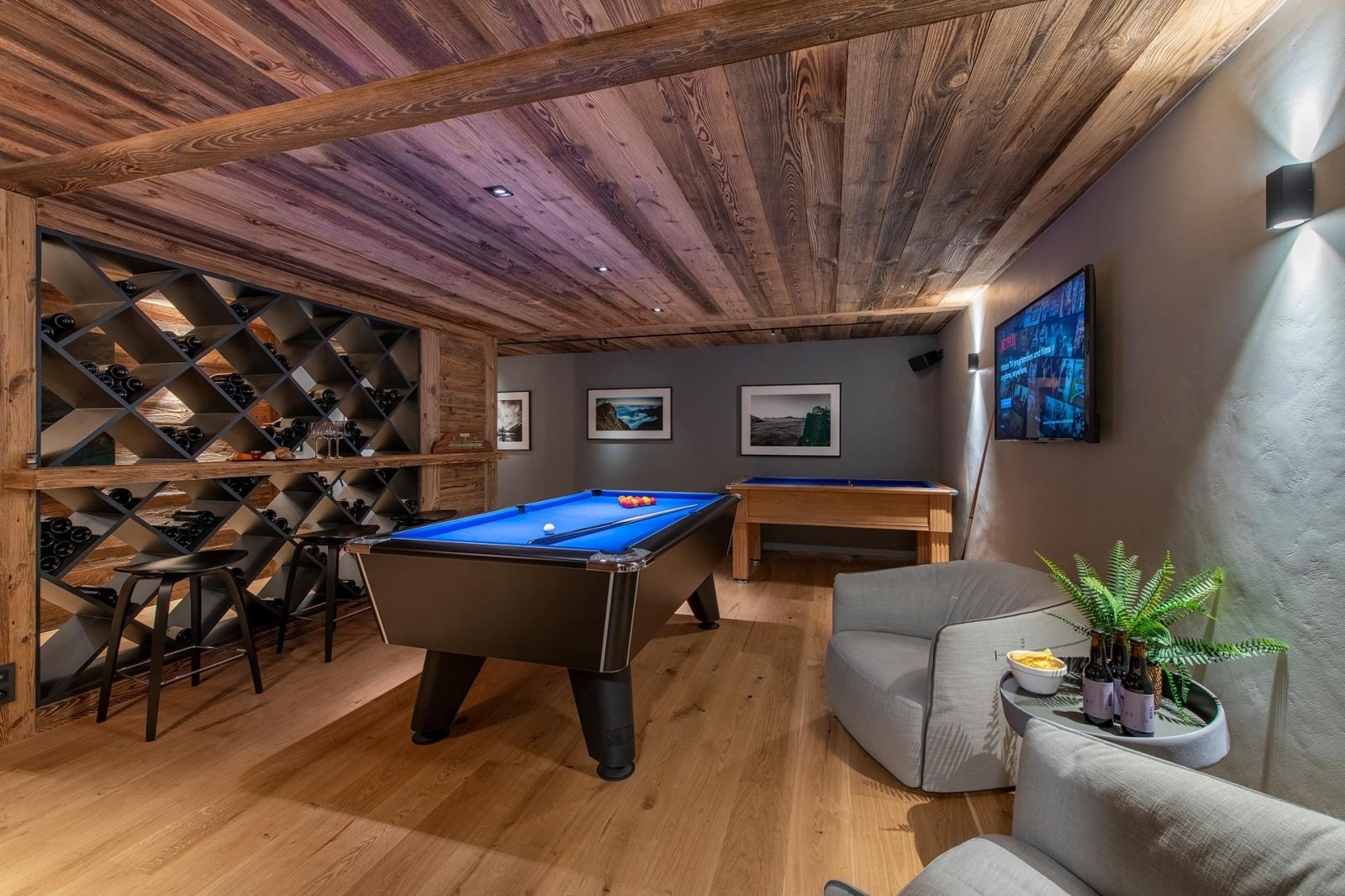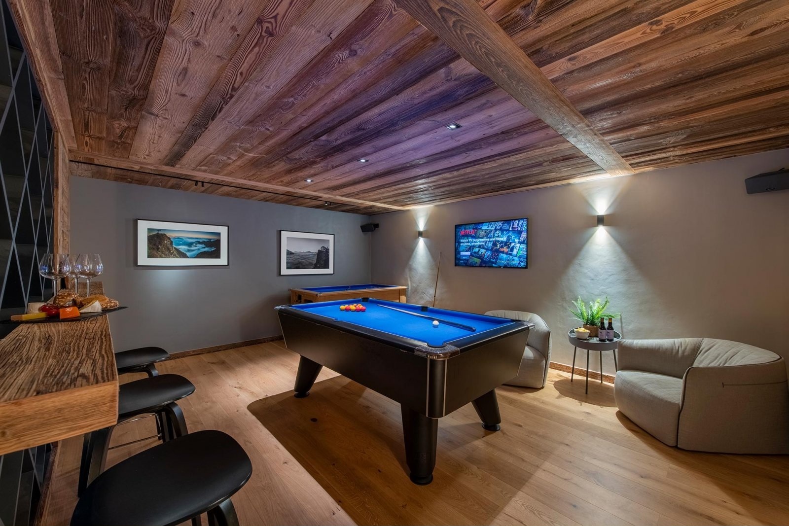 The specification list is, of course, almost endless, but it is what’s not said that speaks volumes. Like that feeling when you walk down the 15m tunnel that runs directly from the private double garage into the heart of the chalet; or the carefully designed boot room with pillar-box windows allowing you a glimpse of the mountains at all times. Then there’s the thoughtfully curated collection of art that you pass as you wander into the games room where you can play bar billiards or enjoy a quick game of pool; a cinema awaits for post-piste film nights or that mid-week afternoon off the slopes.