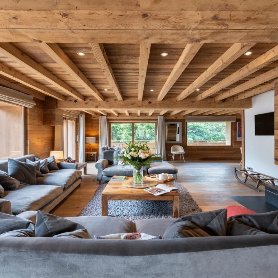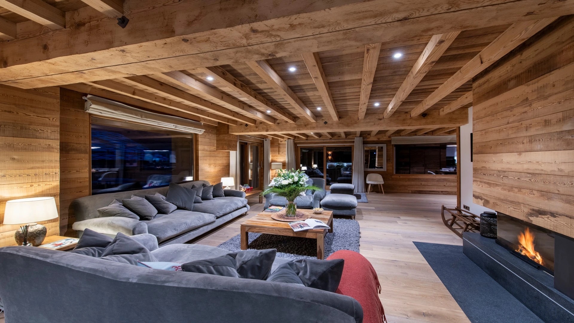 Spanning 420 square meters, the luxury chalet greets guests with a refined and sophisticated ambiance in the open-plan living area on the first floor. Stylish decor and rich wood tones, complemented by luxurious furnishings, create an inviting space where guests can immerse themselves in the elegant alpine atmosphere. Large windows and a spacious south- and west-facing balcony bathe the area in natural light, offering stunning views of the surrounding mountains.