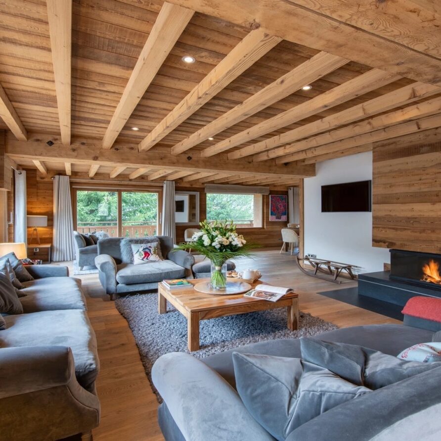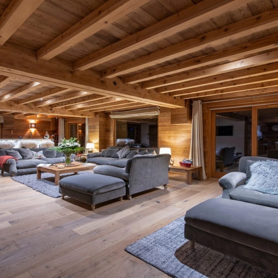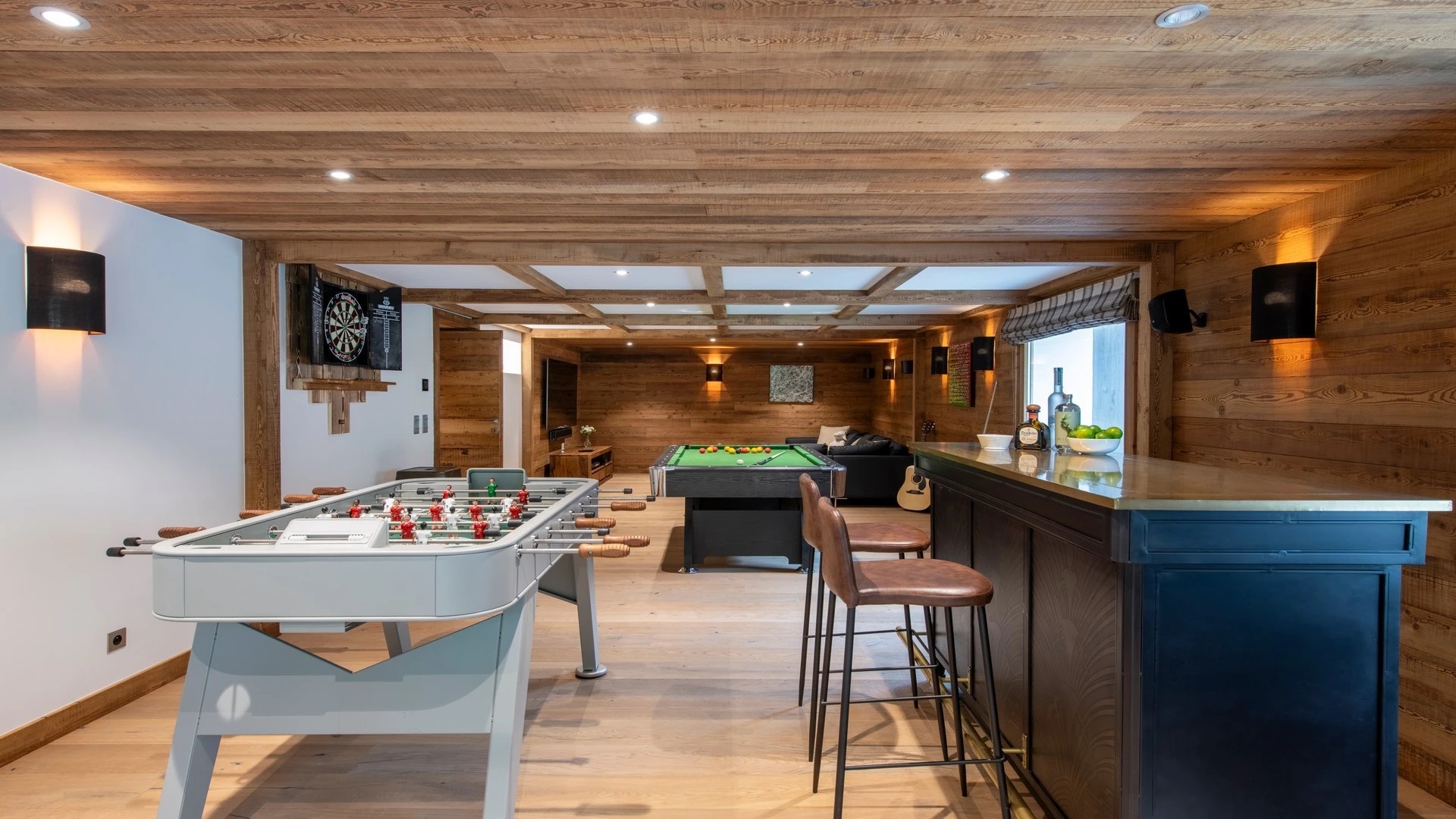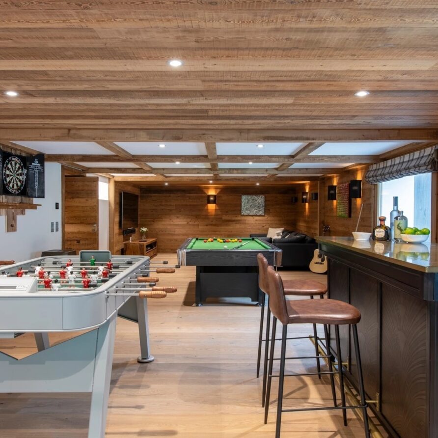 Generously arranged sofas, perfectly positioned around the fireplace, provide the ideal spot to enjoy an afternoon snack or a glass of champagne after a day on the slopes. The wooden ceiling further enhances the chalet’s alpine charm, while the well-appointed bar offers another cozy corner to relax with a drink. For those seeking a bit more excitement, the games room is sure to entertain. Equipped with a pool table, Foosball table, and a cozy TV area, it provides endless fun for all ages. Whether you’re challenging someone to a friendly match or simply relaxing with a film, the games room is a vibrant social hub within the chalet.