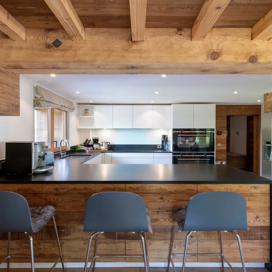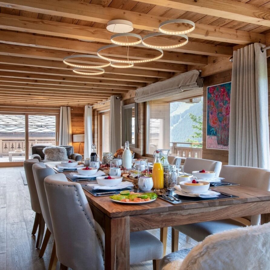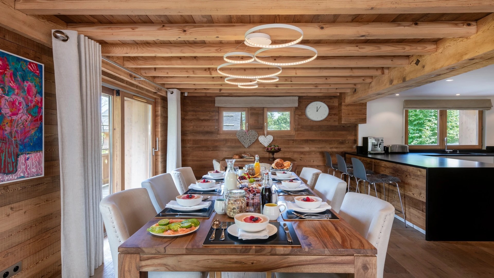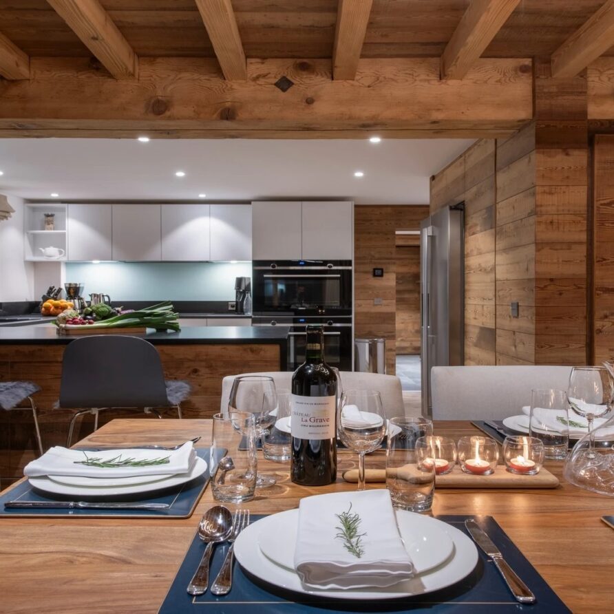 The fully equipped kitchen, complete with a bar, is perfect for enjoying a pre-dinner drink perched on the bar stools, as you watch the private chef expertly prepare your meals. The large dining table sets the scene for memorable gatherings, where delicious meals are shared and paired with fine wine. On warmer days, the adjoining balcony invites you to soak up the sun or enjoy a meal al fresco, surrounded by the beauty of the mountains.