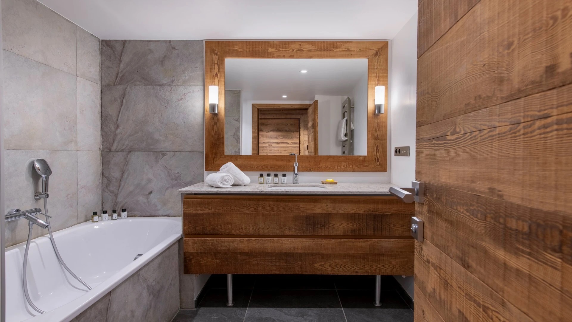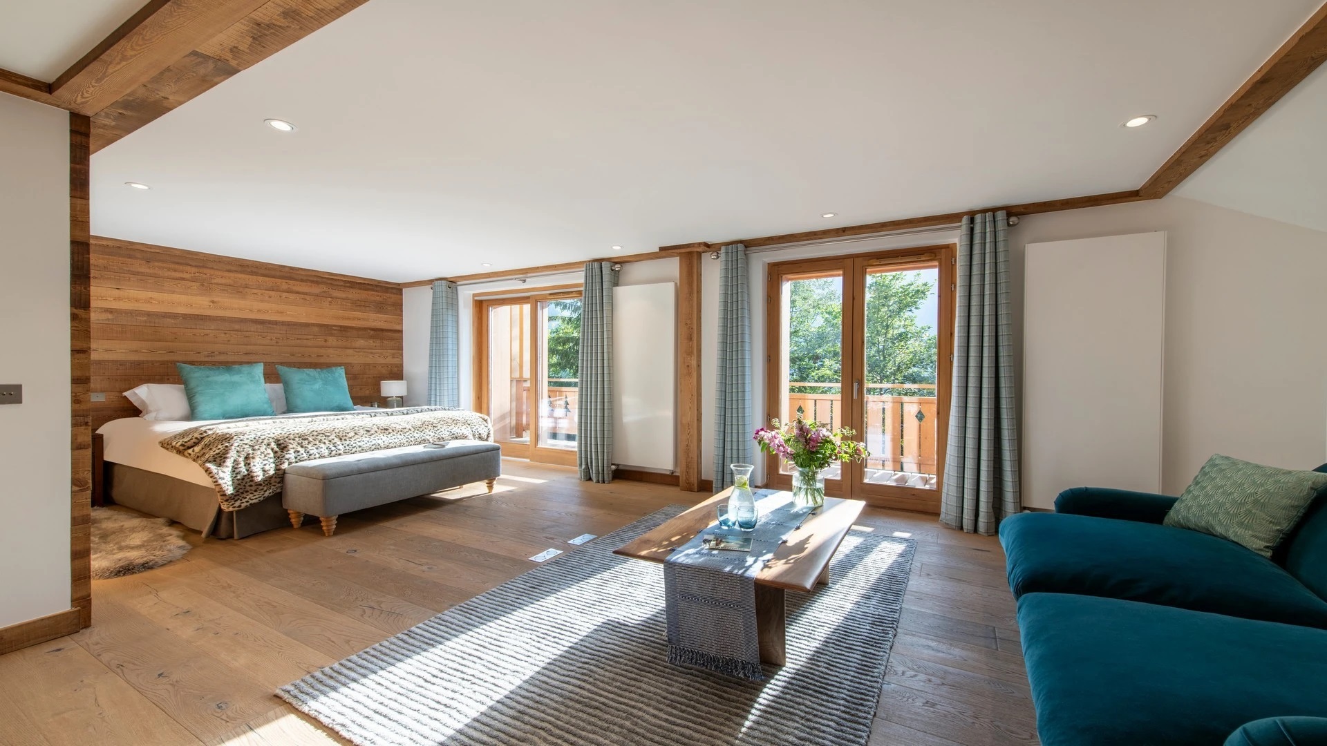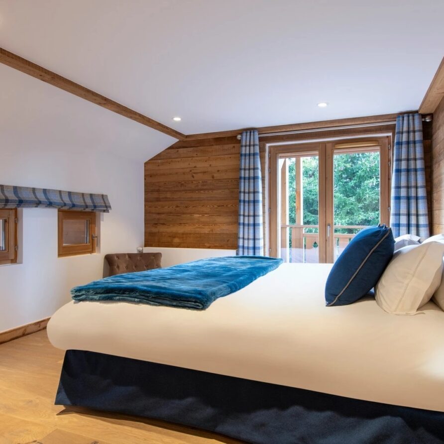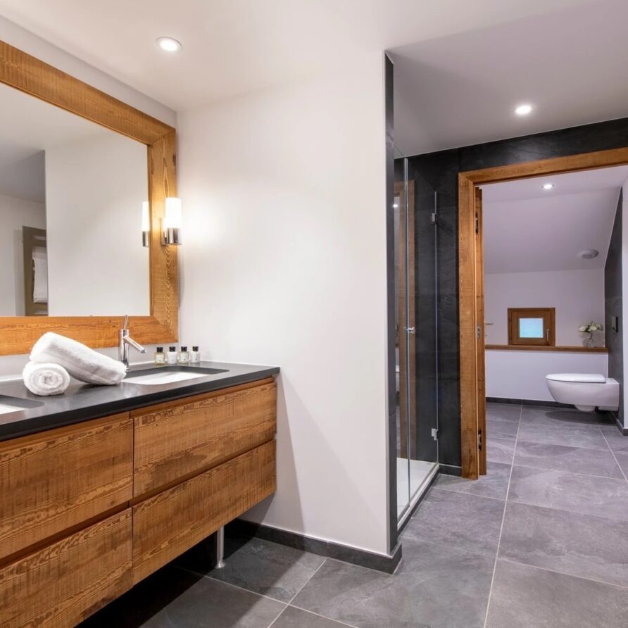 The bedrooms in the chalet are thoughtfully distributed across three floors, ensuring plenty of privacy and comfort for every guest. Each room is tastefully decorated with a stylish blend of modern elegance and alpine charm, offering all the amenities you need for a luxurious and relaxing holiday. On the top floor, you’ll find a lovely double/twin bedroom with its own private balcony. This room features a separate private bathroom with a shower and twin sinks, providing a peaceful retreat with beautiful views.