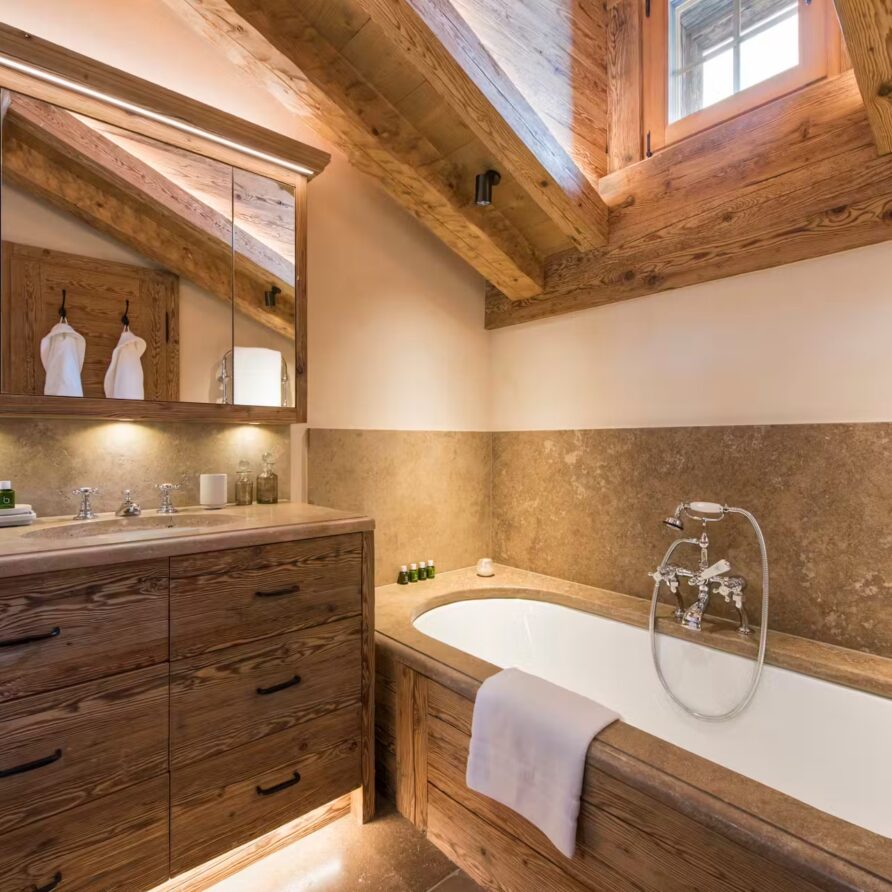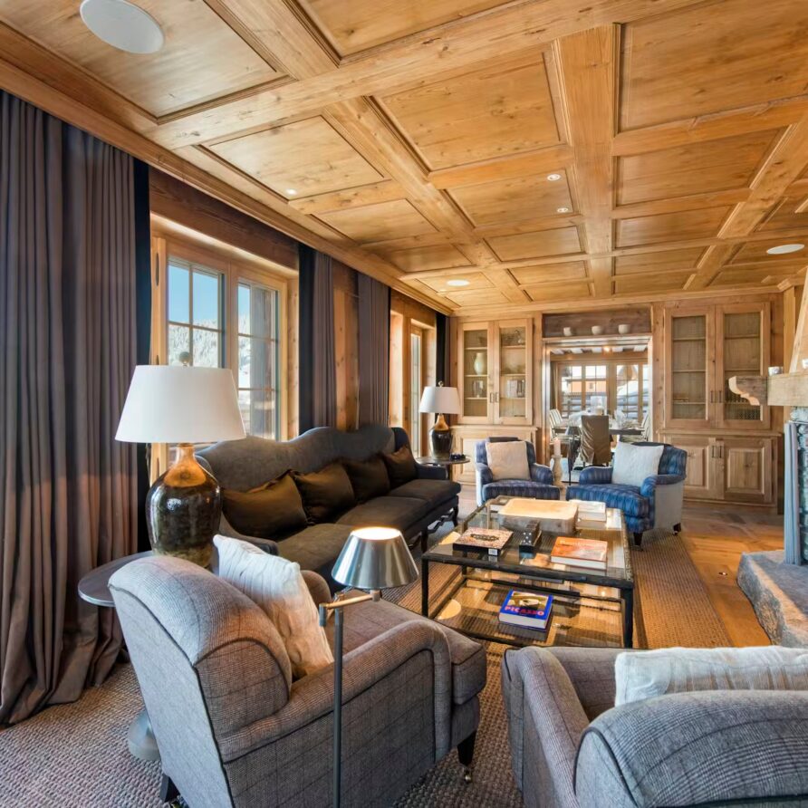 Found on the first floor of the chalet, you will find two cozy, elegant sitting rooms. Perhaps most reminiscent of a country manor house, with some more alpine features to one of them, these rooms provide ample comfortable, designer furniture to gather around the open stone fireplaces. A formal dining room offers a sophisticated space for gourmet dining. These living and dining spaces are surrounded by windows that offer picture postcard views towards the stunning mountain vistas. To further enjoy the incredible views, on warmer spring evenings or crisp bluebird days, head outside to the expansive sun terrace.
