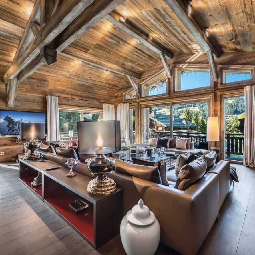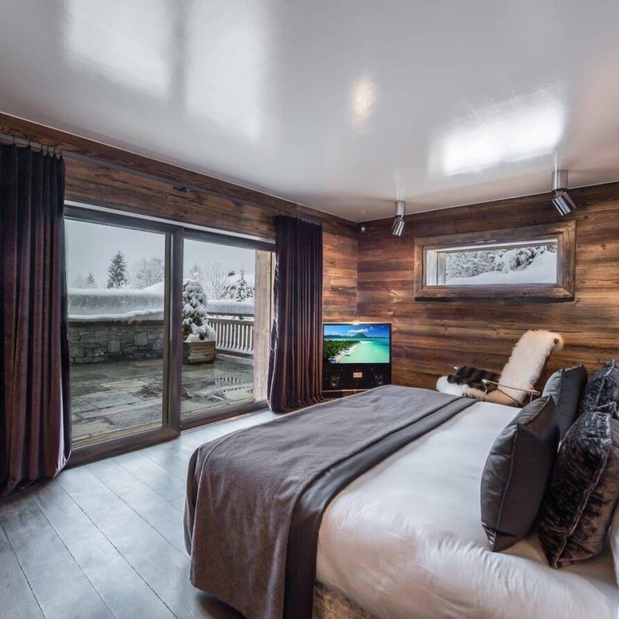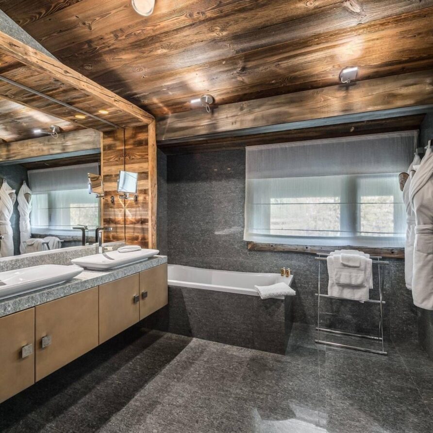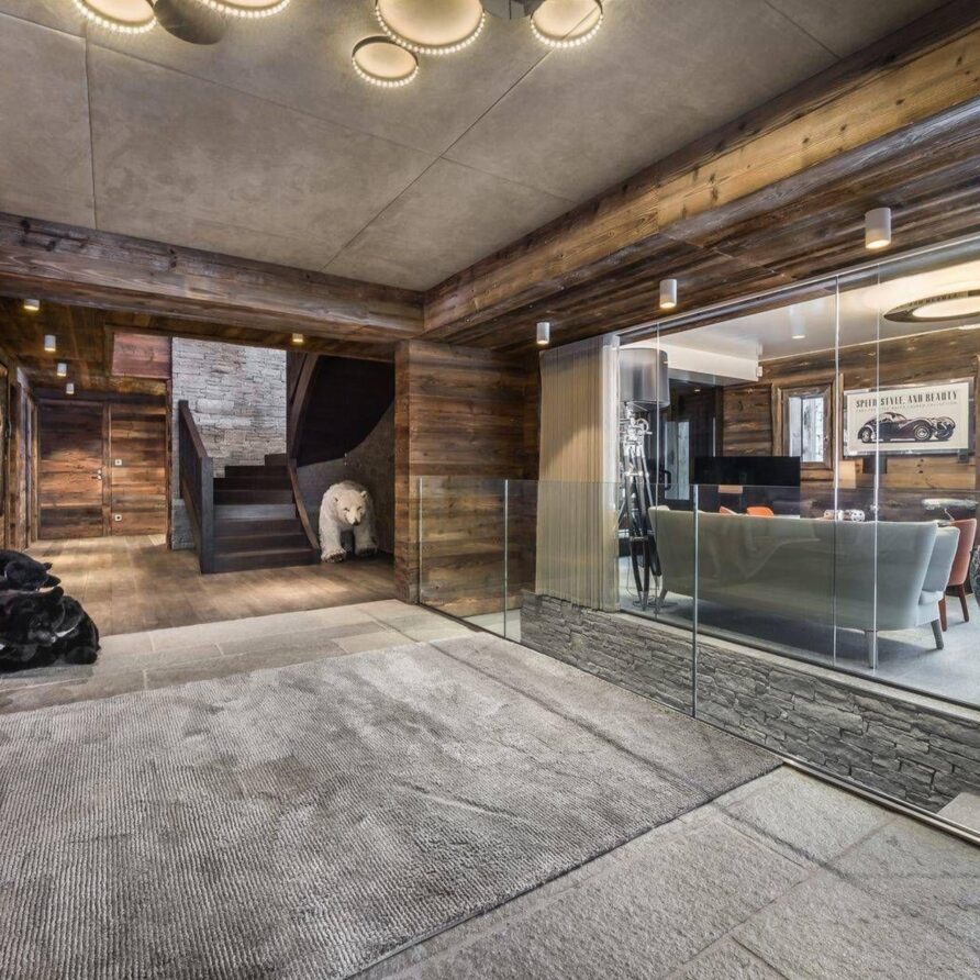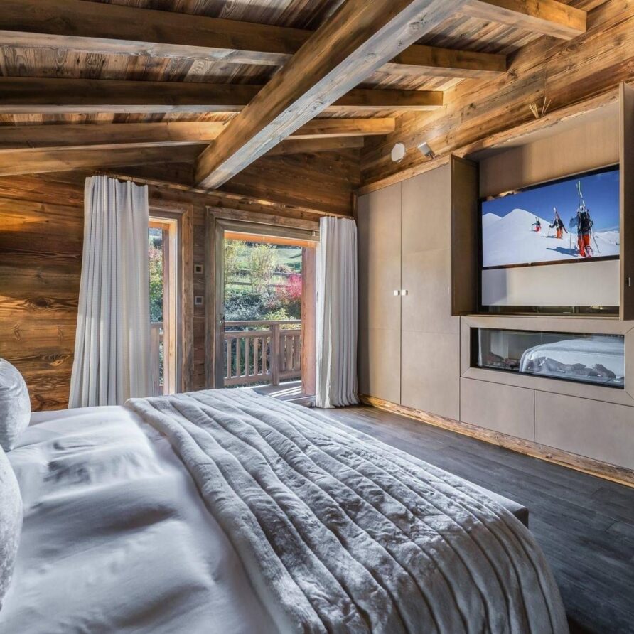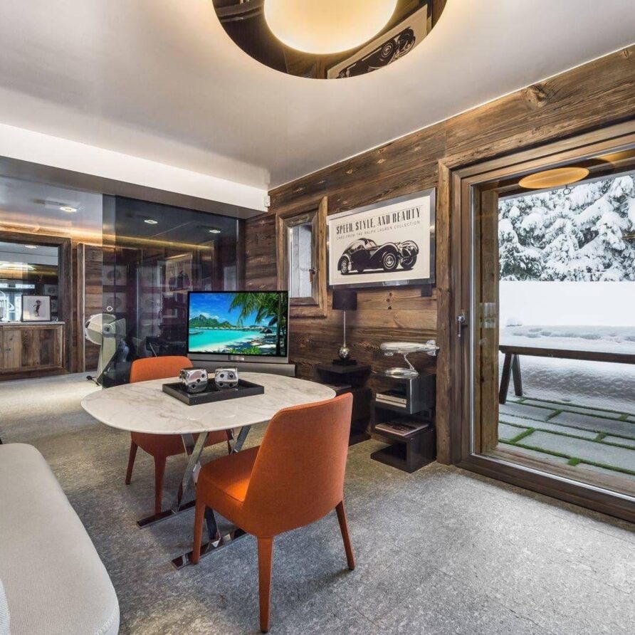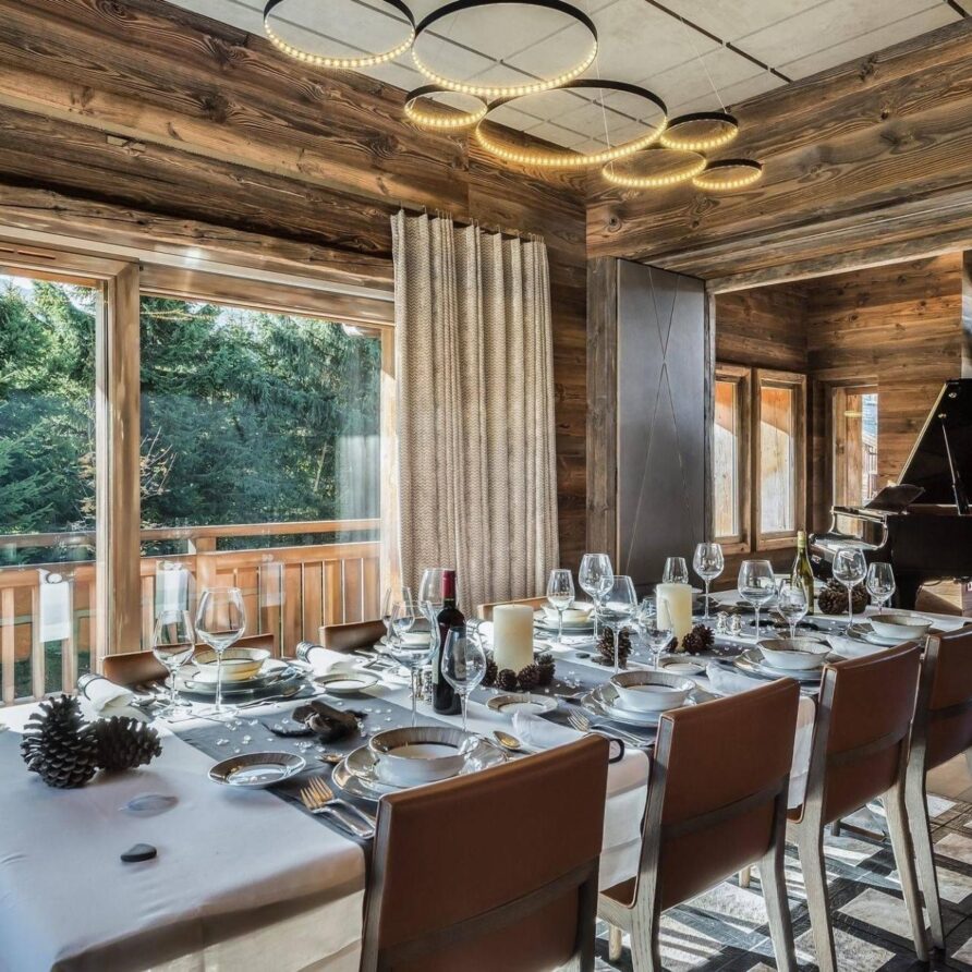 The chalet wonderfully blends traditional design and materials with modern style and futuristic facilities. The main living and dining area is huge and hugely impressive and design excellence. A concert grand piano catches the eye first, before comfortable seating, a wood-burning fire and a big, big dining table draw you in to a space that just invites you to relax. Super-high ceilings make the most of the light that floods in through huge windows, opening out onto terraces with woodland and mountain views.