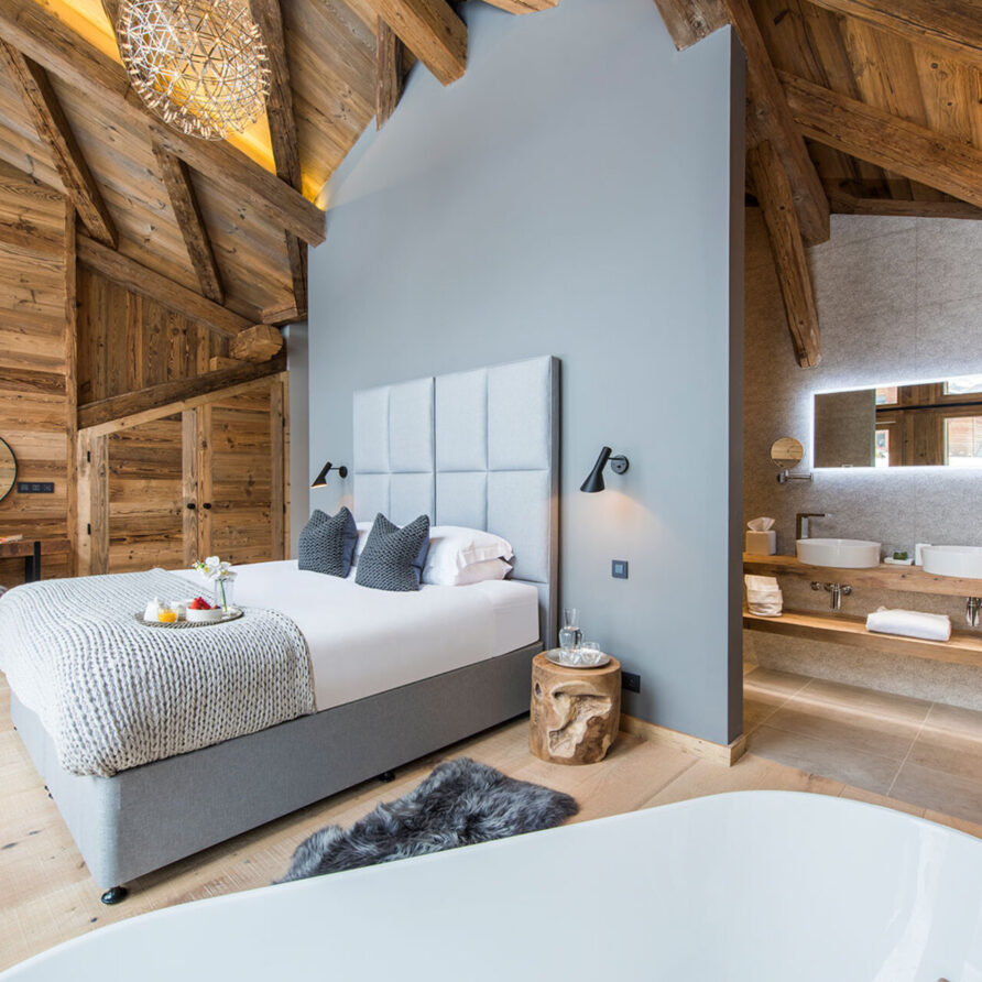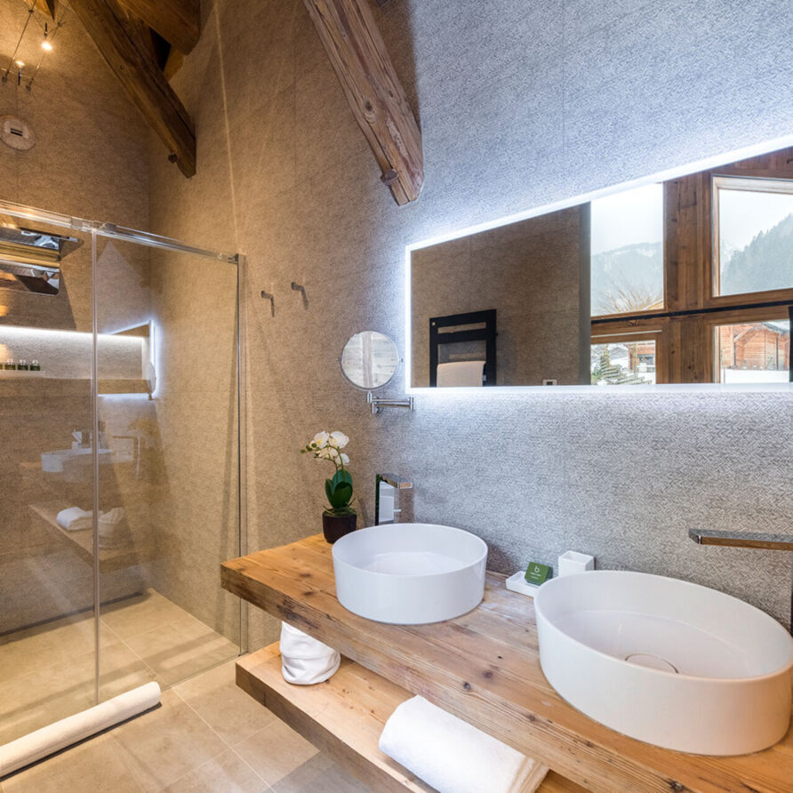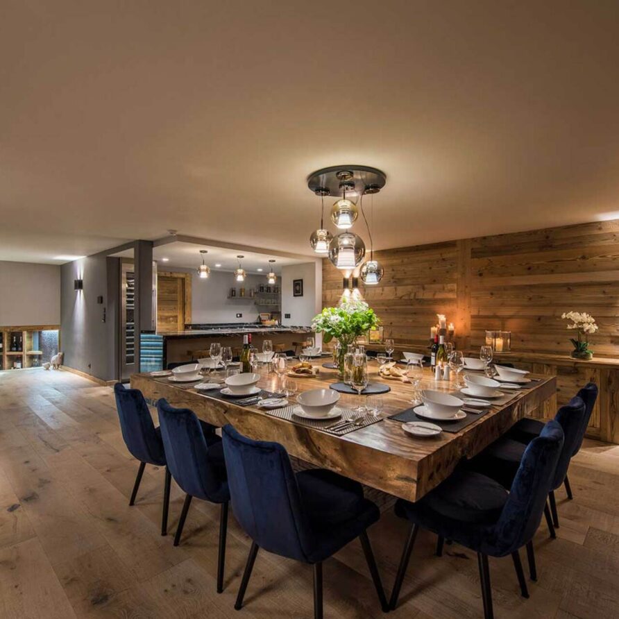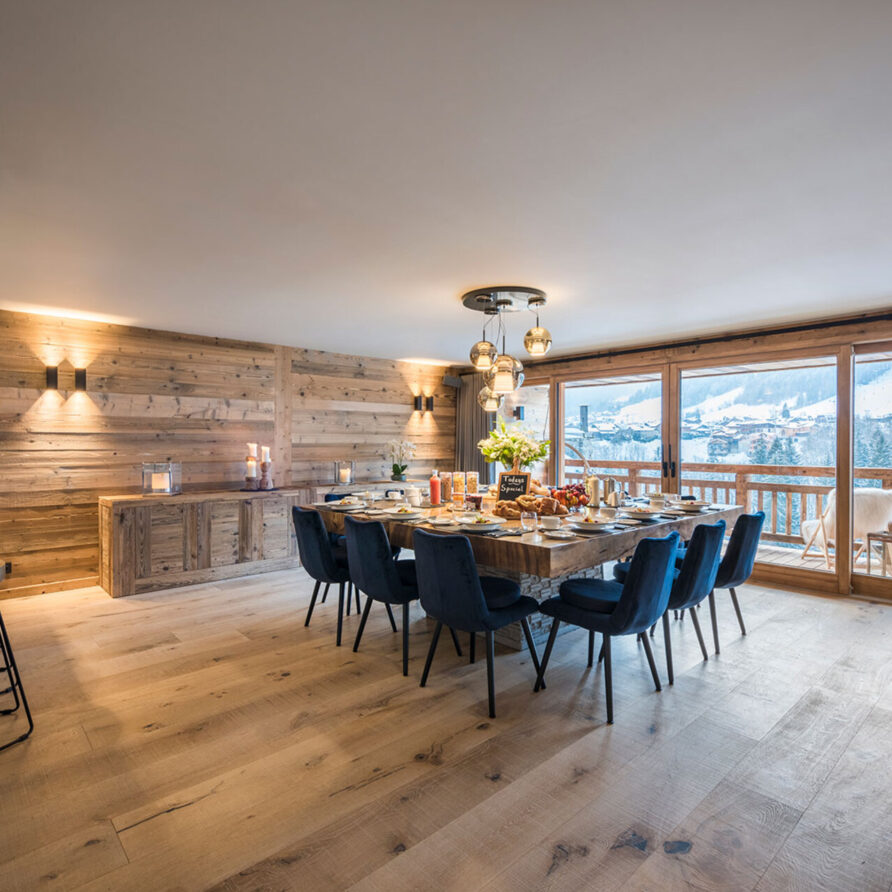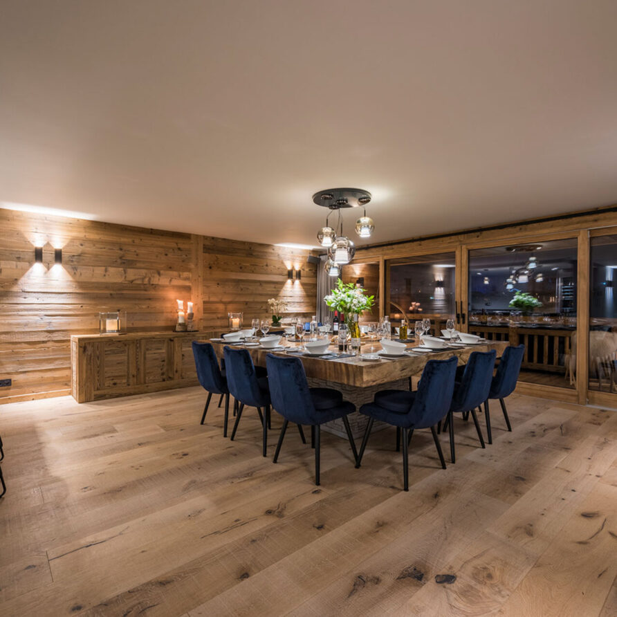The chalet with 520sqm can accommodate 10 guests in 5 bedrooms en-suite. The chalet offers a very chic and stylish alpine interior with fantastic views across to the mountains. To unwind after a day on the slopes the living area with fireplace is the perfect place. Adjacent to the main living area is the dining room, set around a large handmade Balinese teak table. An inset balcony frames yet another stunning view towards the mountains. There’s a professional closed kitchen for the ‘serious’ work, and an open show kitchen for service and chef demonstrations. From here your chef will serve stunning contemporary cuisine.