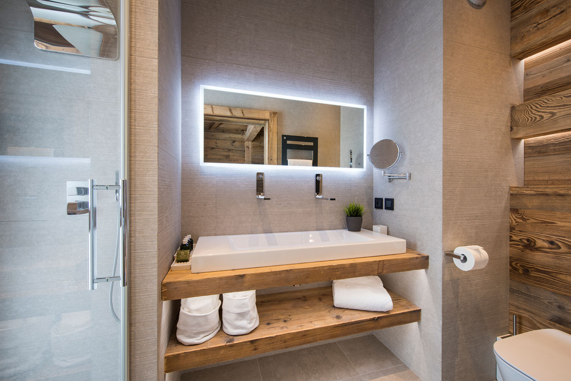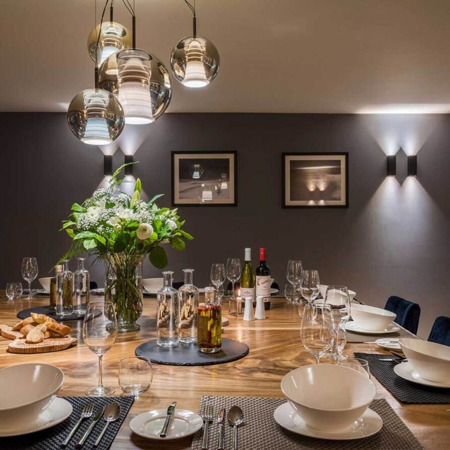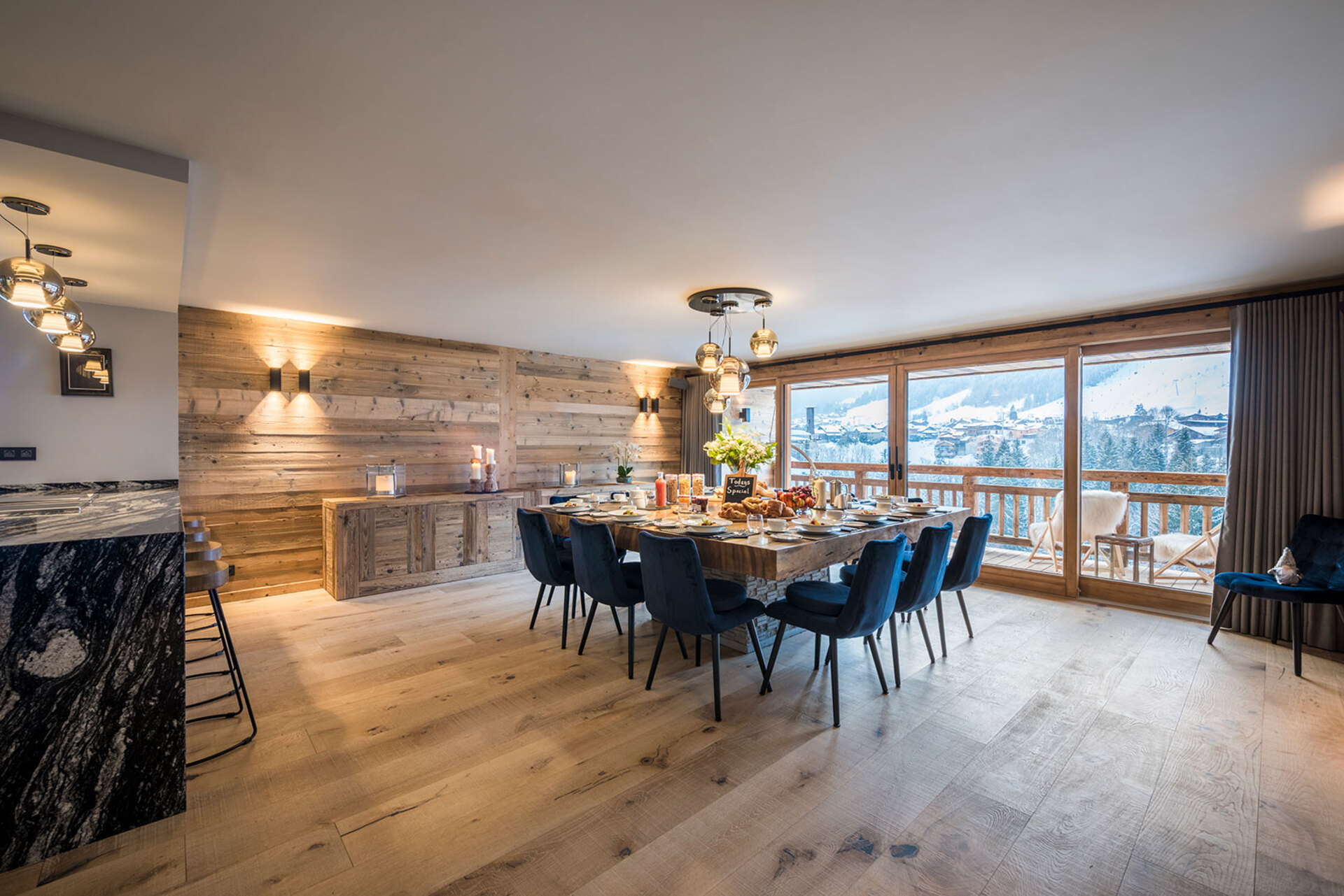The chalet with 520sqm can accommodate 10 guests in 5 bedrooms en-suite. The chalet offers a very chic and stylish alpine interior with fantastic views across to the mountains. To unwind after a day on the slopes the living area with fireplace is the perfect place. Adjacent to the main living area is the dining room, set around a large handmade Balinese teak table. An inset balcony frames yet another stunning view towards the mountains. There’s a professional closed kitchen for the ‘serious’ work, and an open show kitchen for service and chef demonstrations. From here your chef will serve stunning contemporary cuisine.